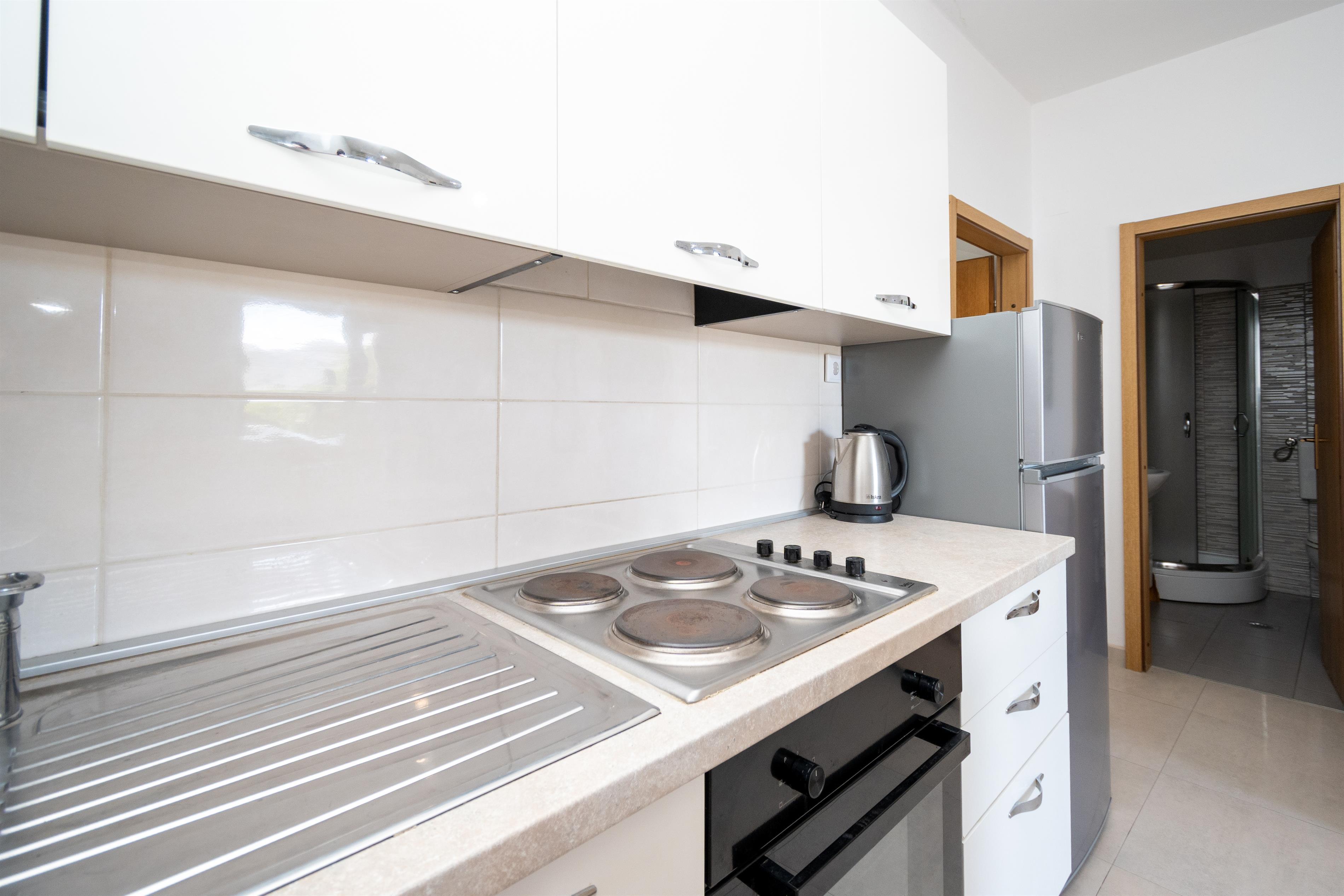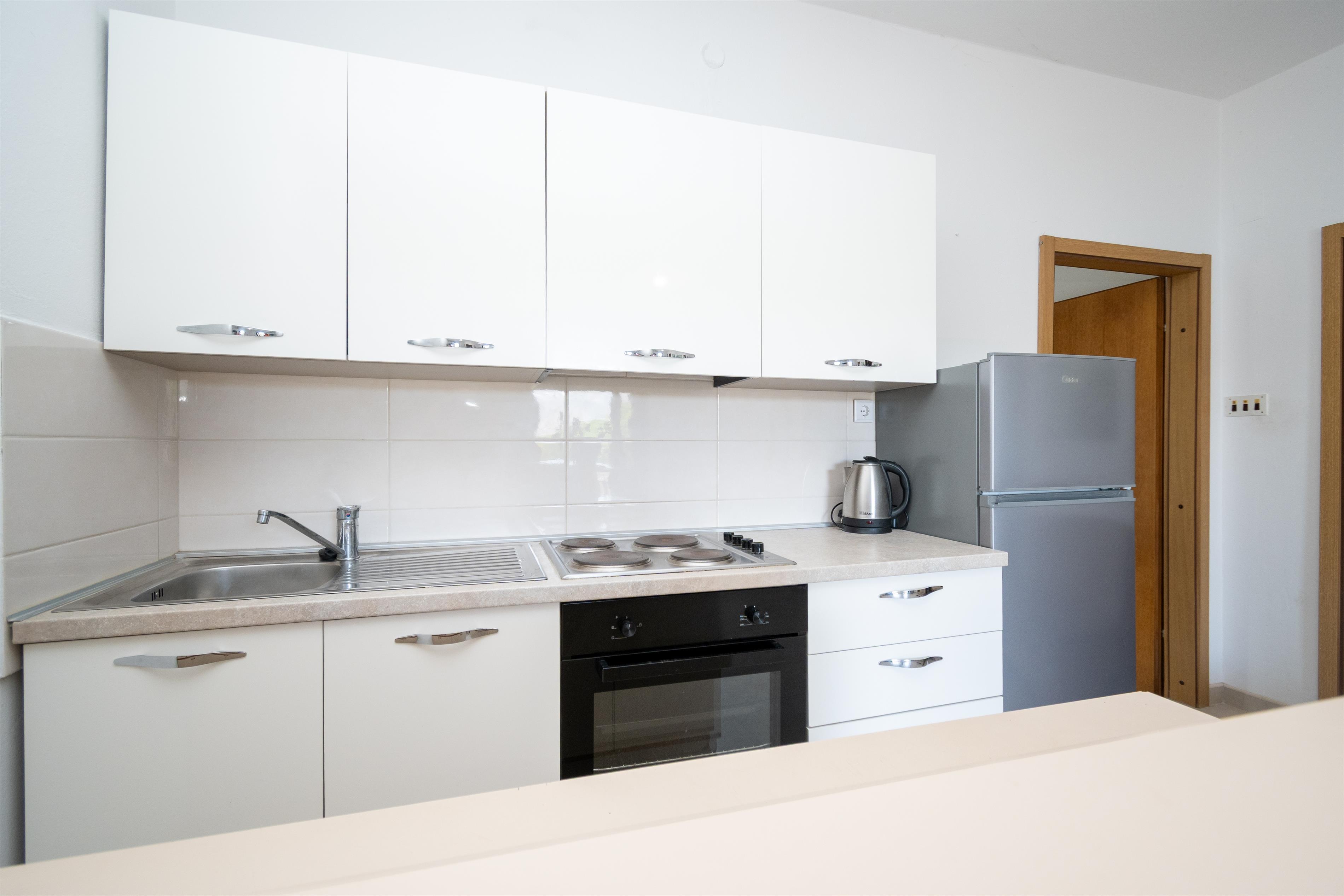 Kitchen (4 m2): Standard equipment: Refrigerator, Stove, Sink, Additional equipment: Combined refrigerator/freezer, Oven, On request: Water kettle