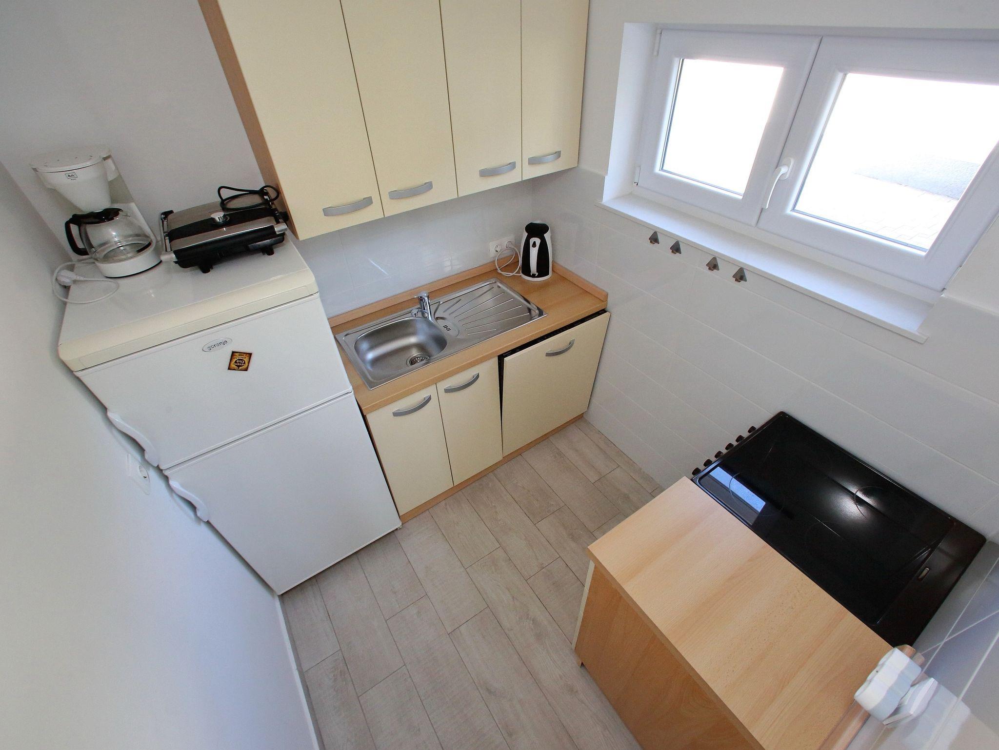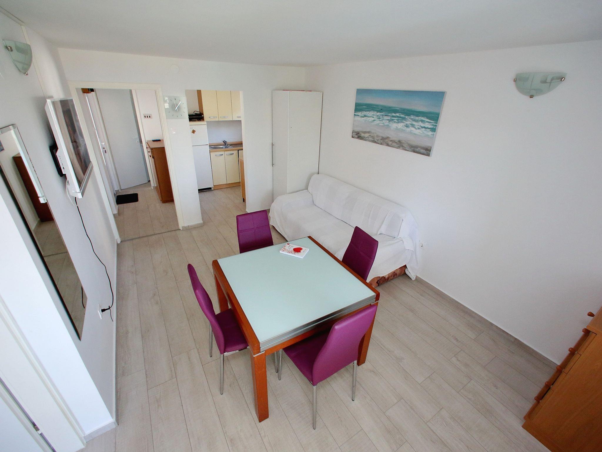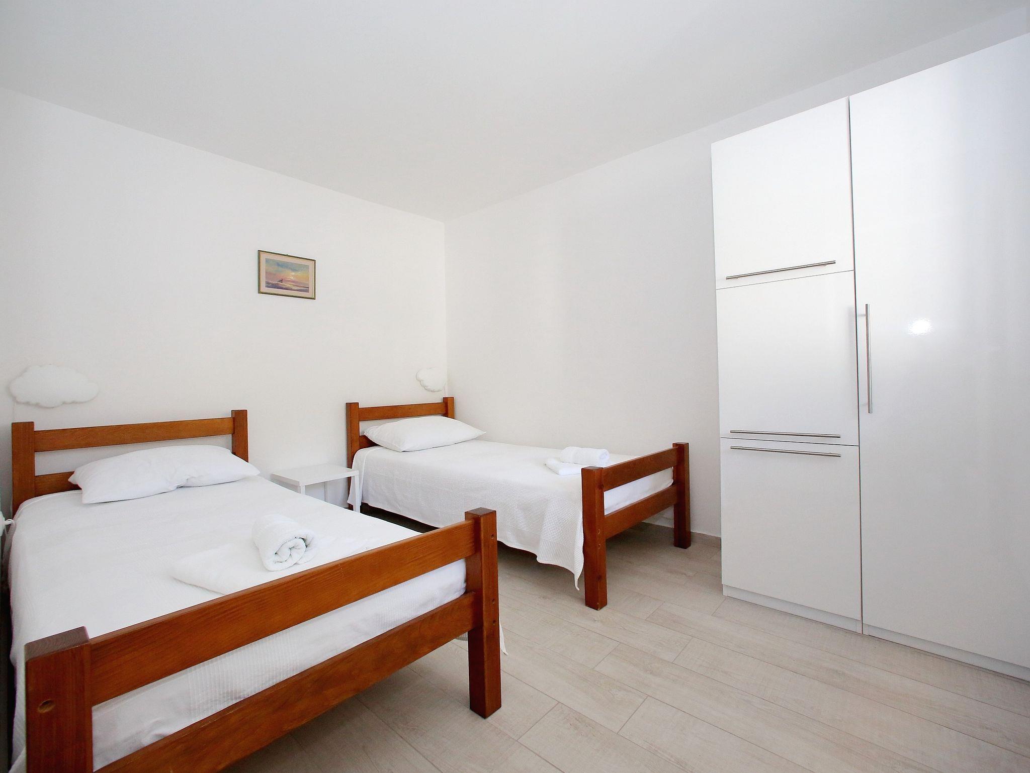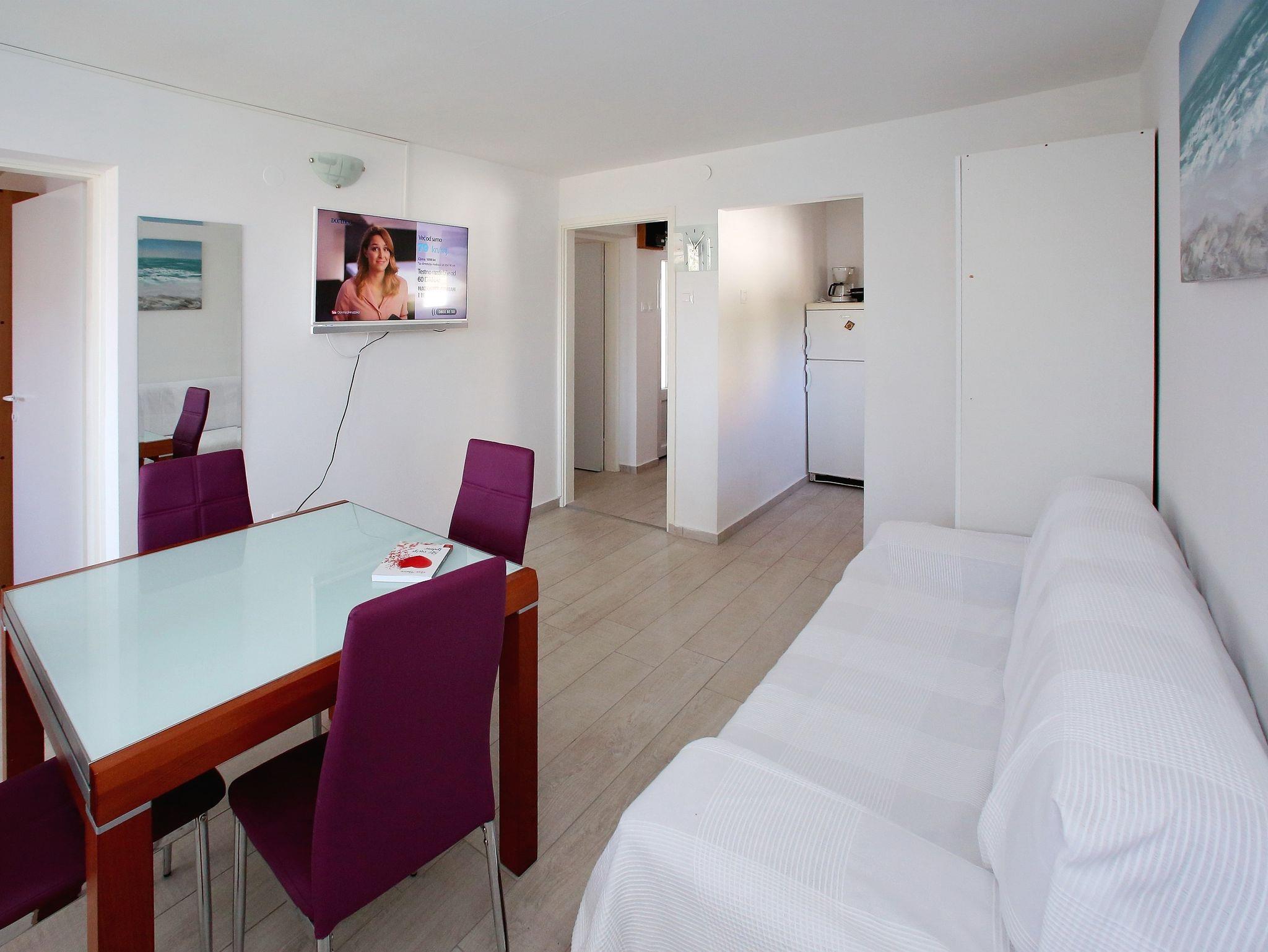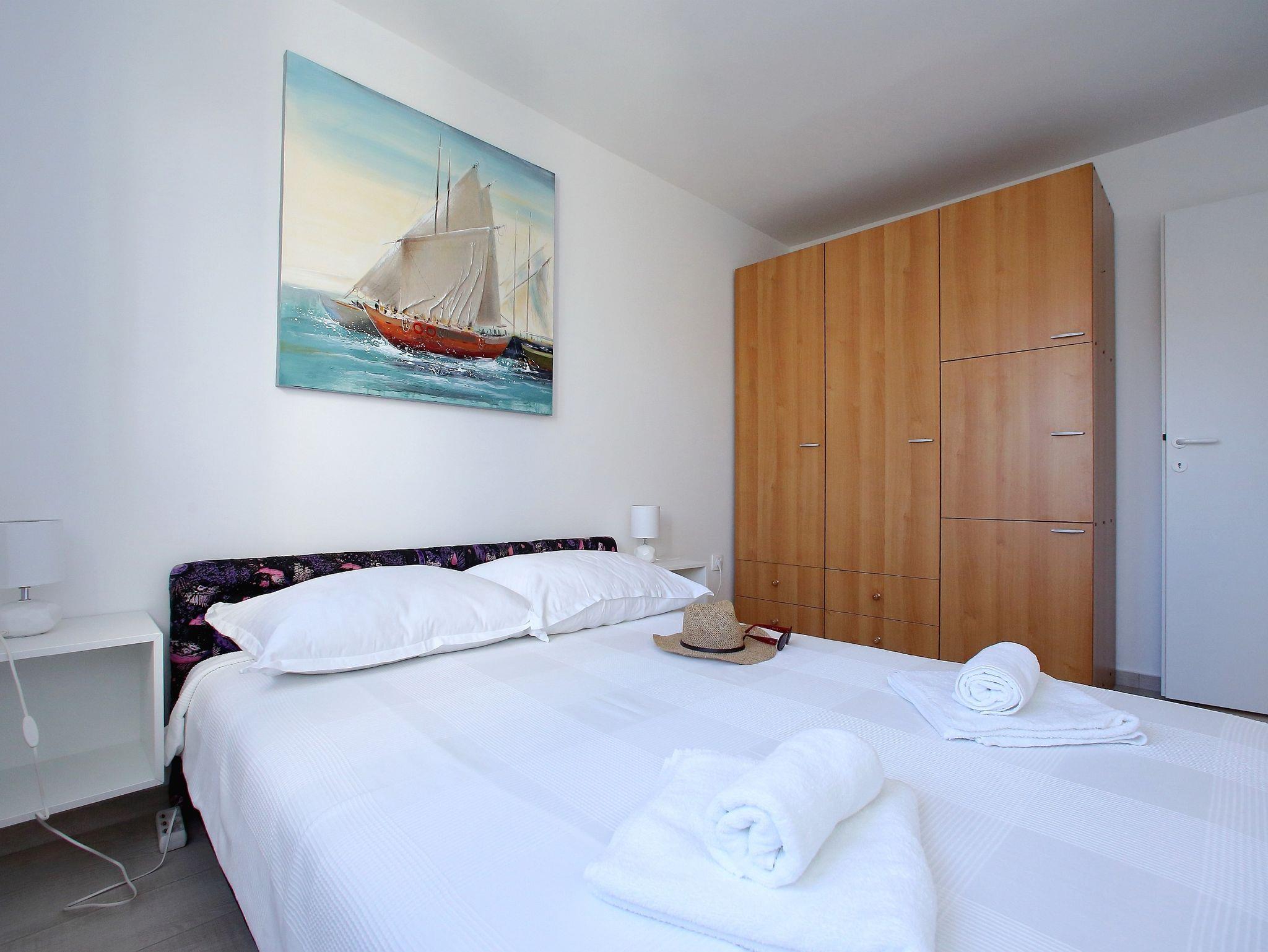 Ferienwohnung bietet Platz für 4 Gäste. Die Betten sind in Schlafzimmern, die es 2 gibt, innerhalb einer Gesamtfläche von 43m2, angeordnet. Die Gäste haben eine eigene Terrasse zur Verfügung, auf der sie in warmen Sommernächten genießen können. Das Apartment bietet Meerblick. Es ist erlaubt, Speisen auf dem Gemeinschafts-Grill vorzubereiten. IM PREIS INBEGRIFFEN: Kurtaxe, Endreinigung, Klimatisierung, Parkplatz, Internet, Bügeleisen, Bügelbrett, Föhn. VERBINDLICHE ZUSÄTZLICHE KOSTEN: Aufzahlung für Kurzaufenthalte (prozentualer Zuschlag pro Nächtigungsanzahl: 30% - 1, 20% - 2, 10% - 3). Die Verfügbarkeit zusätzlicher Dienstleistungen in Ihrem reservierten Termin und die Preise derselben (falls nicht aufgeführt) müssen im Voraus überprüft werden. Zusätzliche Dienstleistungen die in der Zahlungsaufforderung nicht aufgeführt sind werden direkt beim Vermieter bezahlt, angenommen der Gast nutzt auch diese. Ermäßigung auf den Grundpreis: Gratistag 14=13 (bei einem Aufenthalt von 14 Tagen oder mehr erhalten Sie einen Gratistag für den Aufenthalt bis 31.12.26).