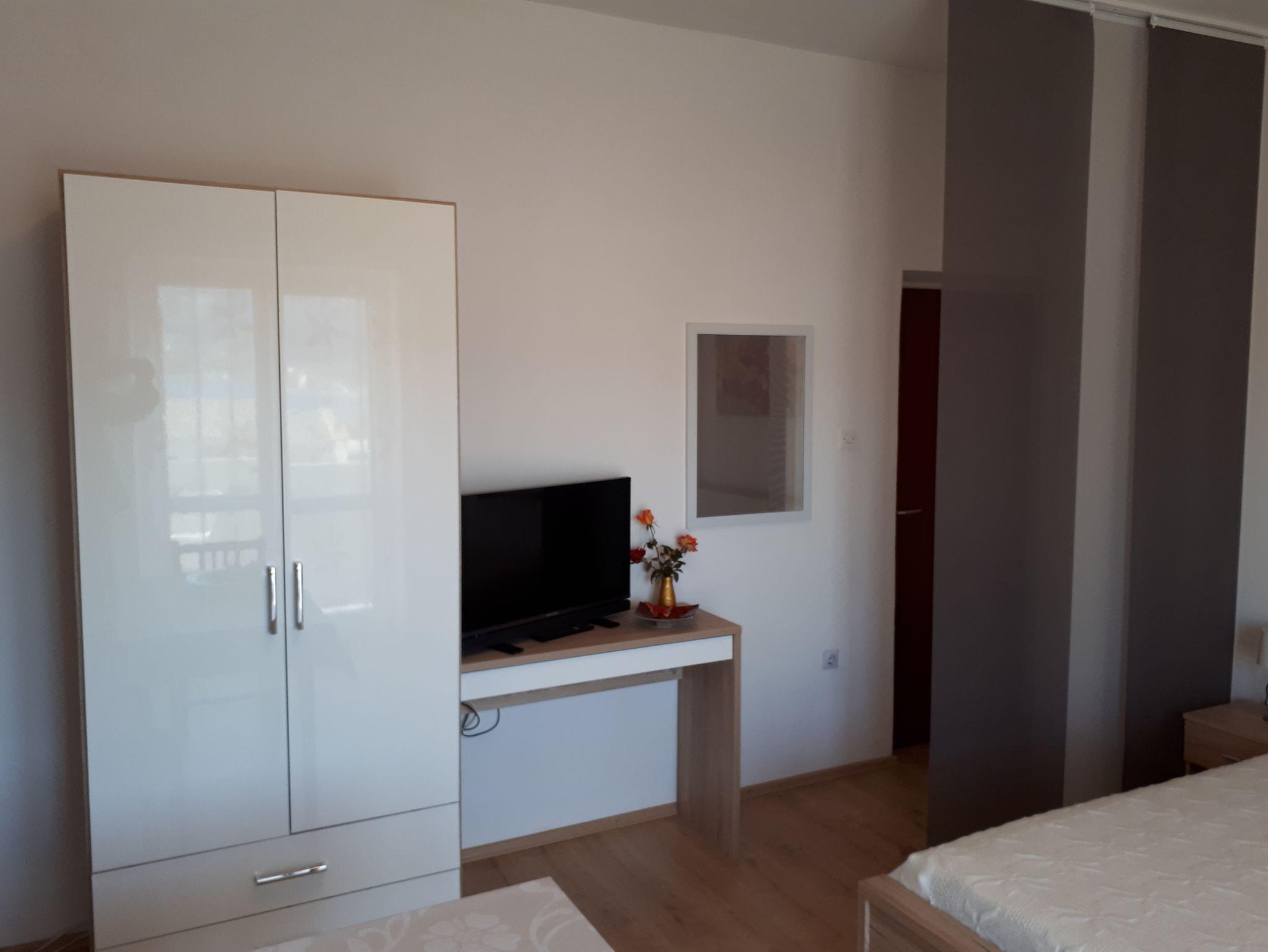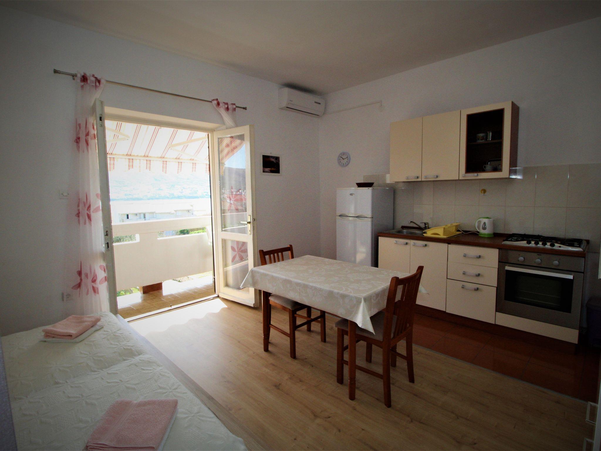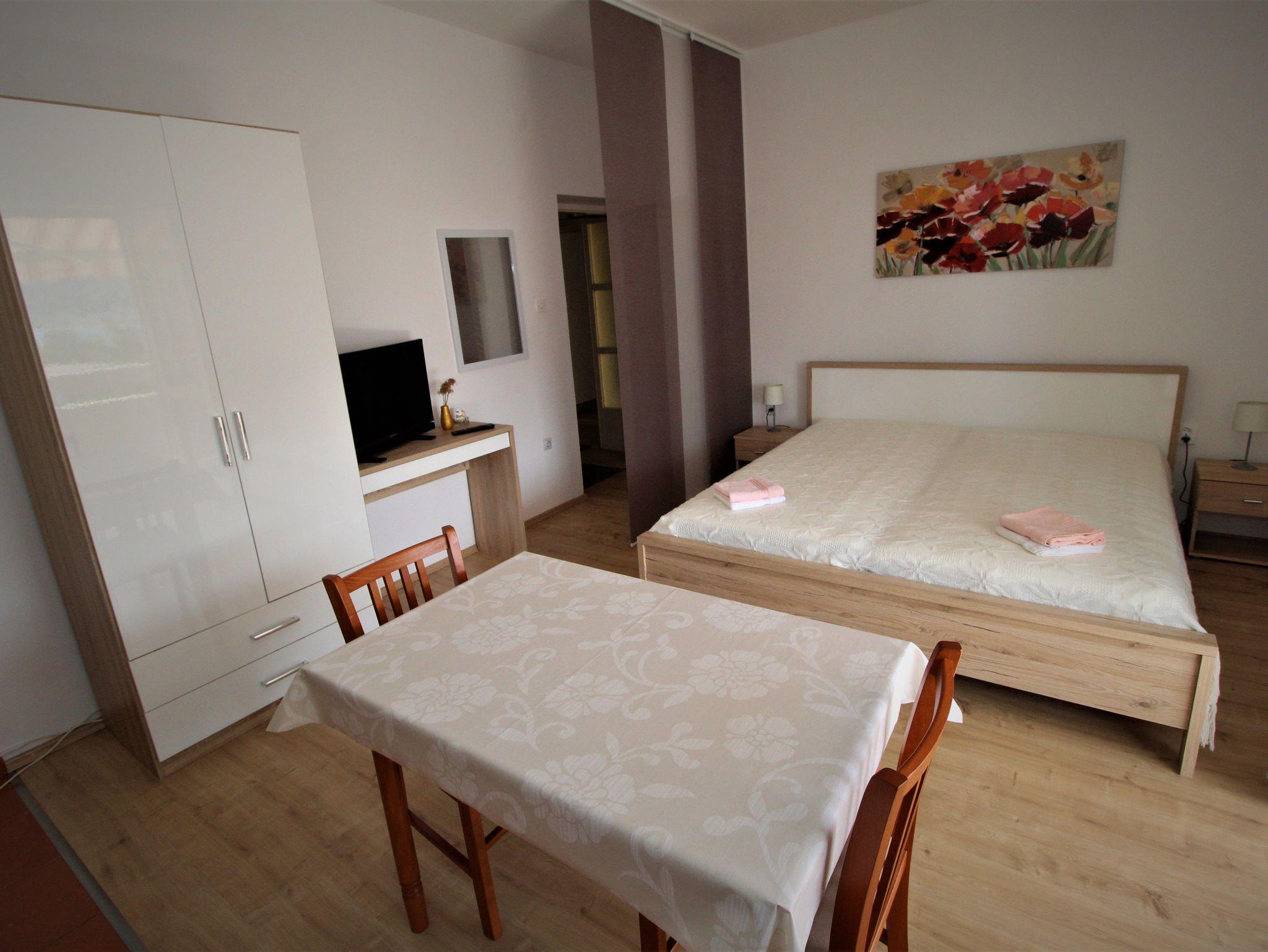 Studio bietet Platz für 2 Gäste. Die Betten sind in Schlafzimmern, die es 1 gibt, innerhalb einer Gesamtfläche von 16m2, angeordnet. Die Gäste haben einen eigenen Balkon zur Verfügung, auf der sie in warmen Sommernächten genießen können. Das Studio-Apartment bietet Meerblick. Es ist erlaubt, Speisen auf dem Gemeinschafts-Grill vorzubereiten. In der Unterkunftseinheit besteht die Möglichkeit des Mitbringens von Haustieren gegen Aufpreis. IM PREIS INBEGRIFFEN: Kurtaxe, Endreinigung, Parkplatz, Internet, Kinderbett. VERBINDLICHE ZUSÄTZLICHE KOSTEN: Aufzahlung für Kurzaufenthalte (prozentualer Zuschlag pro Nächtigungsanzahl: 30% - 1, 20% - 2, 10% - 3). UNVERBINDLICHE ZUSÄTZLICHE KOSTEN: Klimatisierung (7,00 € pro Nacht), Wäschewaschen (5,00 € Waschen), Haustiere (5,00 € pro Nacht). Die Verfügbarkeit zusätzlicher Dienstleistungen in Ihrem reservierten Termin und die Preise derselben (falls nicht aufgeführt) müssen im Voraus überprüft werden. Zusätzliche Dienstleistungen die in der Zahlungsaufforderung nicht aufgeführt sind werden direkt beim Vermieter bezahlt, angenommen der Gast nutzt auch diese.