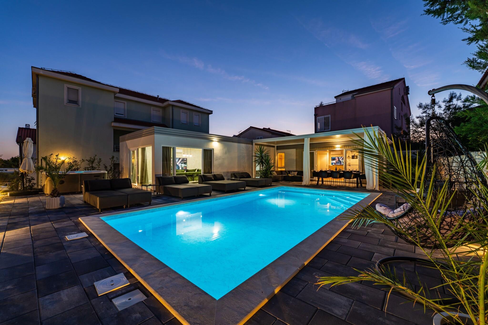 Tucked away in the charming seaside town of Pakoštane, this modern coastal retreat offers a perfect blend of comfort, style, and tranquility. Designed for up to six guests, it features three beautifully furnished bedrooms, two elegant bathrooms, and an additional guest WC. The open-plan living space flows effortlessly into a fully equipped kitchen and a bright dining area, creating an inviting atmosphere for family gatherings or evenings with friends. Step outside and unwind by the private swimming pool or soak in the relaxing jacuzzi, surrounded by a sun-drenched terrace and Mediterranean greenery. The outdoor area is made for slow mornings and golden sunsets — from poolside loungers and parasols to a covered dining terrace with a barbecue for alfresco meals under the stars. Thoughtful touches throughout the home, including air conditioning, high-speed WiFi, a washing machine, dryer, and mosquito-protected windows, ensure your stay is as comfortable as it is carefree. This accommodation maintains a calm and fresh environment — it is strictly non-smoking and pets are not allowed, ensuring the space remains serene and pristine for every guest. Just a ten-minute stroll takes you to the nearest sandy beach, while cafés, local markets, and restaurants are all close by. For nature lovers, the breathtaking Vrana Lake Nature Park and charming coastal towns are only a short drive away. Whether you’re seeking peaceful relaxation by the pool or a stylish base for exploring the beauty of Dalmatia, this villa promises an unforgettable stay filled with sunshine, serenity, and the gentle rhythm of coastal life.