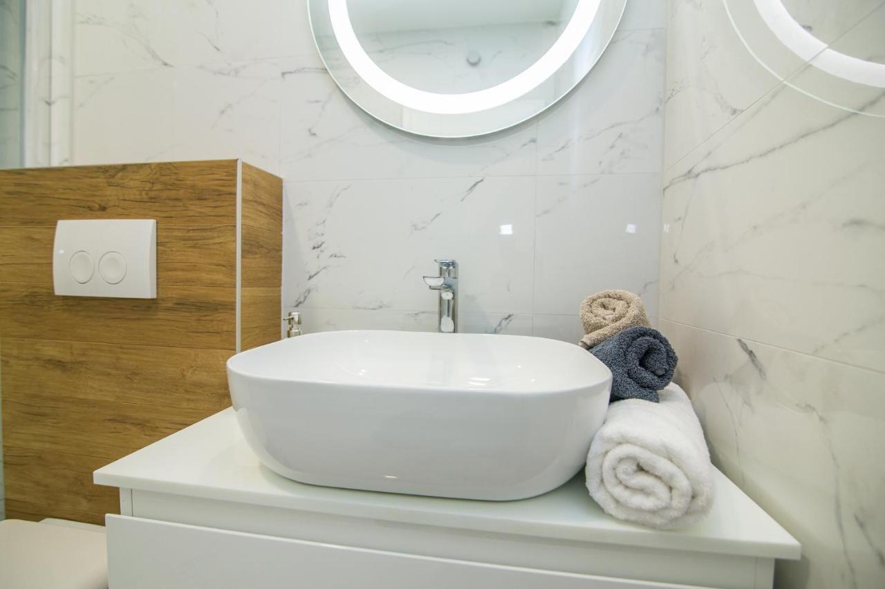 Das moderne Badezimmer ist mit einer Dusche mit Einstieg, einem Waschtisch und einem WC ausgestattet – alles, was Sie für einen angenehmen Aufenthalt benötigen.