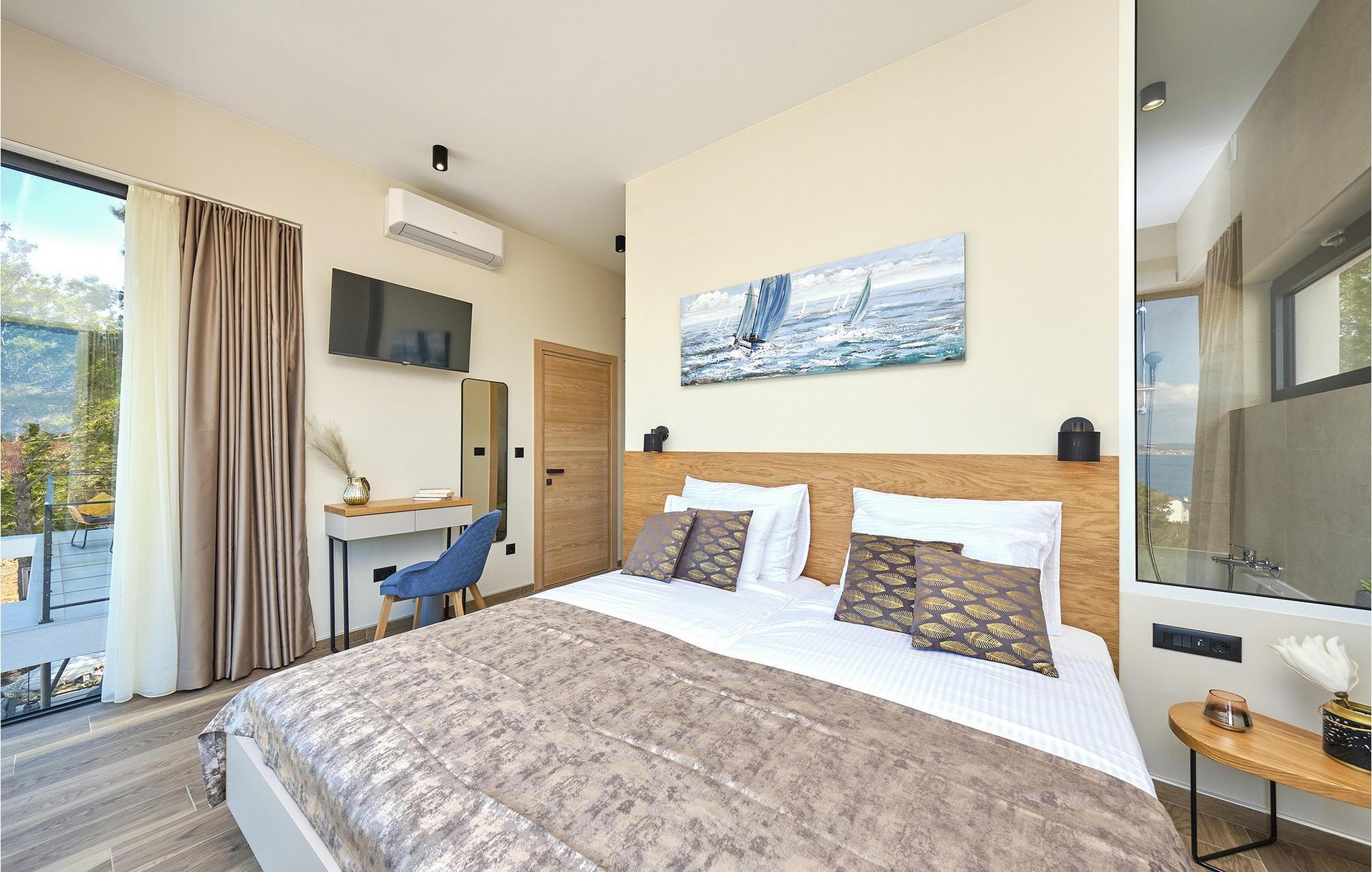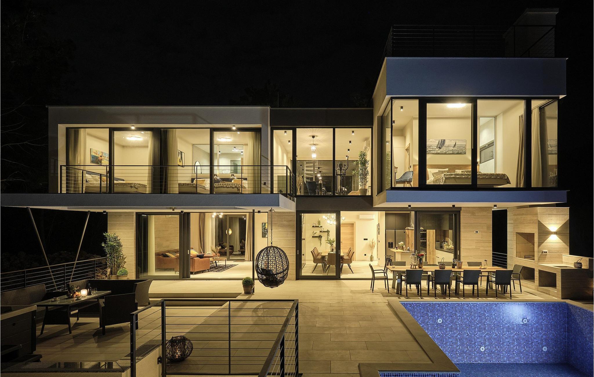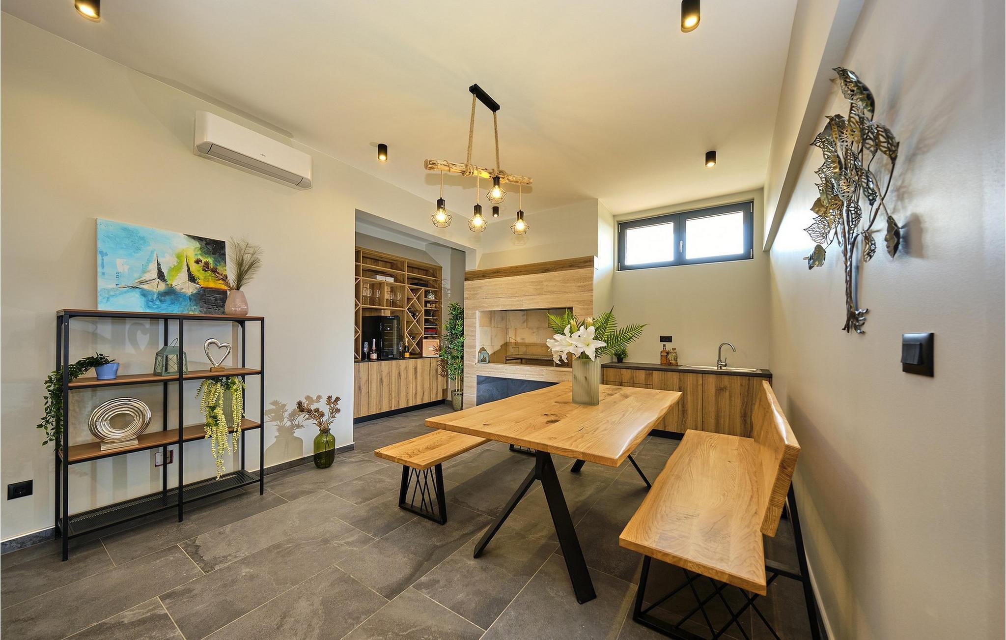 Die Luxusvilla Sunlight genießt eine privilegierte Hügellage in einem ruhigen Stadtteil von Ždrelac und liegt zugleich nur einen Spaziergang vom Meer entfernt. Erfreuen Sie sich beim Aufwachen am herrlichen Blick auf das glitzernde Meer, nutzen Sie den Fitnessraum für Ihr morgendliches Workout und zaubern Sie kulinarische Highlights in der modernen Küche. Lassen Sie das elegante und behagliche Ambiente bei stilvollen Mahlzeiten auf sich wirken und gönnen Sie sich wohlige Momente in der Sauna, während sich andere am Billardtisch, an der PlayStation oder am Kickertisch vergnügen. Das lichtdurchflutete Wohnzimmer mit seiner komfortablen Sofalandschaft verwandelt sich abends in eine gemütliche Wohlfühloase für anregende Gespräche, und die hauseigene Taverne sowie der rustikale Indoor-Grillbereich laden zum Plaudern bei einem guten Glas Wein ein.