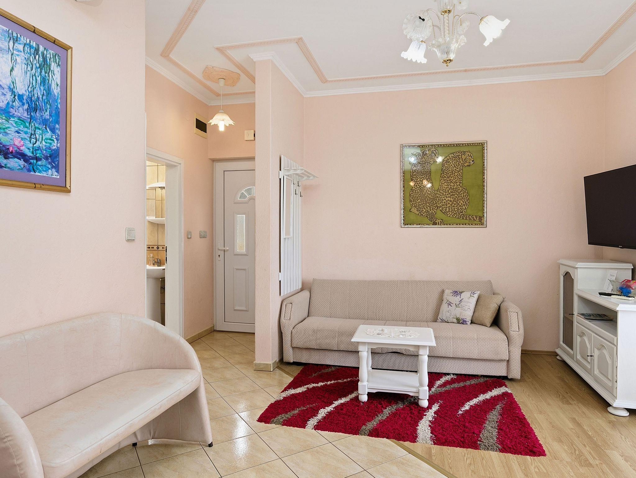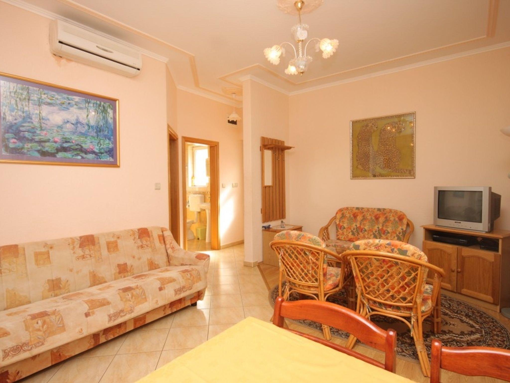 Ferienwohnung bietet Platz für 3 Gäste. Die Betten sind in Schlafzimmern, die es 1 gibt, und in Wohnzimmer, innerhalb einer Gesamtfläche von 35m2, angeordnet. Die Gäste haben eine eigene Terrasse zur Verfügung, auf der sie in warmen Sommernächten genießen können. Das Apartment bietet Meerblick. Es ist erlaubt, Speisen auf dem Gemeinschafts-Grill vorzubereiten. IM PREIS INBEGRIFFEN: Endreinigung, Klimatisierung, Parkplatz, Internet, Bügeleisen, Bügelbrett, Föhn, Liegestühle. VERBINDLICHE ZUSÄTZLICHE KOSTEN: Kurtaxe (Erwachsene 0,93 € - 1,50 € Nacht/Person, Kinderermäßigung 12 - 17 Jahre), Aufzahlung für Kurzaufenthalte (prozentualer Zuschlag pro Nächtigungsanzahl: 30% - 1, 20% - 2, 10% - 3). UNVERBINDLICHE ZUSÄTZLICHE KOSTEN: Zusatzbett (10,00 € pro Nacht). Die Verfügbarkeit zusätzlicher Dienstleistungen in Ihrem reservierten Termin und die Preise derselben (falls nicht aufgeführt) müssen im Voraus überprüft werden. Zusätzliche Dienstleistungen die in der Zahlungsaufforderung nicht aufgeführt sind werden direkt beim Vermieter bezahlt, angenommen der Gast nutzt auch diese.