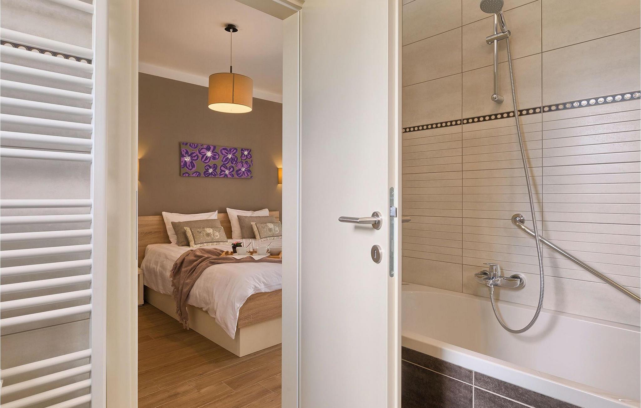 Eines der Schlafzimmer befindet sich im Erdgeschoss und bietet direkten Zugang zur Terrasse und zum Poolbereich. Die restlichen 2 Schlafzimmer befinden sich im 1. Stock, entlang einer Terrasse mit schöner Aussicht auf die umliegende Landschaft. Das Erdgeschoss beherbergt auch einen offenen hellen Wohn-Ess-Küchenbereich, als einen schönen Ort, um eine Mahlzeit mit Ihrer Familie und Freunden zu teilen. Der Indoor-Whirlpool, als zusätzliche Entspannungs-Ergänzung für Sie – befindet sich direkt neben dem Wohnbereich, nur mit Glaswänden umgeben. Diese können nach Lust und Laune nach außen geöffnet werden. Wenn Sie in Ihrer Urlaubszeit den Außenbereich bevorzugen, bietet die Terrasse mit wunderschöner Aussicht einen gemeinsamen Bereich mit einer Möglichkeit zum Essen im Freien und Grill für Ihren Gebrauch. Gleich nebenan können Sie am herrlichen Pool entspannen, ob Sie lieber schwimmen möchten oder nur sonnenbaden. Für Gäste, die während ihrer Ferien auf andere Arten von Unterhaltung Lust haben, bietet die Villa Mala Halu einen Billardtisch und Tischfußball als Entertainment an. Falls Sie lieber in der Natur aktiver sein möchten, bietet die Villa 4 Fahrräder (2 große, 2 kleine) an, die sie gerne benutzen können um die schöne Umgebung zu erkunden.