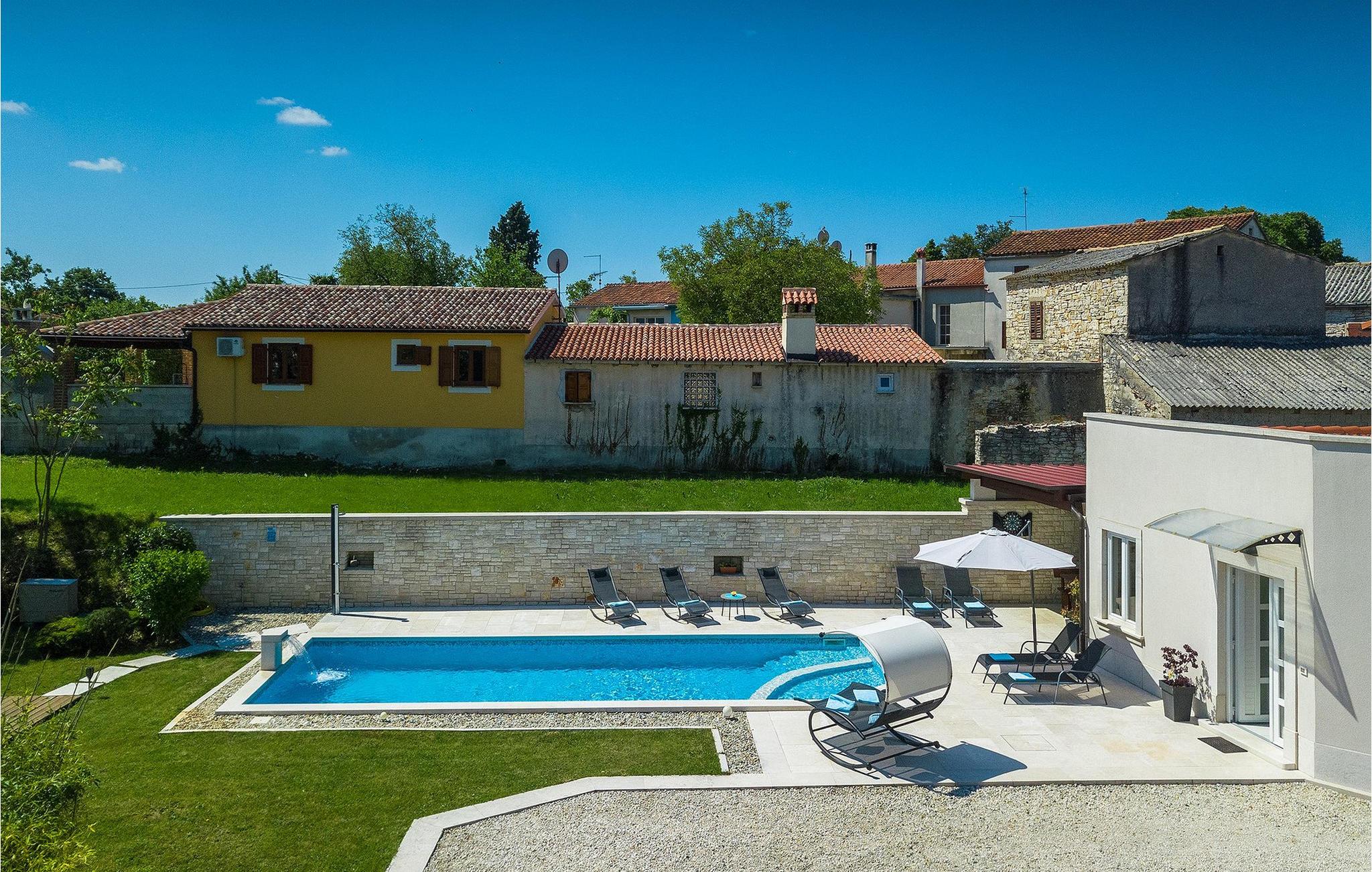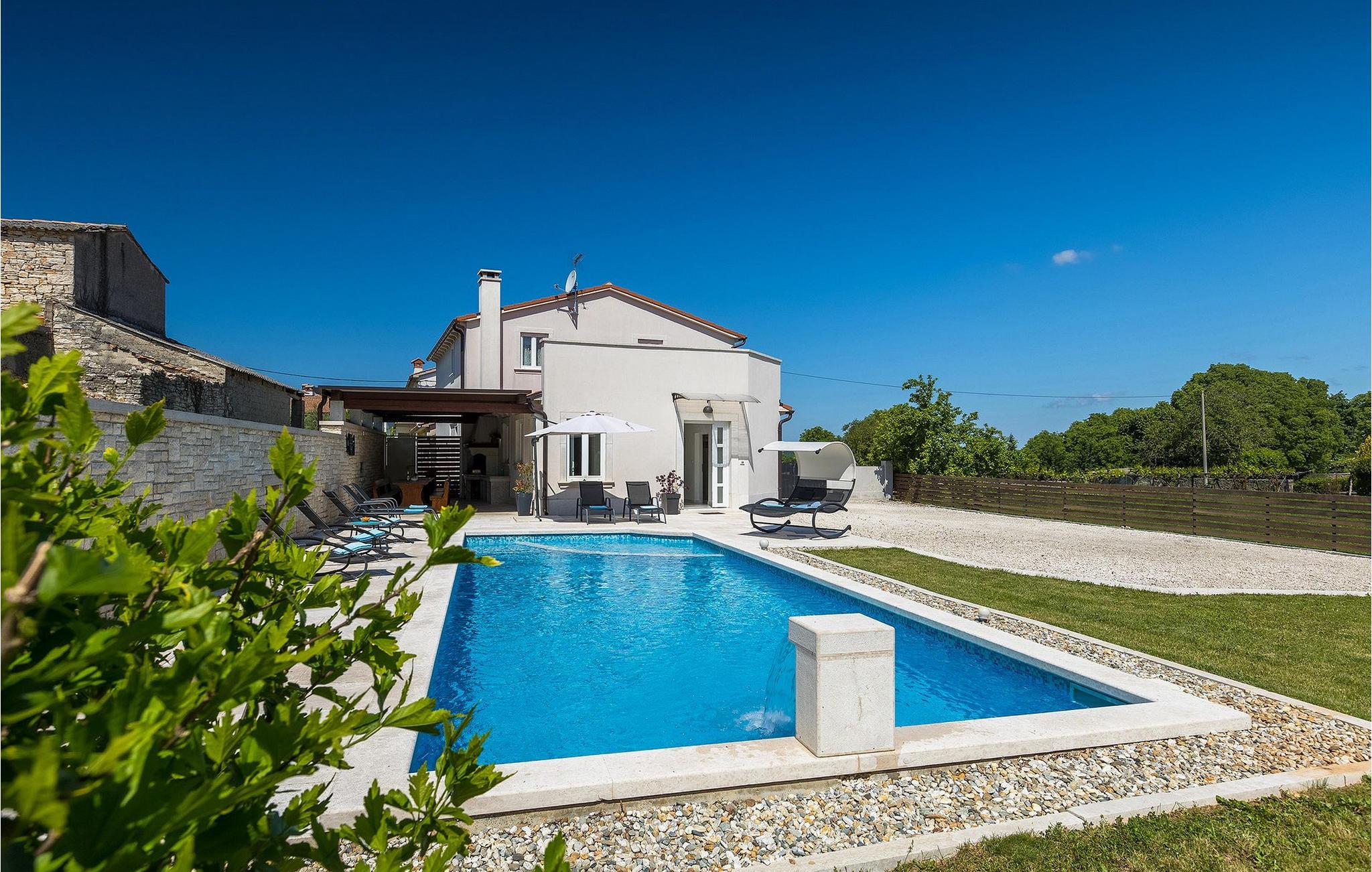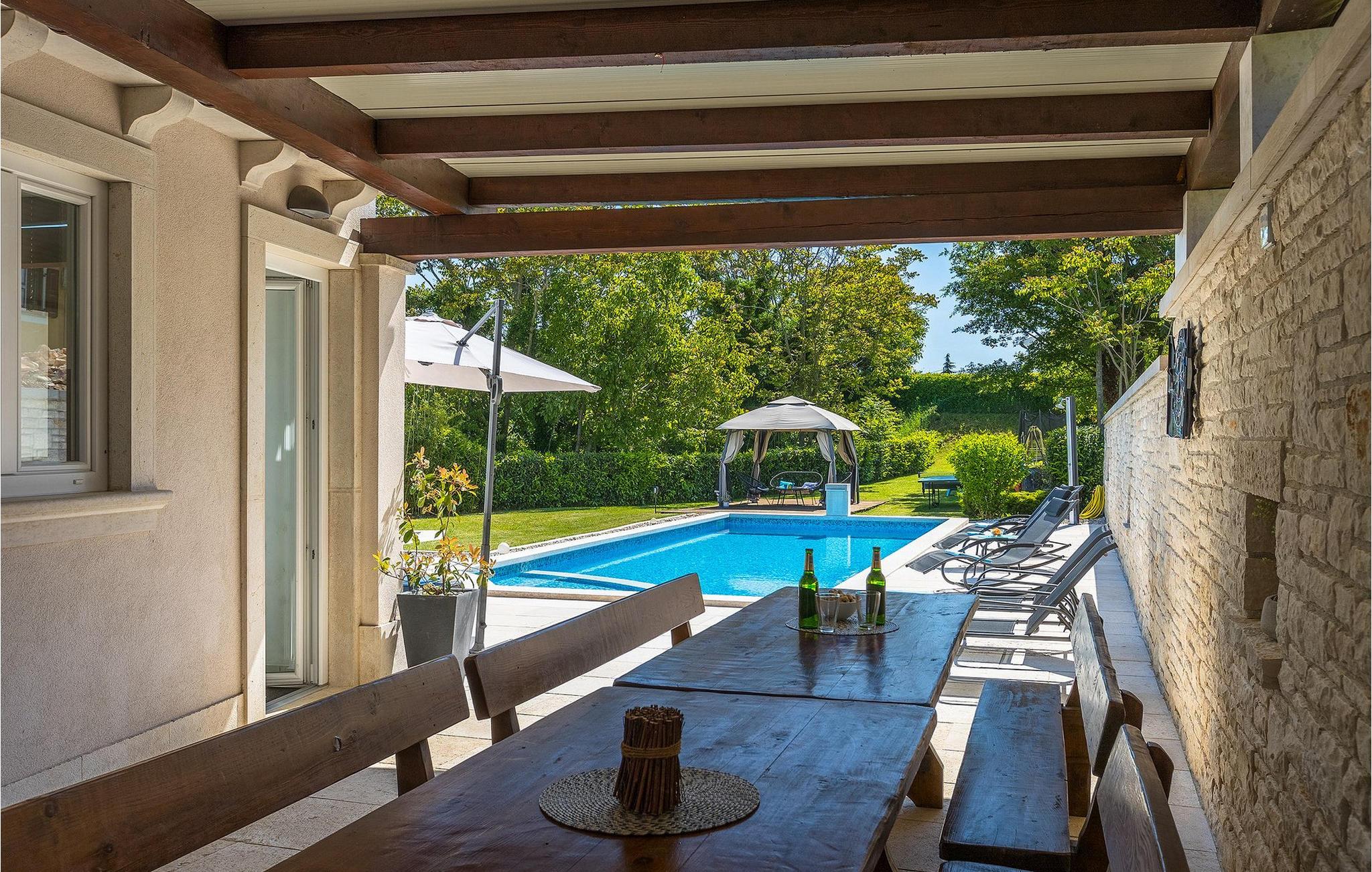 Die wunderschöne Villa Ema Istra befindet sich in Sveti Petar u Sumi in Zentralistrien. Die Villa bietet 6 Schlafzimmer, 5 Badezimmer und einen geräumigen Außenbereich mit privatem Pool, Tischtennis und Kinderspielplatz. Lassen Sie uns einen Rundgang machen.
