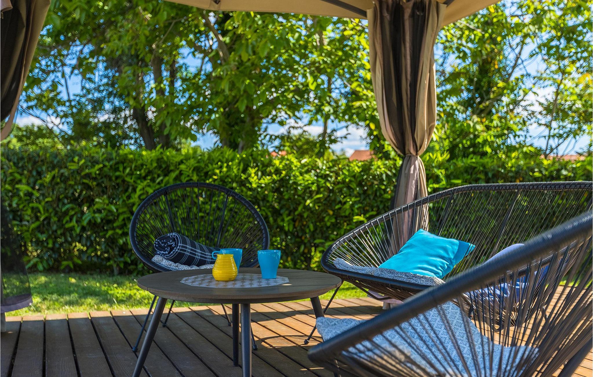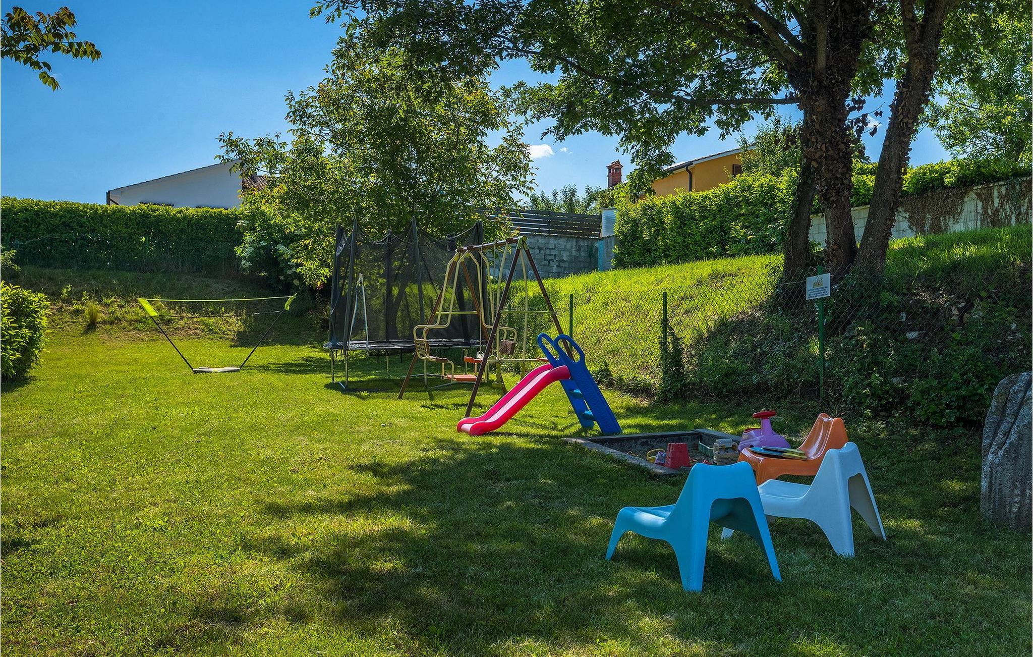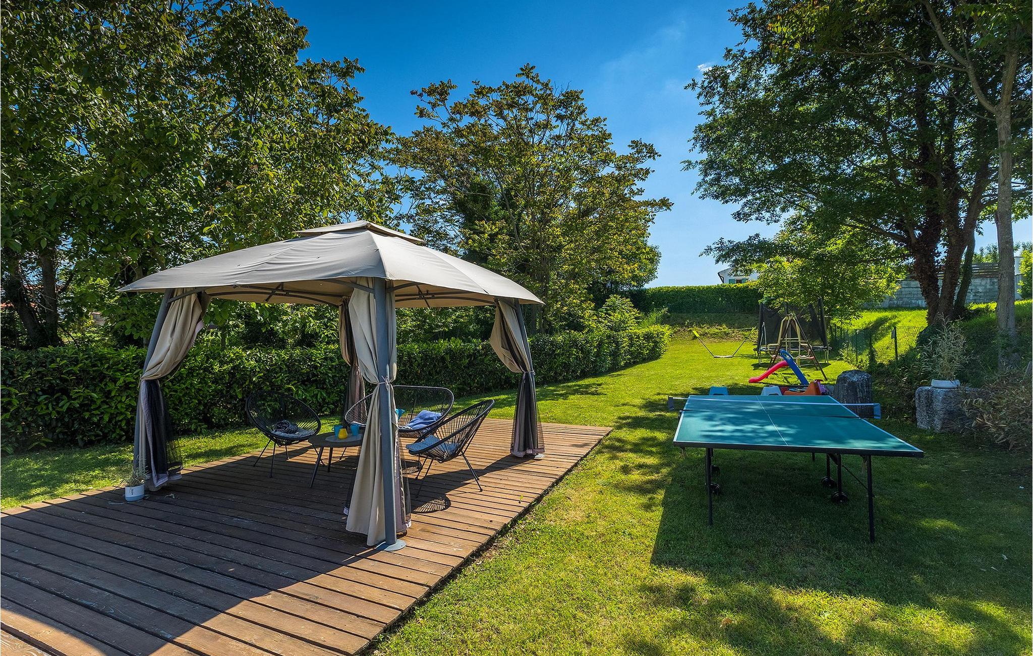 Im Außenbereich der Villa finden Sie einen privaten Pool mit Sonnenliegen und einen überdachten Esstisch im Freien mit Grill vor. Umgeben von viel Grün im Garten der Villa befinden Sie die Tischtennisplatte, ein Trampolin, Kinderspielplatz, Badmintonnetz und Gartenmöbel, wo Sie mit Freunden und Familie ein kaltes Getränk genießen können.