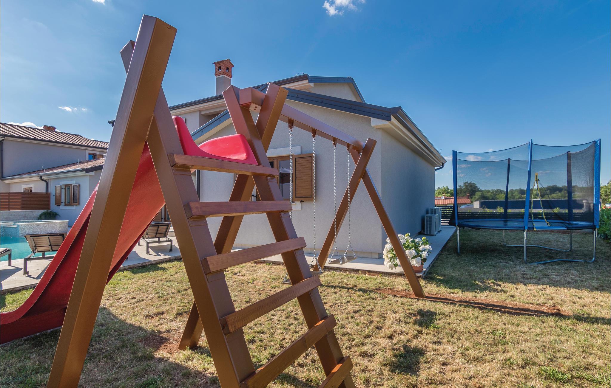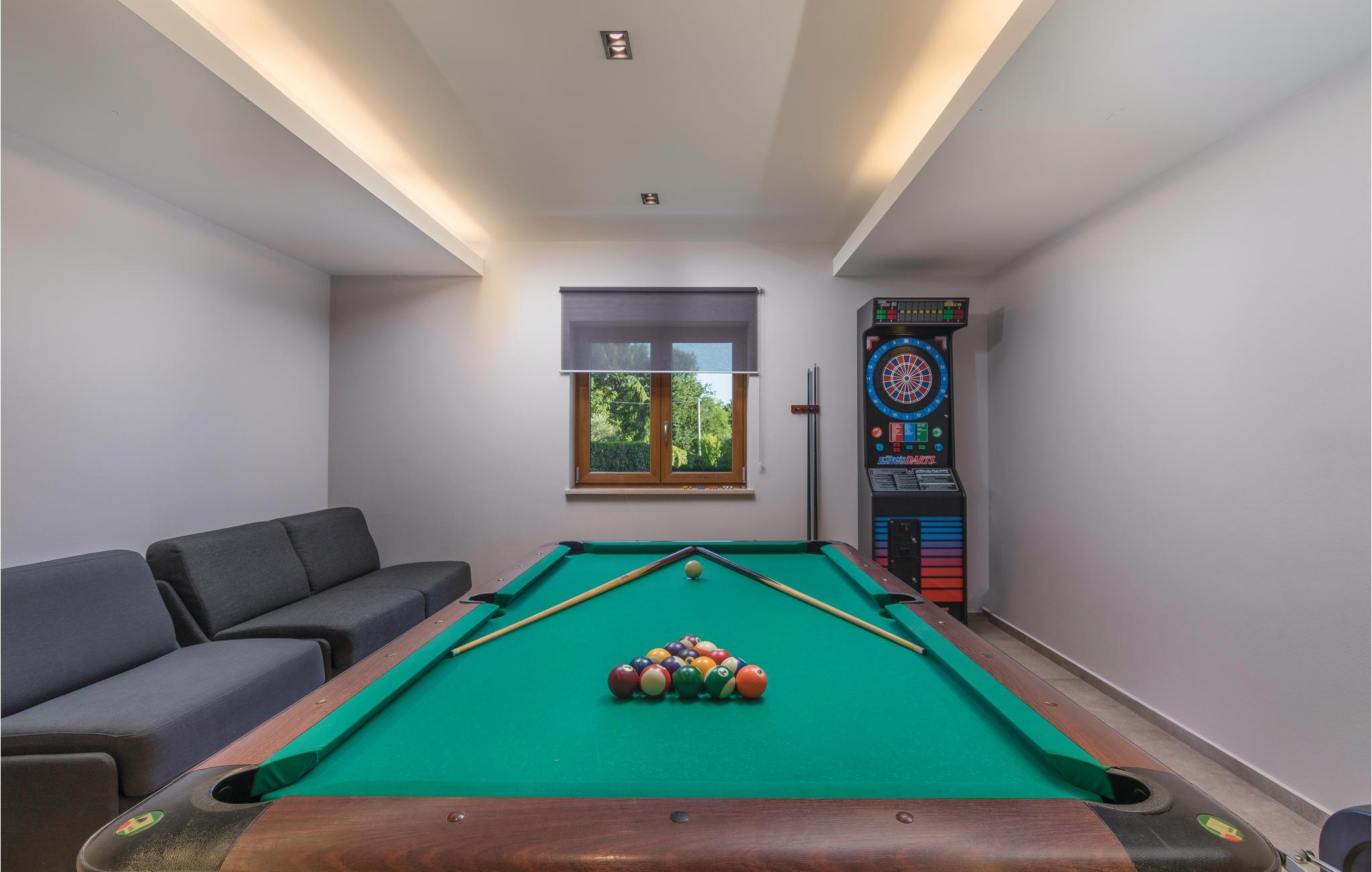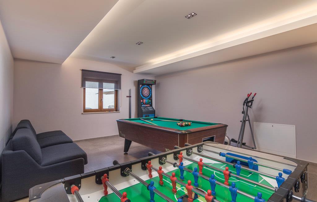Elegantes Ferienhaus mit Pool in einem kleinen Dorf in der Nähe von Pazin. Genießen Sie diese komfortable Ferienunterkunft mit dem schönen Interieur. Schlafzimmer und Wohnbereich sind klimatisiert. Erfrischen Sie sich im Swimmingpool oder entspannen Sie sich im Whirlpool, der sich daneben befindet. Unterhalten Sie sich im Billardraum, wobei Ihnen auch Tischfußball, Darts und eine Jukebox zur Verfügung stehen. Das Haus liegt an einer Verkehrsstraße. Für Gaumenfreuden entdecken Sie den Agrotourismus dieser Region, der traditionelle istrische Spezialitäten anbietet. Unternehmen Sie Ausflüge ans Meer und besichtigen Sie die historische Stadt Pula.