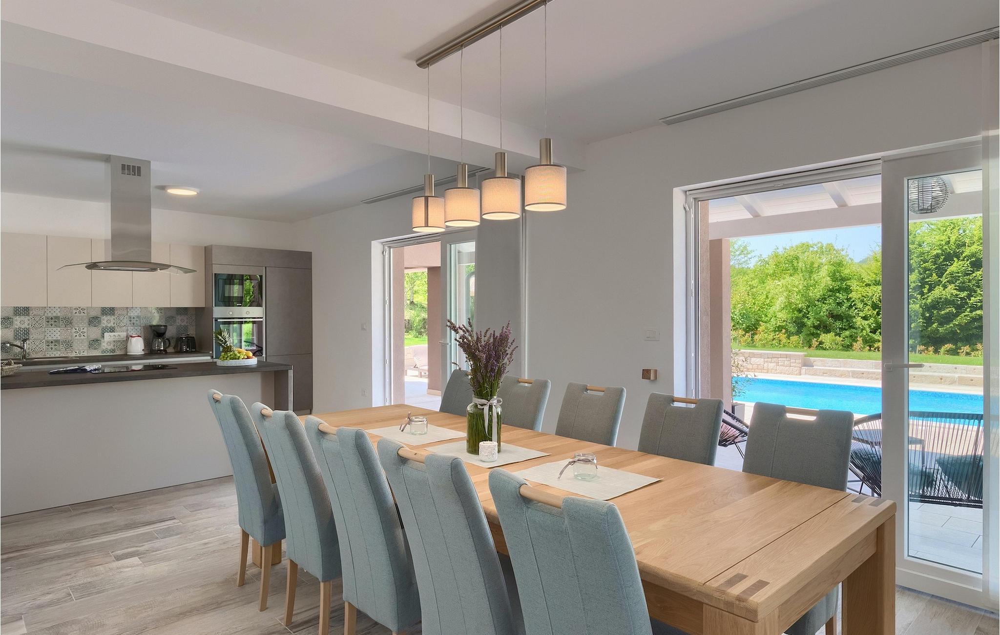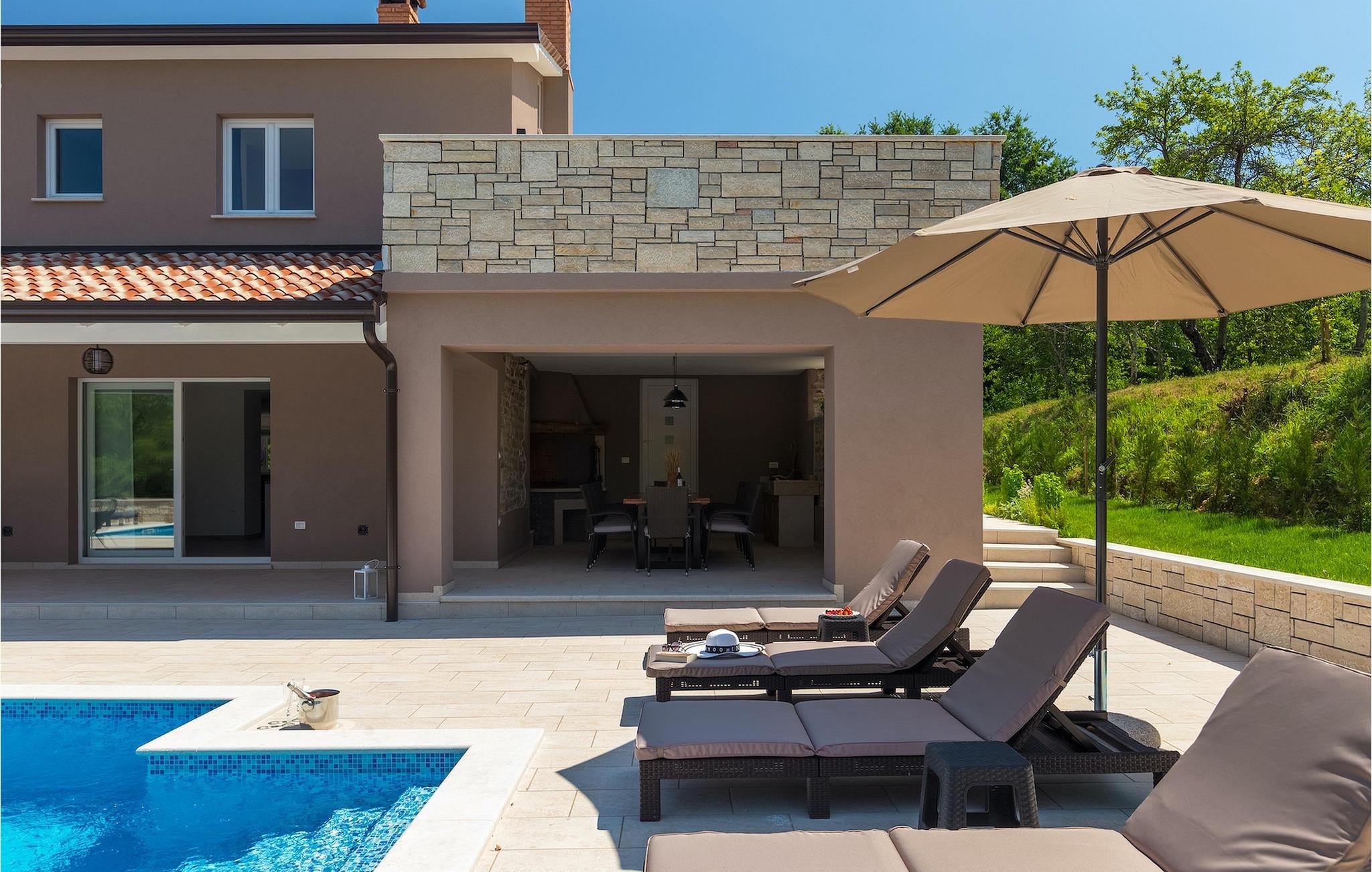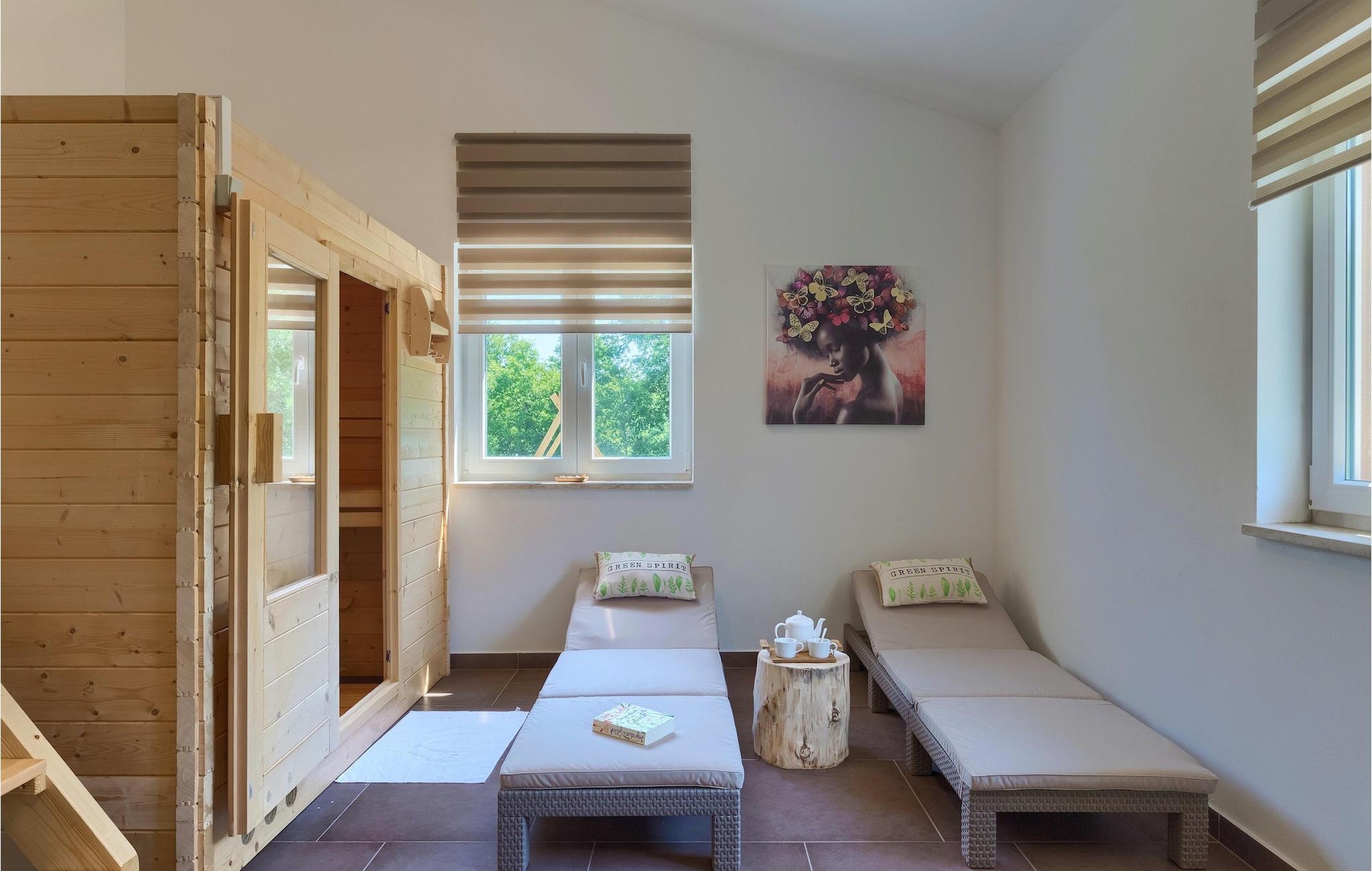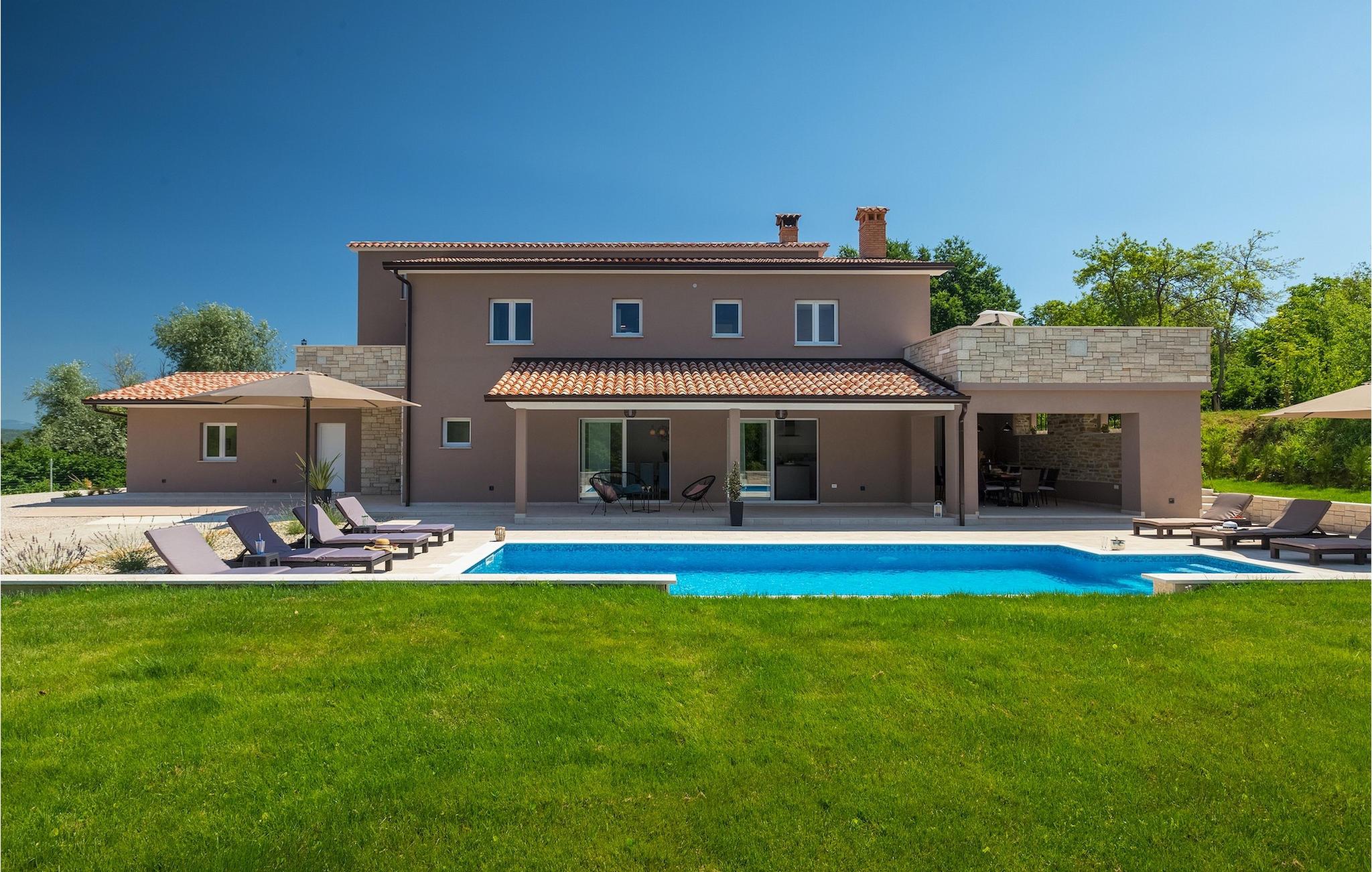Suchen Sie eine geräumige, moderne Villa in einem ruhigen Gebiet, umgeben von der Natur? Das alles mit einem privaten Pool und zahlreichen Aktivitäten für Spaß (ideal für den Familienurlaub), Villa Zamari ist die perfekte Auswahl für Ihren Urlaub! Diese wunderschöne Villa bietet Unterkunft für bis zu 12 Gäste in 5 eleganten Schlafzimmern mit viel Sorgfalt eingerichtet. Wenn Sie in die Villa eintreten finden Sie im Erdgeschoss den direkten Zugang zum verbundenen Bereich mit dem schicken Wohnzimmer, Esszimmer und komplett ausgestatteter Küche. Hier finden Sie auch ein Schlafzimmer mit separatem Badezimmer. Alle Räume haben einen schönen blick zum großen Pool und der Umgebung mit modischen Gartenmöbeln und zahlreichen Sonnenliegen. Die komfortablen Zimmer verteilen sich über die erste Etage und bieten jeweils ein privates, schönes Badezimmer. Zwei der Zimmer haben Zugang zu zwei recht großen Balkonen, auf denen Sie sich entspannen und den Blick auf die grüne Hügellandschaft dieses Teils von Istrien genießen können. Wo Sie sich sicherlich verwöhnen lassen werden ist der entspannte Wellnessbereich mit der Sauna. Im Erdgeschoss befindet sich auch noch viel Platz in dem Spielzimmer mit einem Billardtisch und Darts, perfekt für ein amüsantes Zusammenkommen. Sicherlich verbringen Sie auch viel Zeit um den privaten Pool oder im offenen Esszimmer mit der kleinen Küche und Kamin. Hier finden Sie viel Platz auf der Veranda, für die ganze Familie, während die Kinder im Garten auf dem Trampolin springen. Villa Zamari erwartet Sie für den unterhaltsamen und entspannten Urlaub im Hinterland Istriens!Die schöne Villa Zamari befindet sich im kleinen Dorf umgeben von Natur und nur ein paar Minuten entfernt von Pazin. Pazin ist eine kleine, historisch reiche, die viel anzubieten hat und nur etwa 30 km von anderen touristischen Städten entfernt ist. Jahrhunderte lang war Pazin die stärkste Habsburger Festung in diesem Gebiet und das Hauptquartier des ehemaligen Fürsten. Diese mittelalterliche Burg (“Kastel”) können Sie auch heute besuchen, denn sie ist gut erhalten. Heute befindet sich hier das Ethnographische Museum Istriens und das Museum der Stadt Pazin. Besichtigen Sie auch Kirchen in dieser Gegend, denn sogar sechs sind durch das kulturelle Erbe Kroatiens geschützt. Eine von ihnen, die Kirche der hl. Maria in Beram (zwischen Pazin und Porec), weltbekannt für die istrische Freske des Todestanzes aus dem Jahr 1474. Das istrische Hinterland bietet aber auch viel mehr als nur Kultur an. Falls Sie ein Naturliebhaber sind, sind Sie hier richtig. Genießen Sie Wandern, Zipline oder machen Sie eine Gastro-Radtour, um istrische Spezialitäten auszuprobieren. Besuchen Sie auch unbedingt den Pazin Bach, wo Sie kleine Wasserfälle, Teiche und sogar Höhlen bewundern können. In dieser puren Natur können Sie auch im Sommer baden. Möchten Sie Istrien besser kennenlernen, besuchen Sie auch Porec, Rovinj oder Pula.