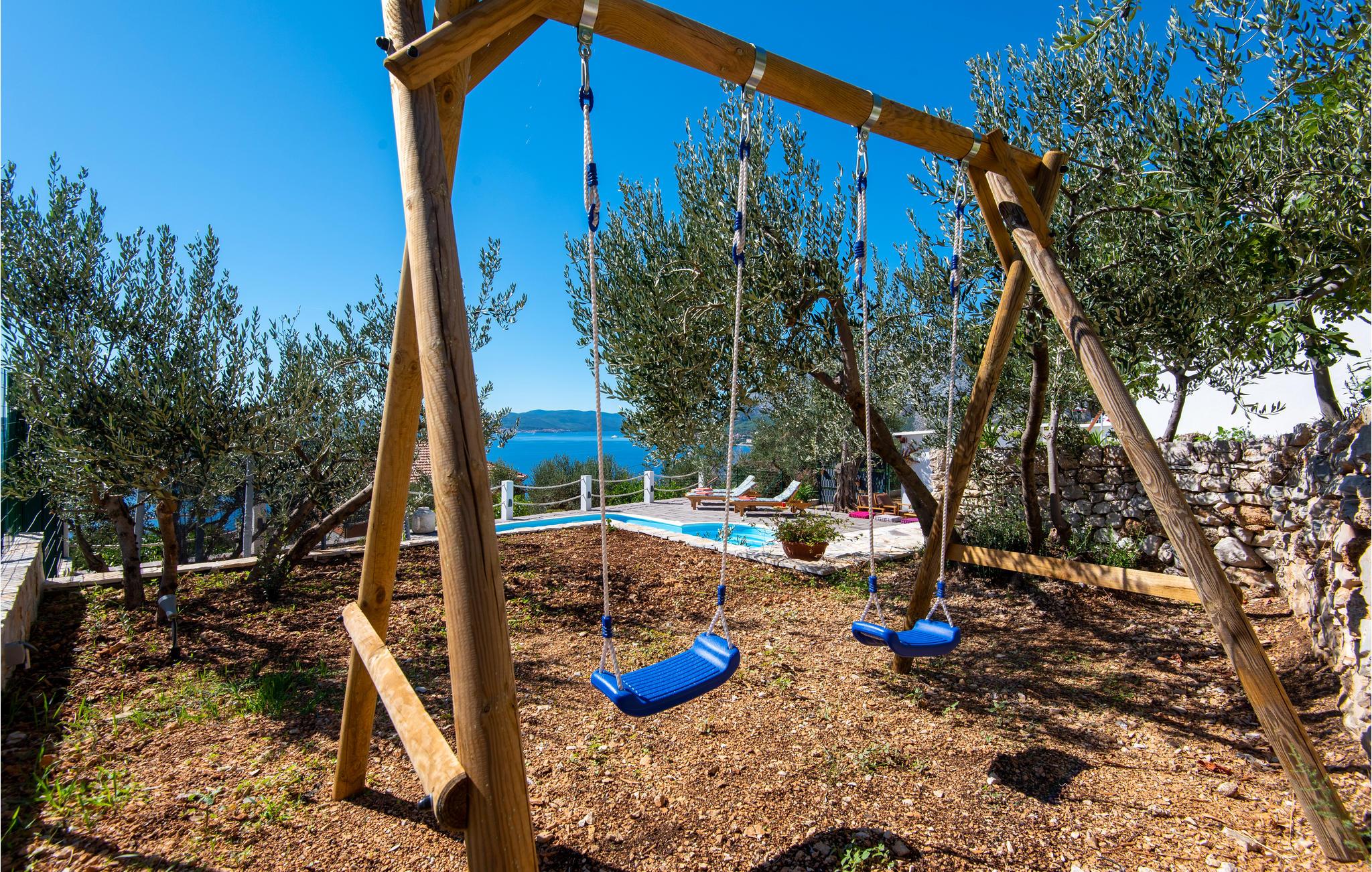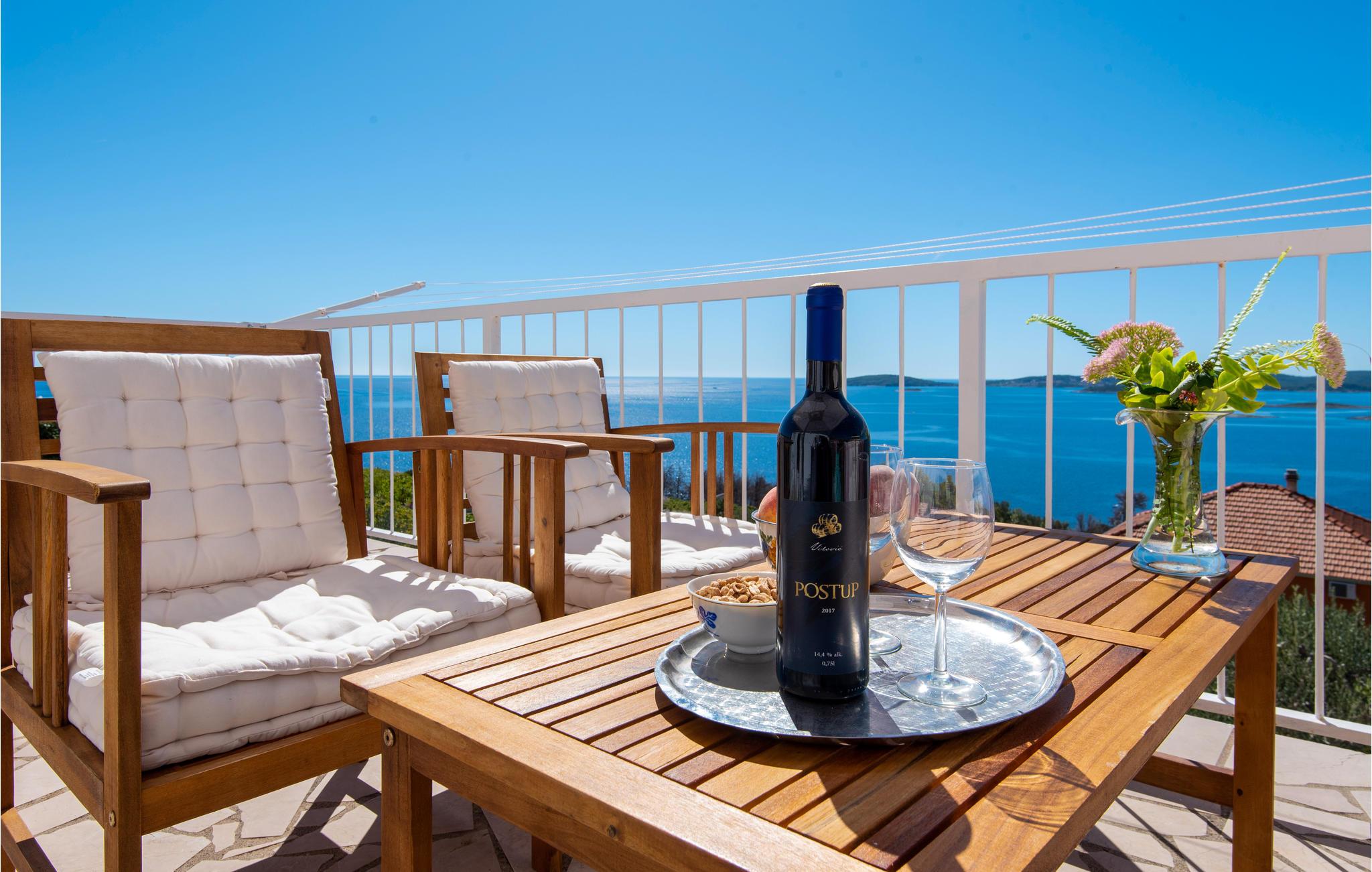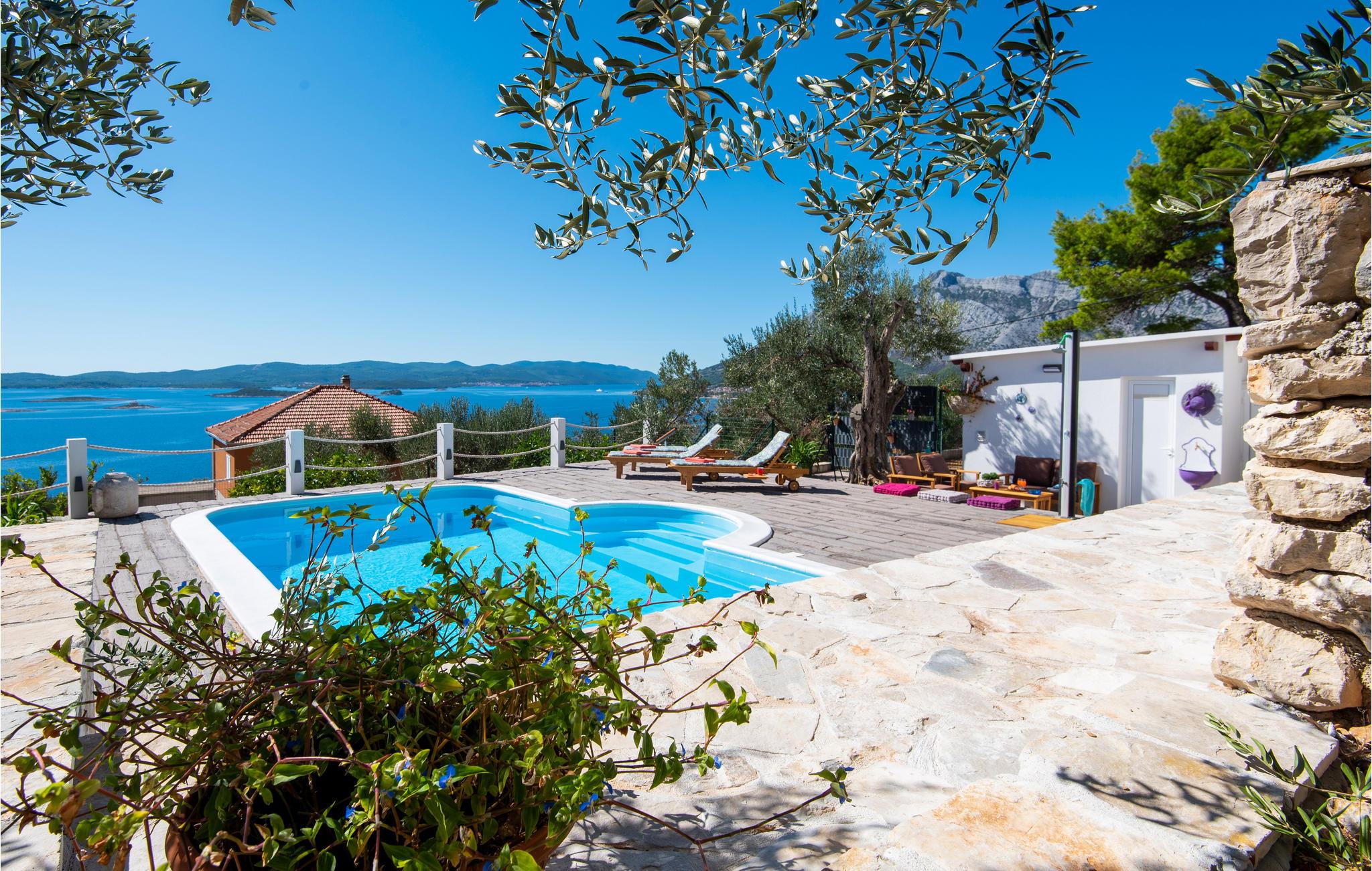 Dieses einfache Ferienhaus auf einer kleinen Anhöhe besteht aus zwei Etagen. Im Erdgeschoß ist die Küche mit kleinem Wohnzimmer, Bad und einem Schlafzimmer. Im ersten Stock sind ein größeres und ein kleines Schlafzimmer. Aus dem Flur im Obergeschoß gelangen Sie auf eine schöne Terrasse mit atemberaubender Aussicht. Entspannen Sie im Garten mit viel Grün und Plätzen im Schatten, an denen Sie Ihren Kaffee genießen können. Wer auf Entspannung und Spaß setzt, findet beides im beheizten Außenpool. Bereiten Sie köstliche Gerichte am Grill zu und genießen dazu heimischen Wein von Peljesac.