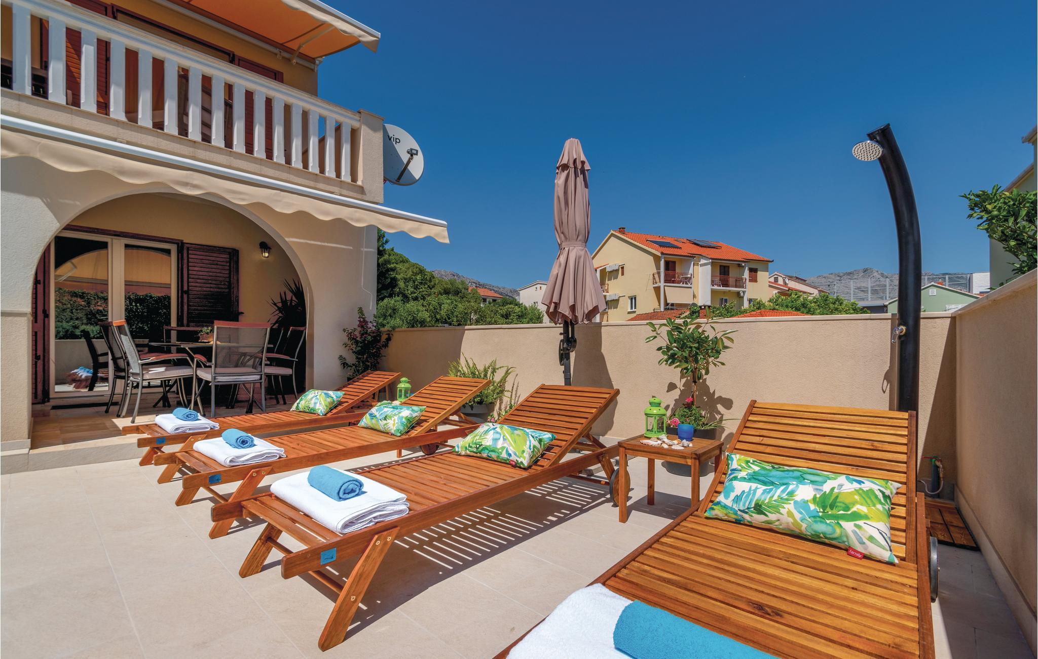 Dieses geschmacksvoll eingerichtete und sehr gut ausgestattete Ferienhaus liegt nur 60 Meter von einem Kiesstrand entfernt. Im Erdgeschoss befinden sich eine Küche, Bad, Wohnraum und Esszimmer mit Ausgang auf die Terrasse und zum Außenpool. Oben erwarten Sie zwei weitere Badezimmer und zwei Schlafzimmer, jeweils mit einem Ausgang auf die Terrasse mit wunderbarem Meerblick. Da Sie sich nur 100 Meter vom Zentrum in Orebic befinden, können Sie ganz einfach zu Fuß Restaurants und Geschäfte erreichen. Von hier können Sie auch die Fähre zur Insel Korcula nehmen. Die Überfahrt dauert nur 10 Minuten.
