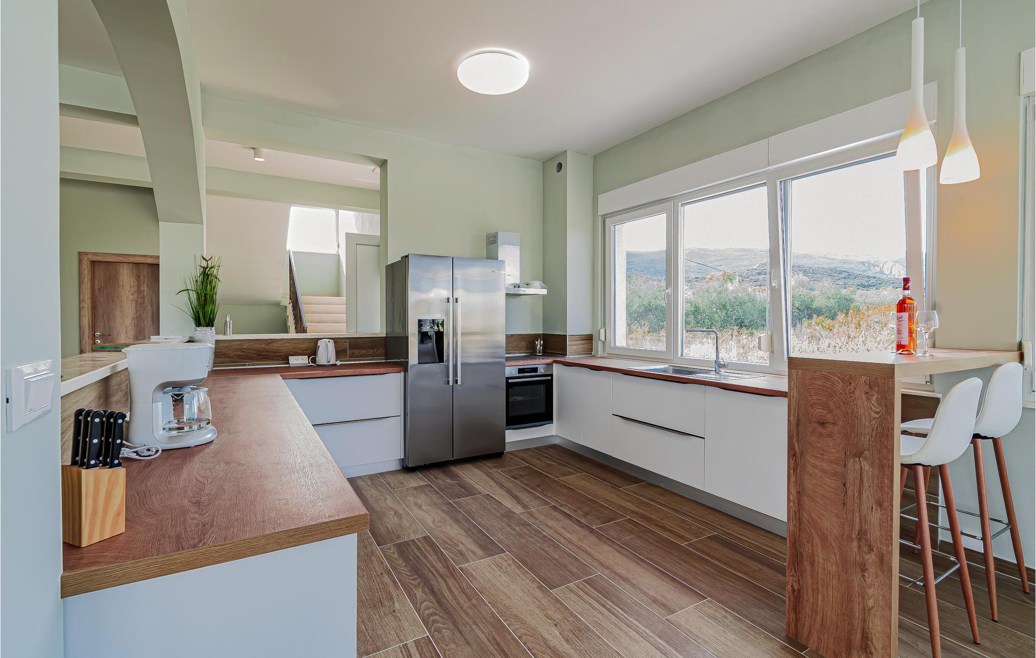 Der einladende und opulente Wohnraum verspricht Platz für alle, egal ob Sie in der vollausgestatteten Küche die Mahlzeiten vorbereiten, am Esstisch Brettspiele spielen oder sich auf den Sofas entspannen. Von hier gelangen Sie auf die überdachte Terrasse, auf der Sie leckere Mahlzeiten zu sich nehmen können. Der Swimming Pool rundet das fantastische Angebot für Sie ab.