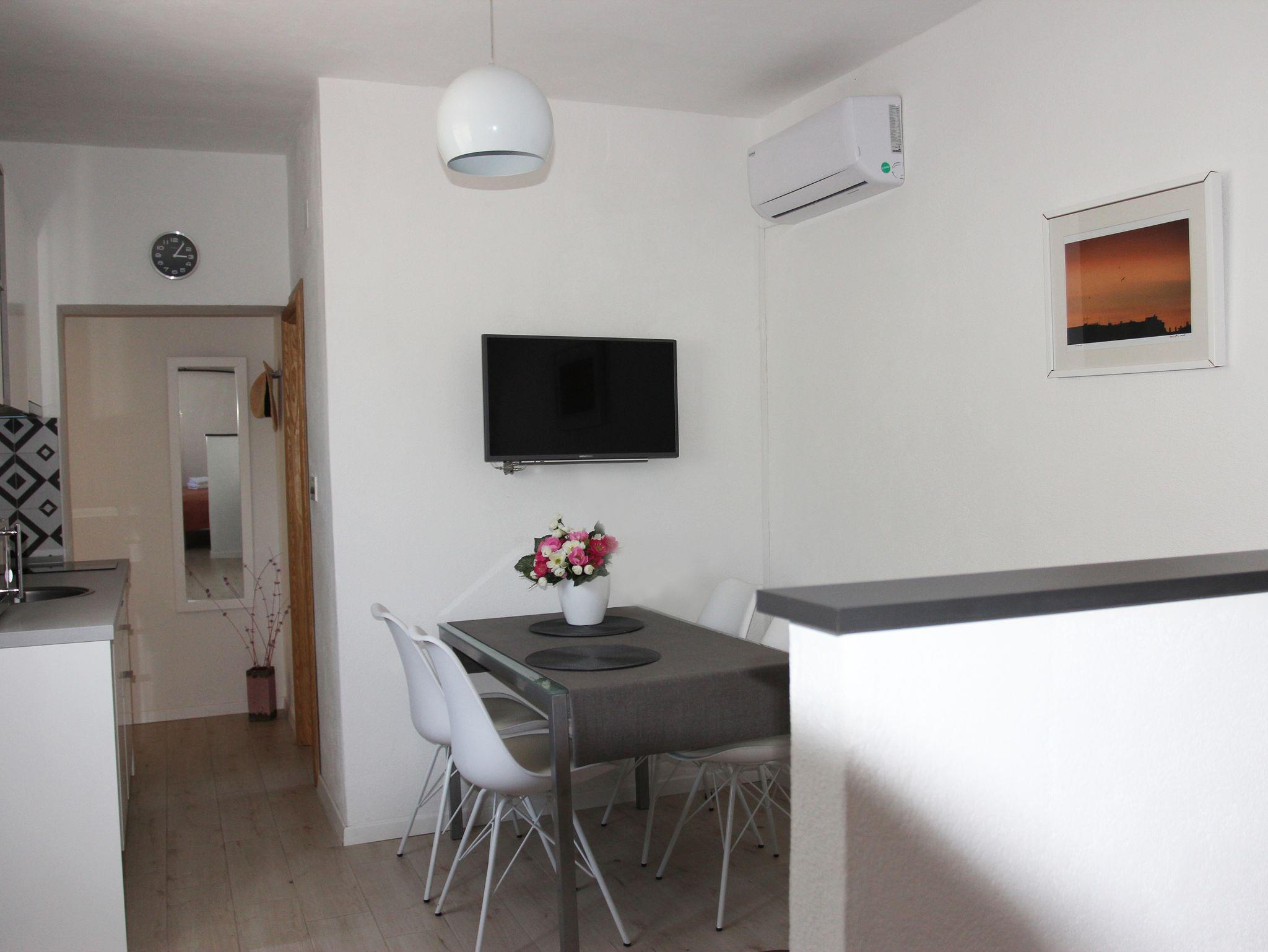 Ferienwohnung bietet Platz für 4 Gäste. Die Betten sind in Schlafzimmern, die es 1 gibt, und in Wohnzimmer, innerhalb einer Gesamtfläche von 33m2, angeordnet. Die Gäste haben eine eigene Terrasse zur Verfügung, auf der sie in warmen Sommernächten genießen können. Es ist erlaubt, Speisen auf dem Gemeinschafts-Grill vorzubereiten. IM PREIS INBEGRIFFEN: Kurtaxe, Endreinigung, Klimatisierung, Parkplatz, Internet, Bügeleisen, Bügelbrett, Föhn. VERBINDLICHE ZUSÄTZLICHE KOSTEN: Aufzahlung für Kurzaufenthalte (prozentualer Zuschlag pro Nächtigungsanzahl: 30% - 1, 20% - 2, 10% - 3). UNVERBINDLICHE ZUSÄTZLICHE KOSTEN: Wäschewaschen (10,00 € Waschen). Die Verfügbarkeit zusätzlicher Dienstleistungen in Ihrem reservierten Termin und die Preise derselben (falls nicht aufgeführt) müssen im Voraus überprüft werden. Zusätzliche Dienstleistungen die in der Zahlungsaufforderung nicht aufgeführt sind werden direkt beim Vermieter bezahlt, angenommen der Gast nutzt auch diese. Ermäßigung auf den Grundpreis: Gratistag 28=25 (bei einem Aufenthalt von 28 oder mehr Tagen erhalten Sie 3 kostenlose Tage für den Aufenthalt bis 31.12.26).