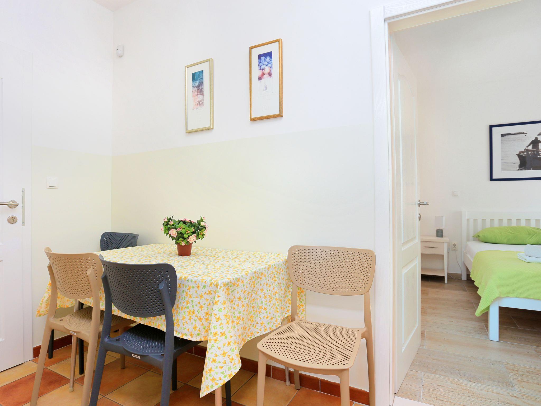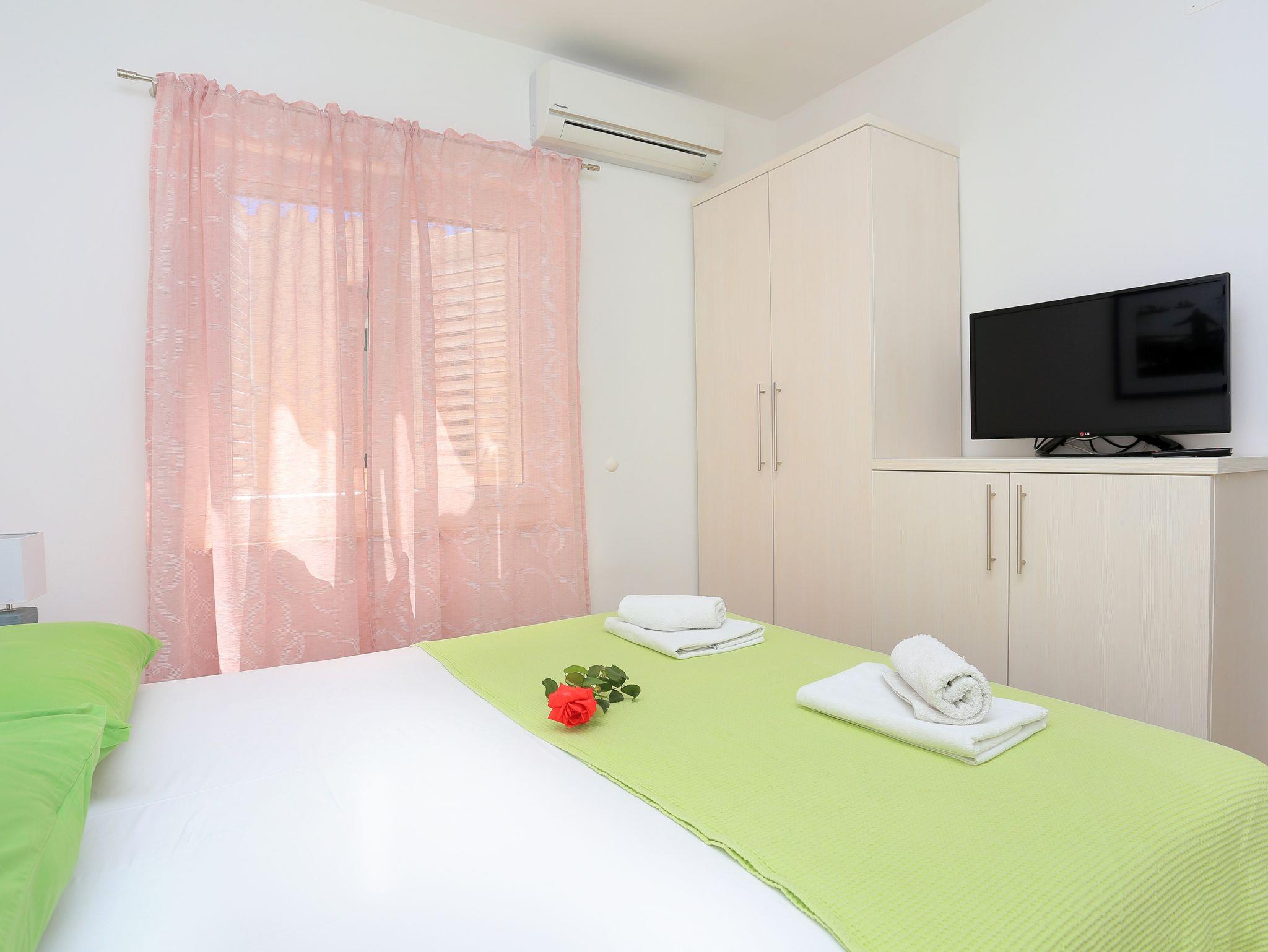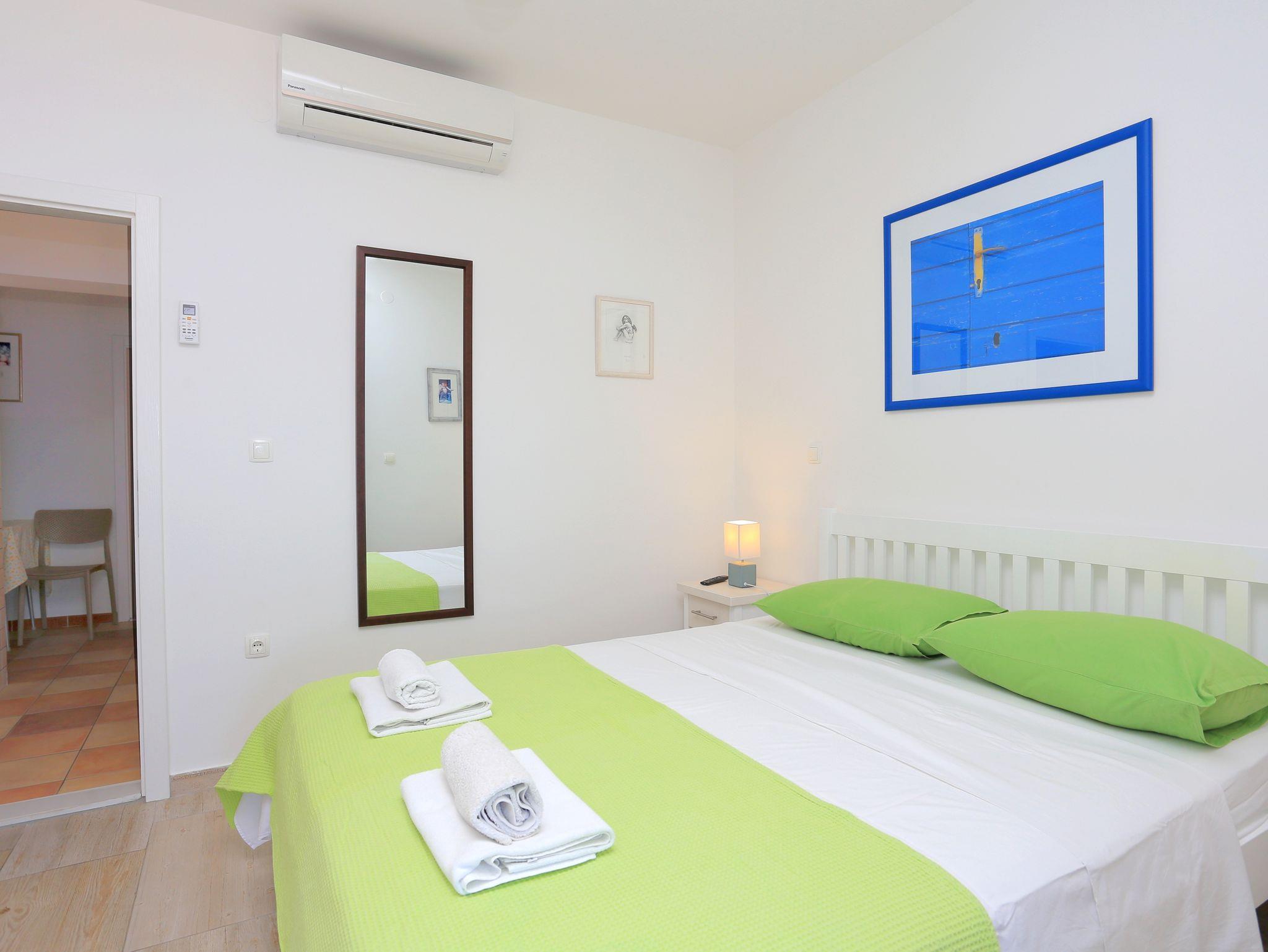 Ferienwohnung bietet Platz für 4 Gäste. Die Betten sind in Schlafzimmern, die es 2 gibt, innerhalb einer Gesamtfläche von 40m2, angeordnet. Die Gäste haben eine eigene Terrasse zur Verfügung, auf der sie in warmen Sommernächten genießen können. Das Apartment bietet Meerblick. IM PREIS INBEGRIFFEN: Kurtaxe, Endreinigung, Klimatisierung, Parkplatz, Internet, Bootsanlegeplatz, Kinderbett, Bügeleisen, Bügelbrett, Föhn, Sonnenschirm, Liegestühle. VERBINDLICHE ZUSÄTZLICHE KOSTEN: Aufzahlung für Kurzaufenthalte (prozentualer Zuschlag pro Nächtigungsanzahl: 30% - 1, 20% - 2, 10% - 3). Die Verfügbarkeit zusätzlicher Dienstleistungen in Ihrem reservierten Termin und die Preise derselben (falls nicht aufgeführt) müssen im Voraus überprüft werden. Zusätzliche Dienstleistungen die in der Zahlungsaufforderung nicht aufgeführt sind werden direkt beim Vermieter bezahlt, angenommen der Gast nutzt auch diese. Ermäßigung auf den Grundpreis: Gratistag 28=25 (bei einem Aufenthalt von 28 oder mehr Tagen erhalten Sie 3 kostenlose Tage für den Aufenthalt bis 31.12.26).