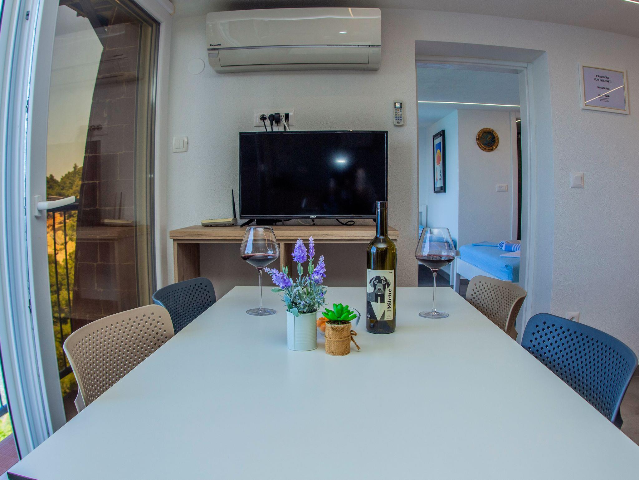 Ferienwohnung bietet Platz für 4 Gäste. Die Betten sind in Schlafzimmern, die es 1 gibt, und in Wohnzimmer, innerhalb einer Gesamtfläche von 42m2, angeordnet. Die Gäste haben eine eigene Terrasse zur Verfügung, auf der sie in warmen Sommernächten genießen können. Das Apartment bietet Meerblick. Es ist erlaubt, Speisen auf dem Gemeinschafts-Grill vorzubereiten. IM PREIS INBEGRIFFEN: Kurtaxe, Endreinigung, Klimatisierung, Parkplatz, Internet, Bootsanlegeplatz, Kinderbett, Bügeleisen, Bügelbrett, Föhn, Sonnenschirm, Liegestühle. VERBINDLICHE ZUSÄTZLICHE KOSTEN: Aufzahlung für Kurzaufenthalte (prozentualer Zuschlag pro Nächtigungsanzahl: 30% - 1, 20% - 2, 10% - 3). Die Verfügbarkeit zusätzlicher Dienstleistungen in Ihrem reservierten Termin und die Preise derselben (falls nicht aufgeführt) müssen im Voraus überprüft werden. Zusätzliche Dienstleistungen die in der Zahlungsaufforderung nicht aufgeführt sind werden direkt beim Vermieter bezahlt, angenommen der Gast nutzt auch diese.