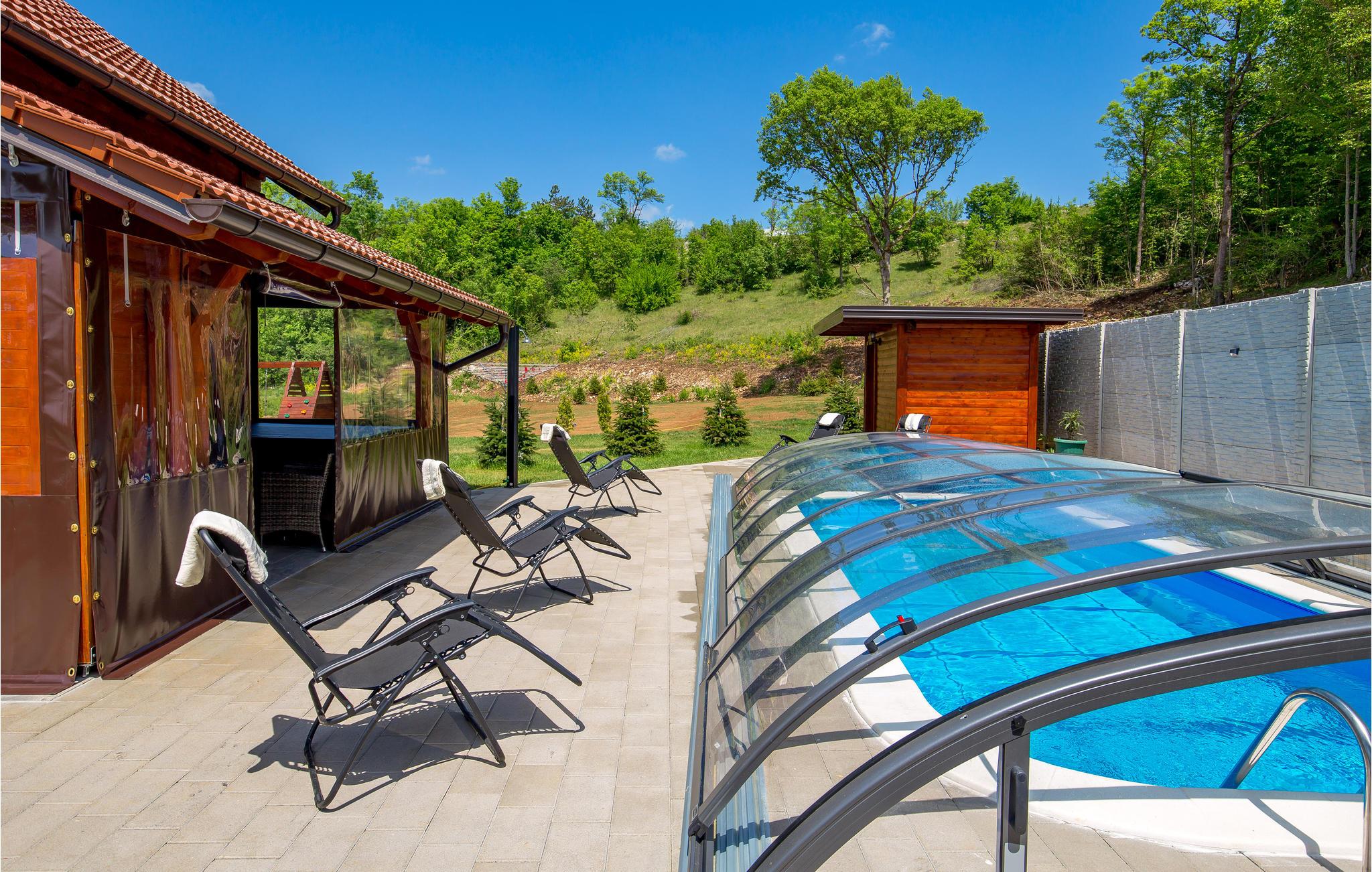 Nehmen Sie Ihre Familie oder Freunde mit und beziehen Sie dieses heimelige Haus in der bergigen Landschaft im Zentrum Kroatiens. Alle Räume sind wunderbar wohlig eingerichtet und verströmen u. A. dank viel Holzbauweise einiges an Charme. Insbesondere wird Sie das Wellness-Angebot überzeugen: In der klaren, frischen Bergluft können Sie in Pool, Sauna, Whirlpool und auf der Sonnenliege einiges an Energie tanken.