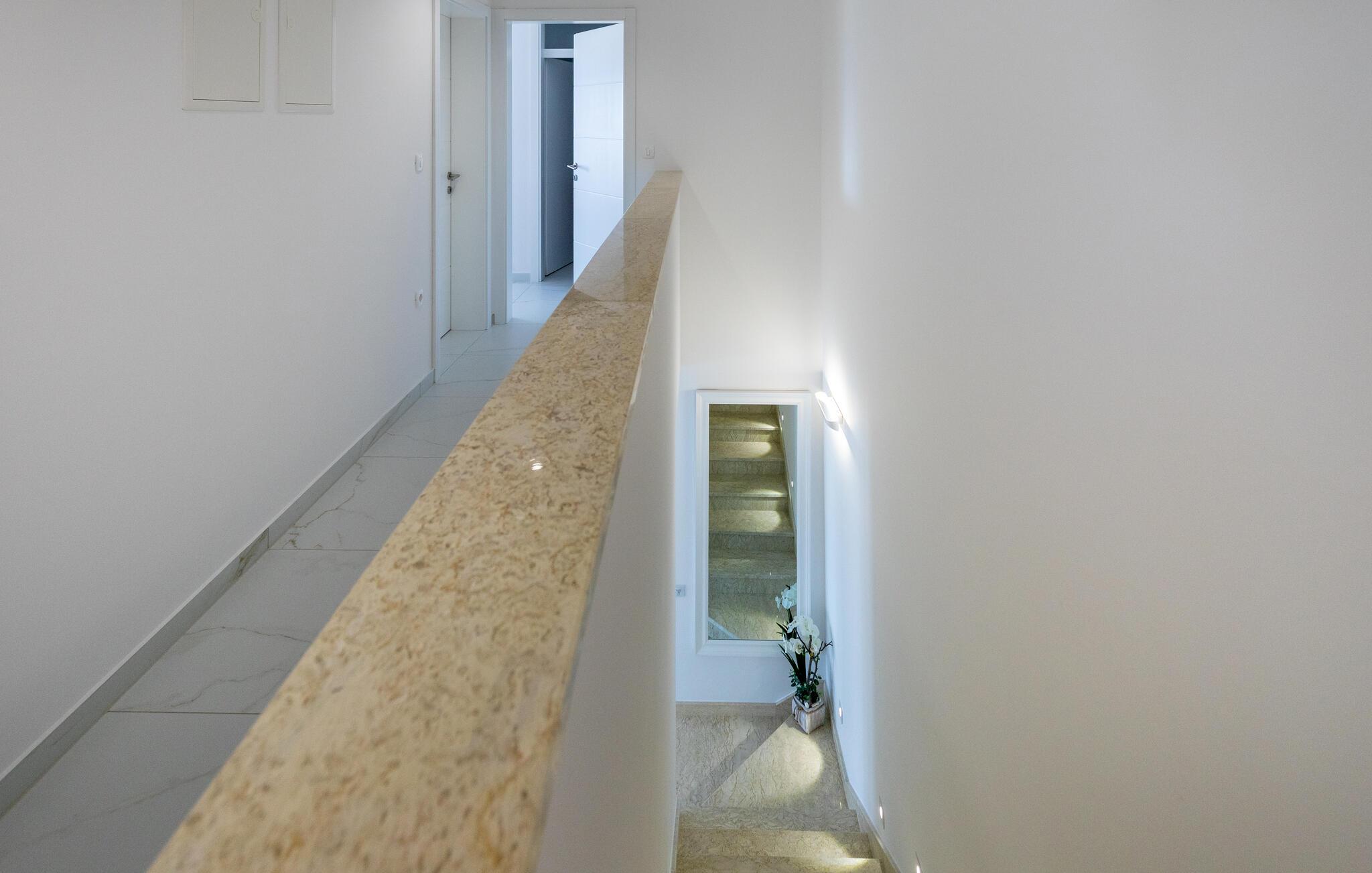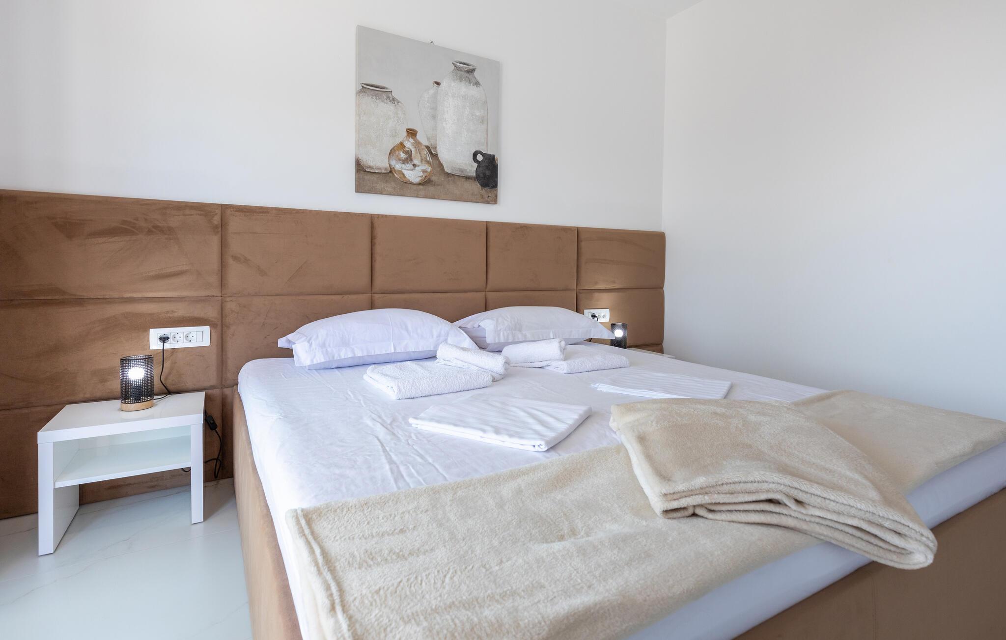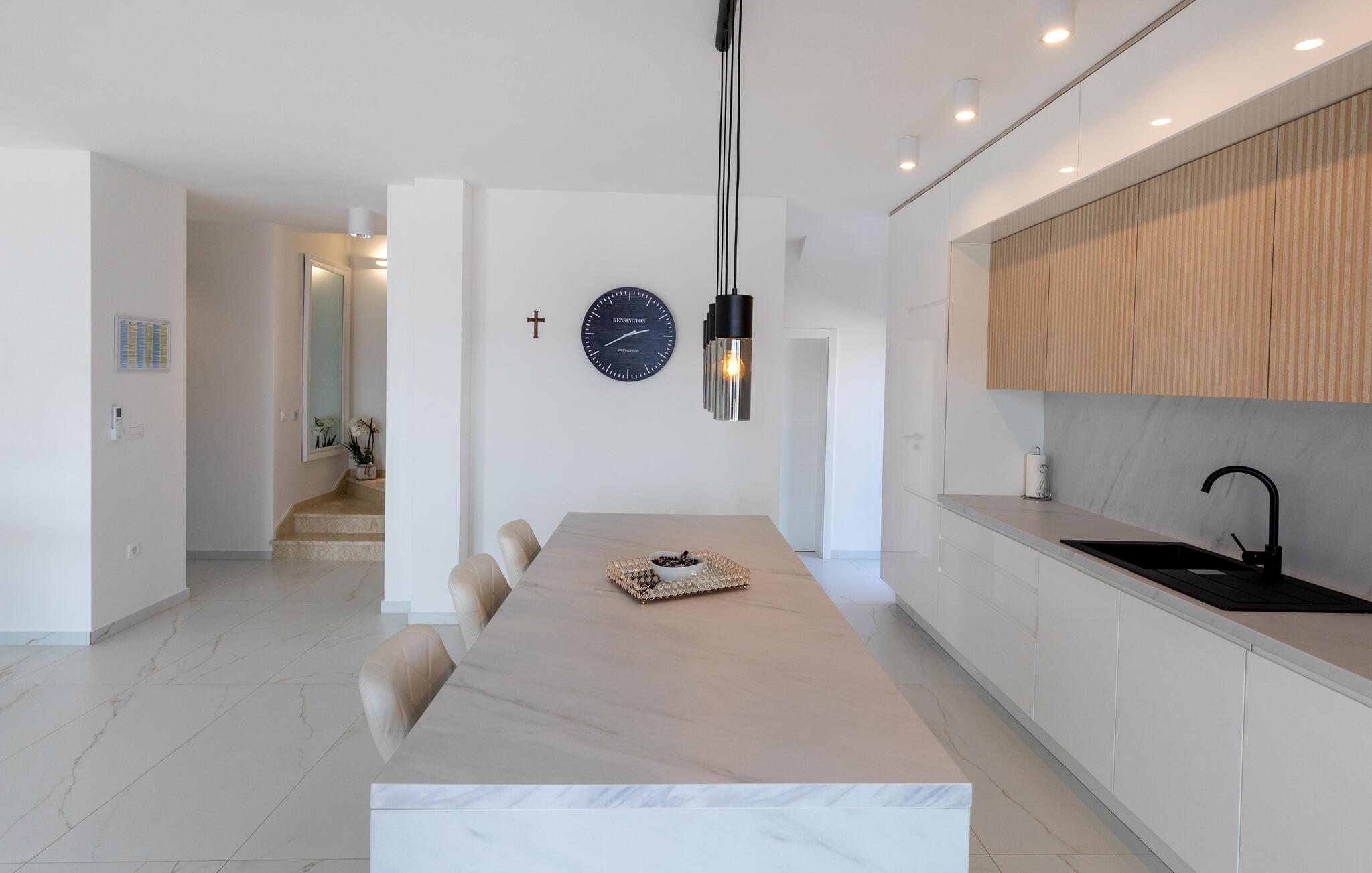 Freuen sie sich mit Ihrer Familie auf einen erholsamen Urlaub in Komarna und diesem geräumigen und modernen Haus auf zwei Etagen. Die Unterkunft eignet sich auch für mehrere befreundete Paare, die dank der eigenen Badezimmer Ihre Privatsphäre genießen können. Im Erdgeschoss finden Sie den Wohnbereich, der Sie mit seinem hellen und komfortablen Konzept begeistern wird und Sie sich hier einfach entspannen können. Genießen Sie in der offenen Küche gemeinsame Kochabende oder relaxen auf dem Sofa.