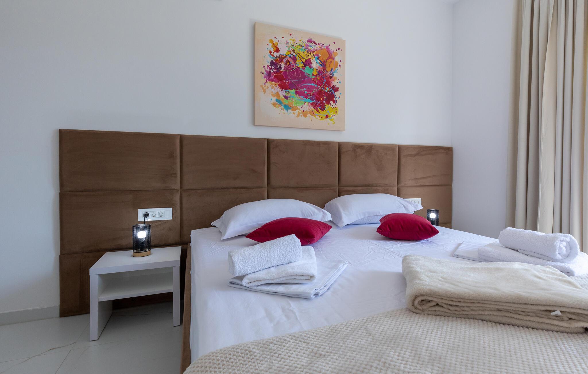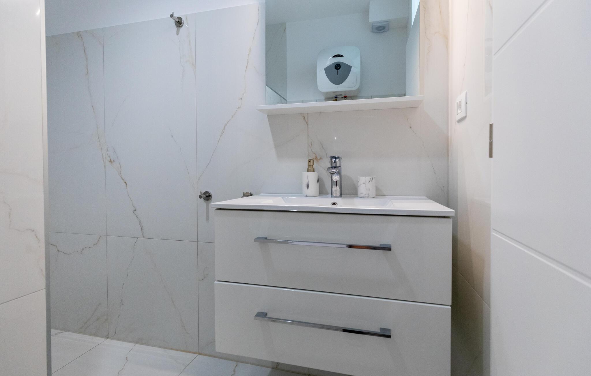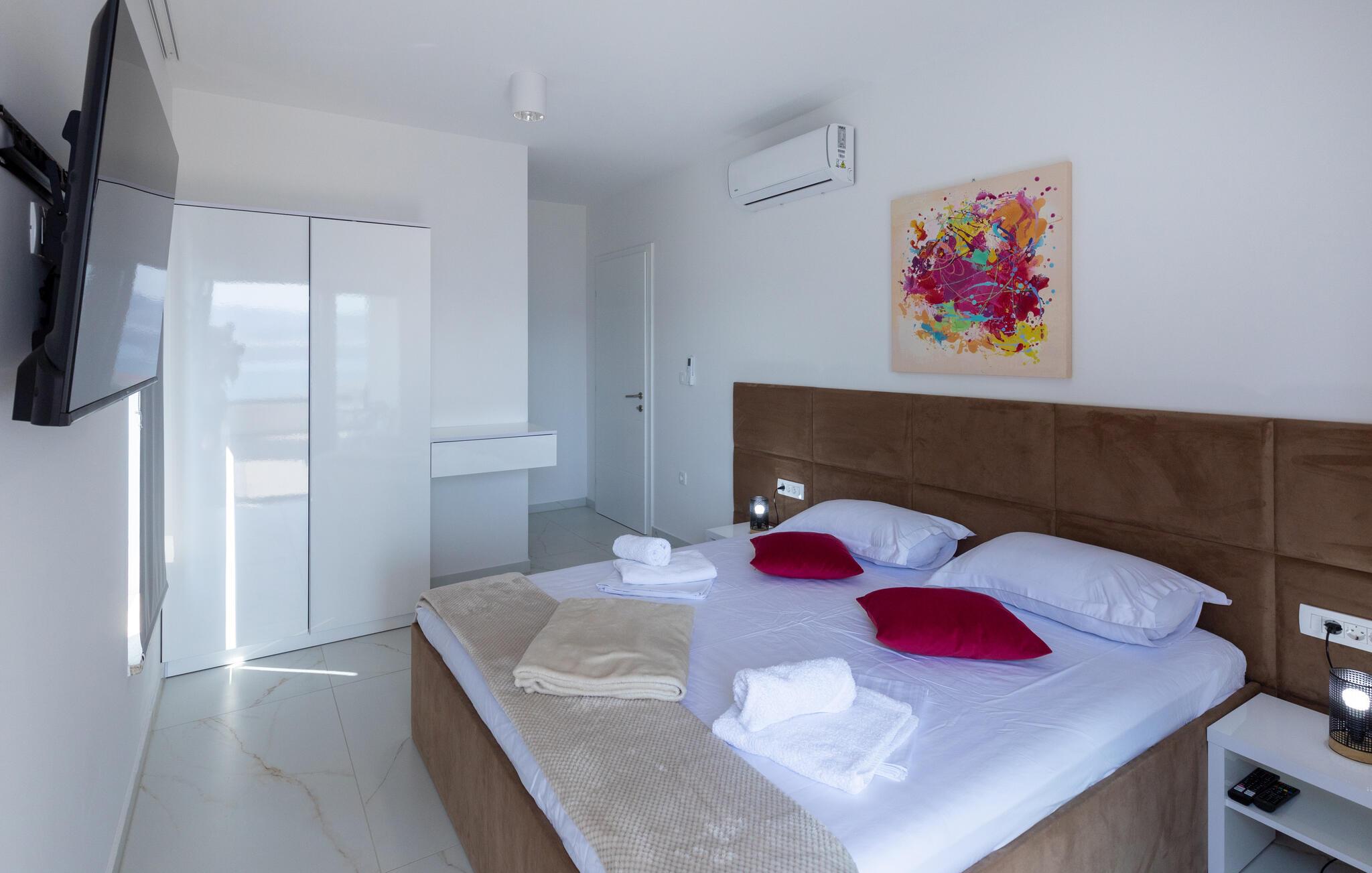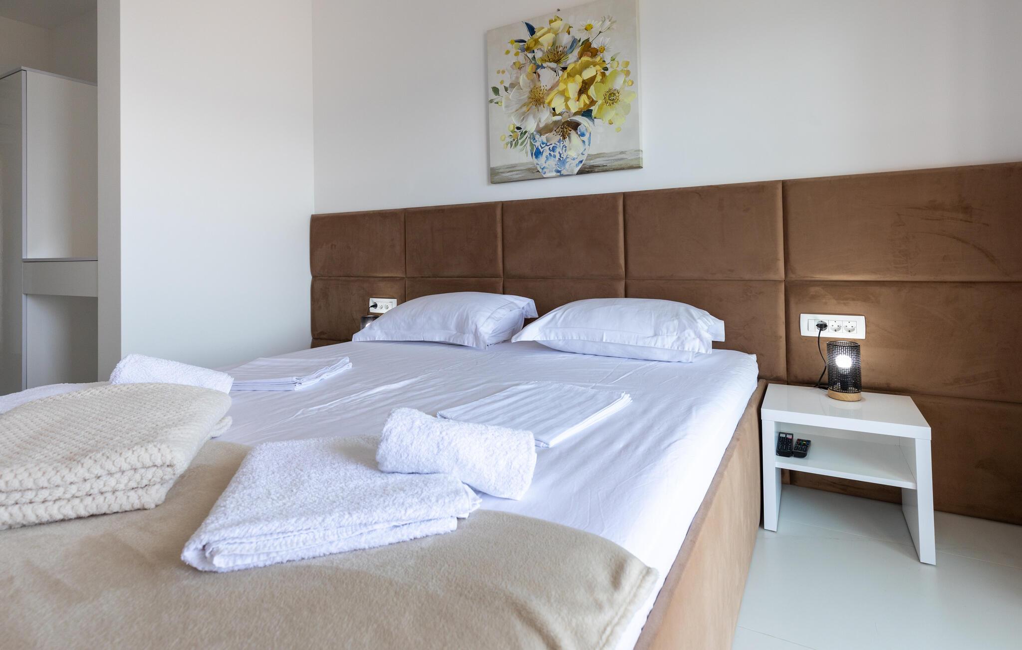 Freuen sie sich mit Ihrer Familie auf einen erholsamen Urlaub in Komarna und diesem geräumigen und modernen Haus auf zwei Etagen. Die Unterkunft eignet sich auch für mehrere befreundete Paare, die dank der eigenen Badezimmer Ihre Privatsphäre genießen können. Im Erdgeschoss finden Sie den Wohnbereich, der Sie mit seinem hellen und komfortablen Konzept begeistern wird und Sie sich hier einfach entspannen können. Genießen Sie in der offenen Küche gemeinsame Kochabende oder relaxen auf dem Sofa.