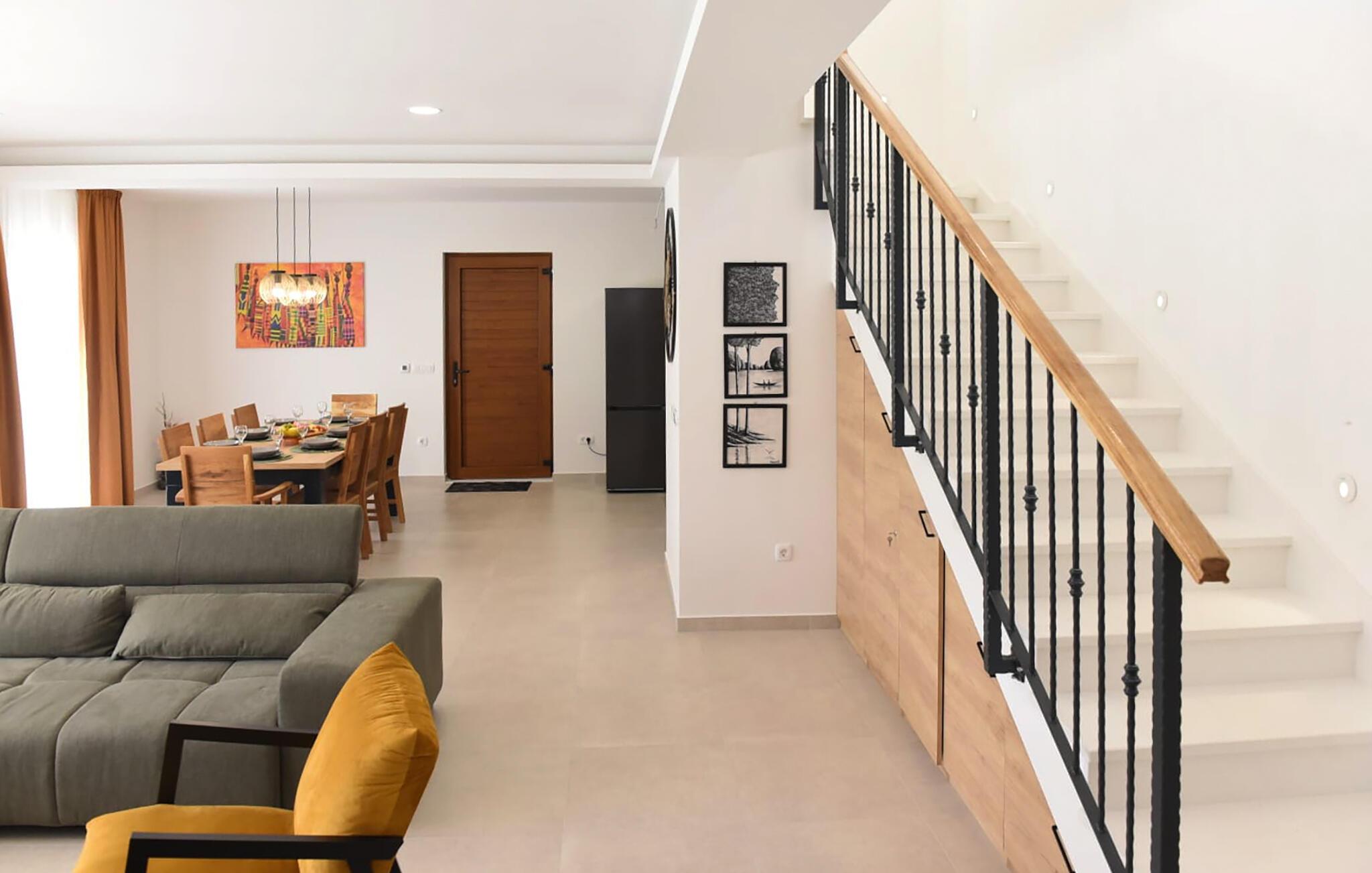Dieses großzügige Urlaubsdomizil begeistert mit reichlich Platz für eine Gruppe oder mehrere Familien, einer stilvollen Inneneinrichtung und zahlreichen Extras für Groß und Klein. Zelebrieren Sie gesellige Kochabende in der offenen, modernen Küche und nehmen Sie am langen Esstisch Platz. Fordern Sie sich am Kickertisch heraus oder machen Sie es sich auf der gemütlichen Couch bequem und streamen Sie Ihre Lieblingsserie.