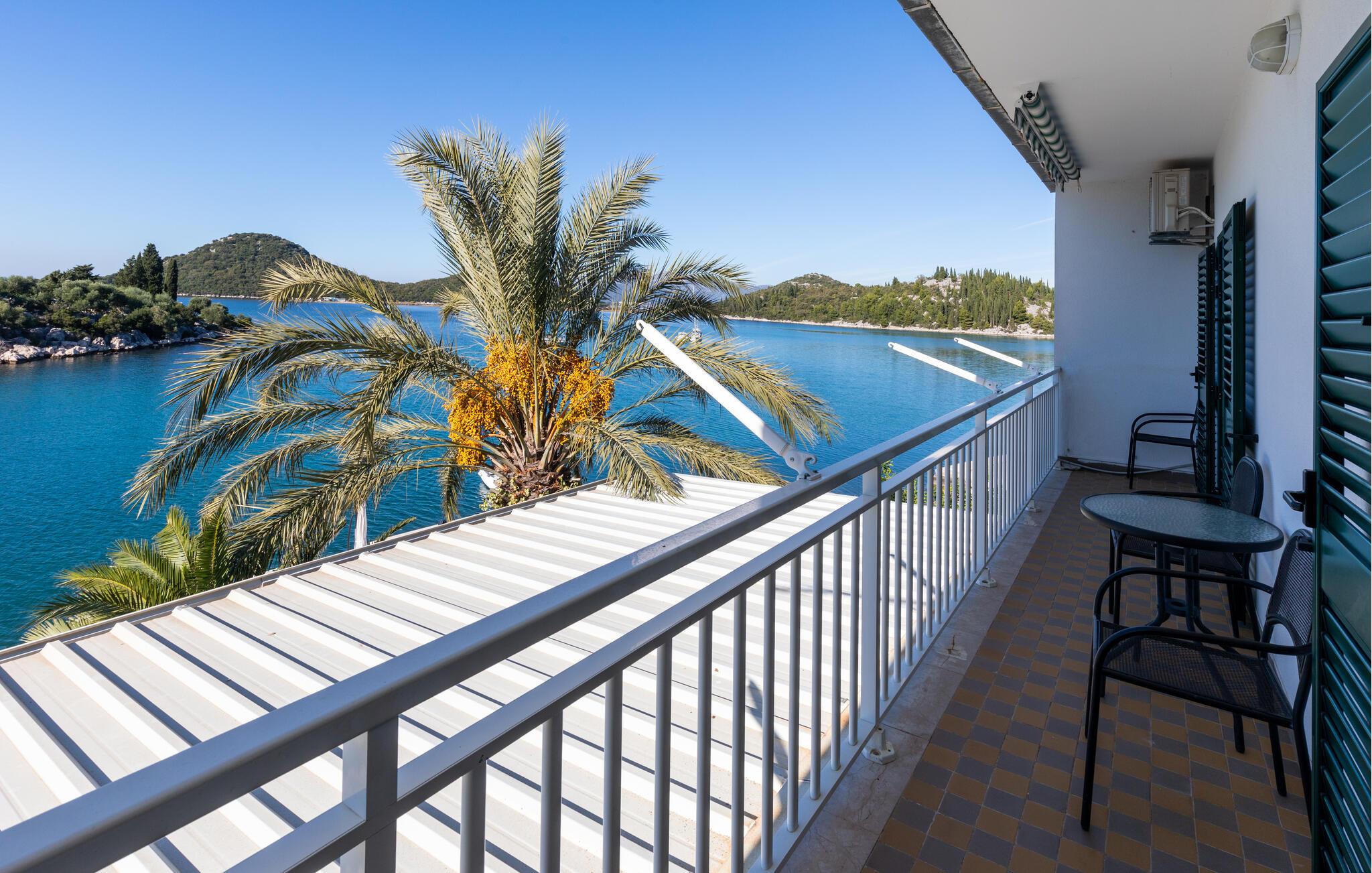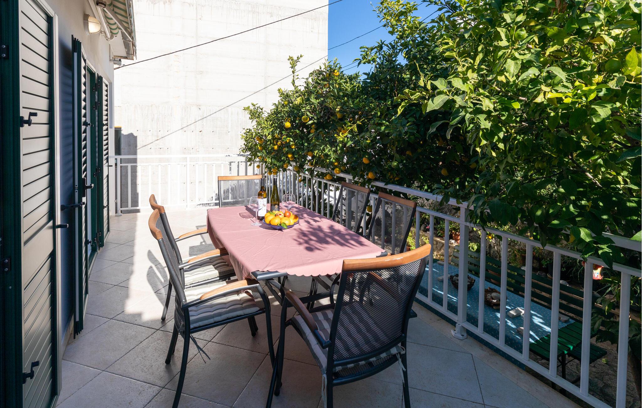 Treten Sie hinaus auf den Balkon und freuen Sie sich beim bezaubernden Blick aufs Meer auf einen herrlichen Urlaubstag. Spazieren Sie zum schönen Badeplateau hinunter und genießen Sie die friedliche Atmosphäre auf der Sonnenliege. Im Hinterhof können Sie die gemeinschaftliche Grillterrasse nutzen und im Schatten der Zitrusbäume bei einem Glas Wein plaudern.