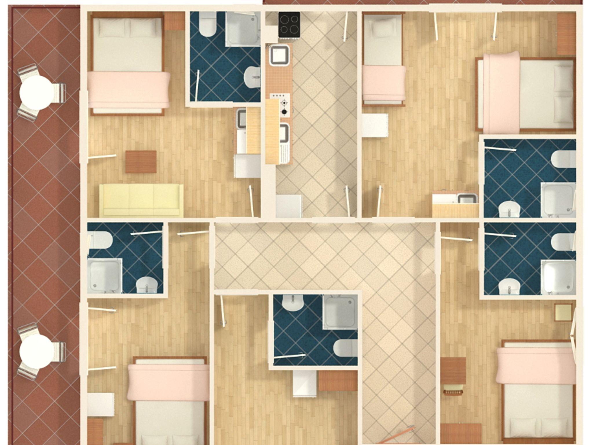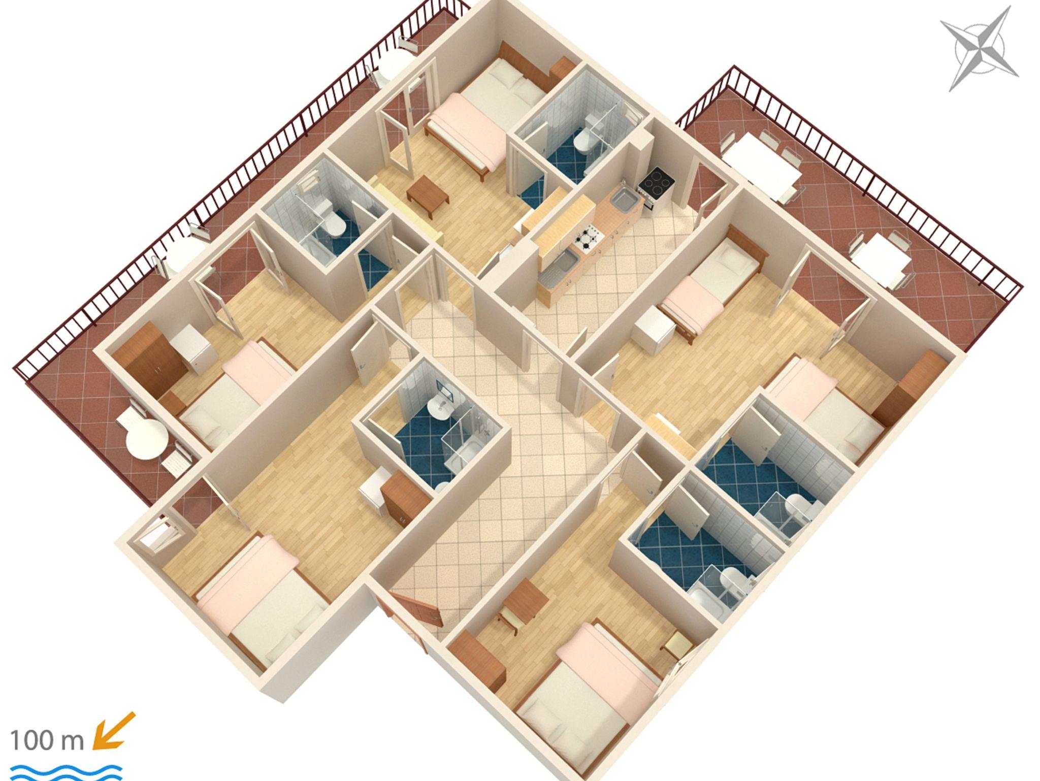 Ferienwohnung bietet Platz für 10 Gäste. Die Betten sind in Schlafzimmern, die es 5 gibt, innerhalb einer Gesamtfläche von 83m2, angeordnet. Die Gäste haben eine eigene Terrasse zur Verfügung, auf der sie in warmen Sommernächten genießen können. Es ist erlaubt, Speisen auf dem Gemeinschafts-Grill vorzubereiten. IM PREIS INBEGRIFFEN: Kurtaxe, Endreinigung, Klimatisierung, Parkplatz, Internet, Bügeleisen, Bügelbrett, Föhn. VERBINDLICHE ZUSÄTZLICHE KOSTEN: Aufzahlung für Kurzaufenthalte (prozentualer Zuschlag pro Nächtigungsanzahl: 30% - 1, 20% - 2, 10% - 3). UNVERBINDLICHE ZUSÄTZLICHE KOSTEN: Zusatzbett (15,00 € pro Nacht). Die Verfügbarkeit zusätzlicher Dienstleistungen in Ihrem reservierten Termin und die Preise derselben (falls nicht aufgeführt) müssen im Voraus überprüft werden. Zusätzliche Dienstleistungen die in der Zahlungsaufforderung nicht aufgeführt sind werden direkt beim Vermieter bezahlt, angenommen der Gast nutzt auch diese. Ermäßigung auf den Grundpreis: Gratistag 28=25 (bei einem Aufenthalt von 28 oder mehr Tagen erhalten Sie 3 kostenlose Tage für den Aufenthalt bis 31.12.26).
