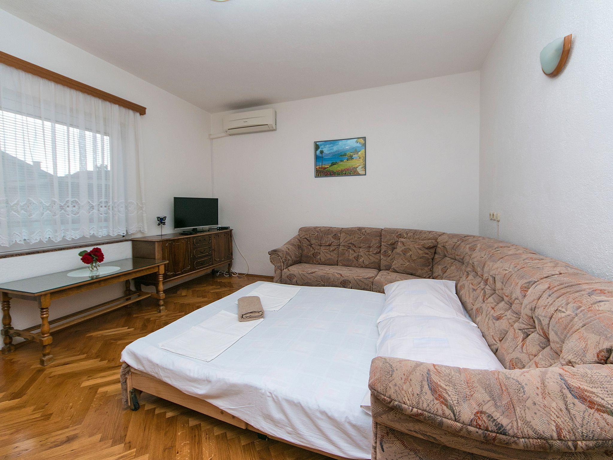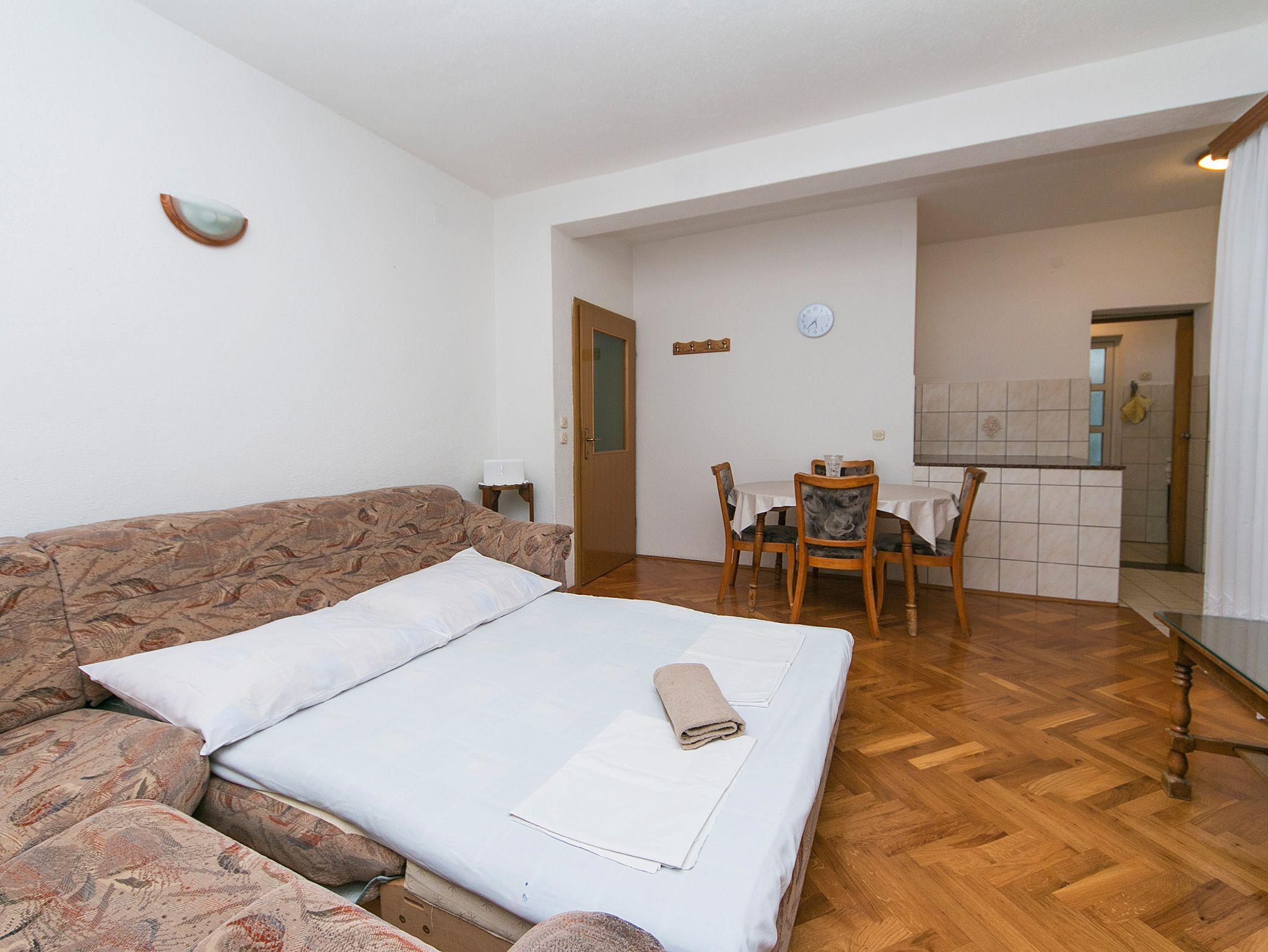 Ferienwohnung bietet Platz für 4 Gäste. Die Betten sind in Schlafzimmern, die es 1 gibt, und in Wohnzimmer, innerhalb einer Gesamtfläche von 45m2, angeordnet. Die Gäste haben eine eigene Terrasse zur Verfügung, auf der sie in warmen Sommernächten genießen können. Es ist erlaubt, Speisen auf dem Gemeinschafts-Grill vorzubereiten. Durch die Terrasse der gebuchten Unterkunftseinheit gehen auch andere Gäste oder Vermieter. IM PREIS INBEGRIFFEN: Kurtaxe, Endreinigung, Klimatisierung, Parkplatz, Internet, tragbarer Grill. VERBINDLICHE ZUSÄTZLICHE KOSTEN: Aufzahlung für Kurzaufenthalte (prozentualer Zuschlag pro Nächtigungsanzahl: 30% - 1, 20% - 2, 10% - 3). Die Verfügbarkeit zusätzlicher Dienstleistungen in Ihrem reservierten Termin und die Preise derselben (falls nicht aufgeführt) müssen im Voraus überprüft werden. Zusätzliche Dienstleistungen die in der Zahlungsaufforderung nicht aufgeführt sind werden direkt beim Vermieter bezahlt, angenommen der Gast nutzt auch diese. Ermäßigung auf den Grundpreis: Gratistag 28=25 (bei einem Aufenthalt von 28 oder mehr Tagen erhalten Sie 3 kostenlose Tage für den Aufenthalt bis 31.12.26).