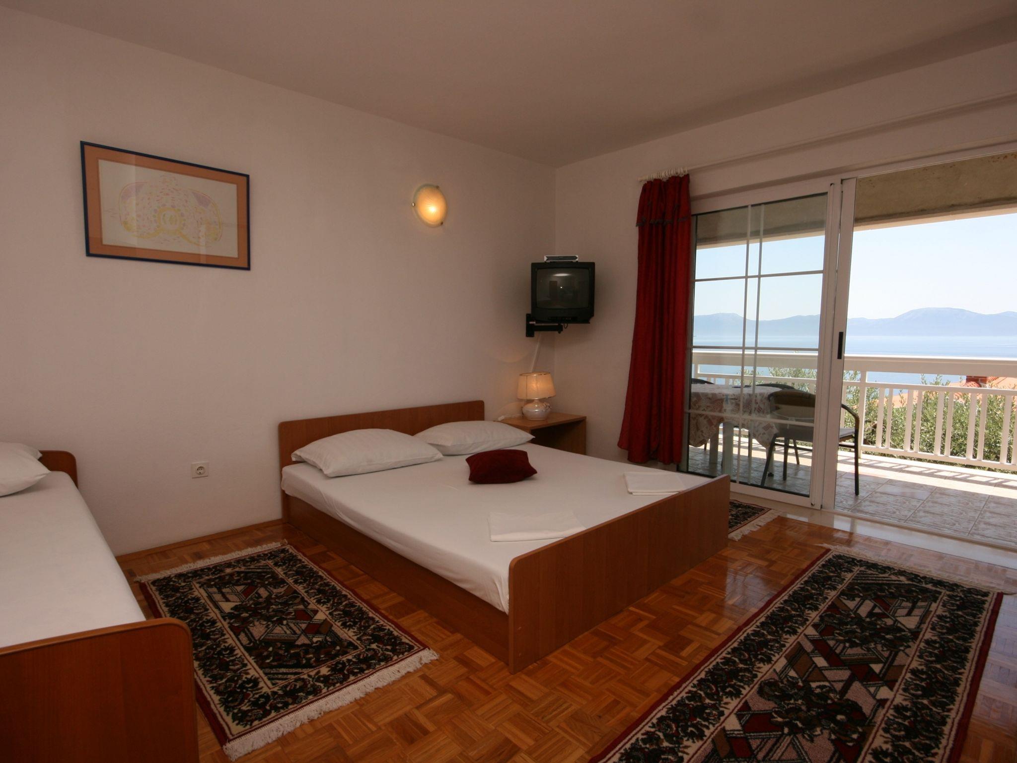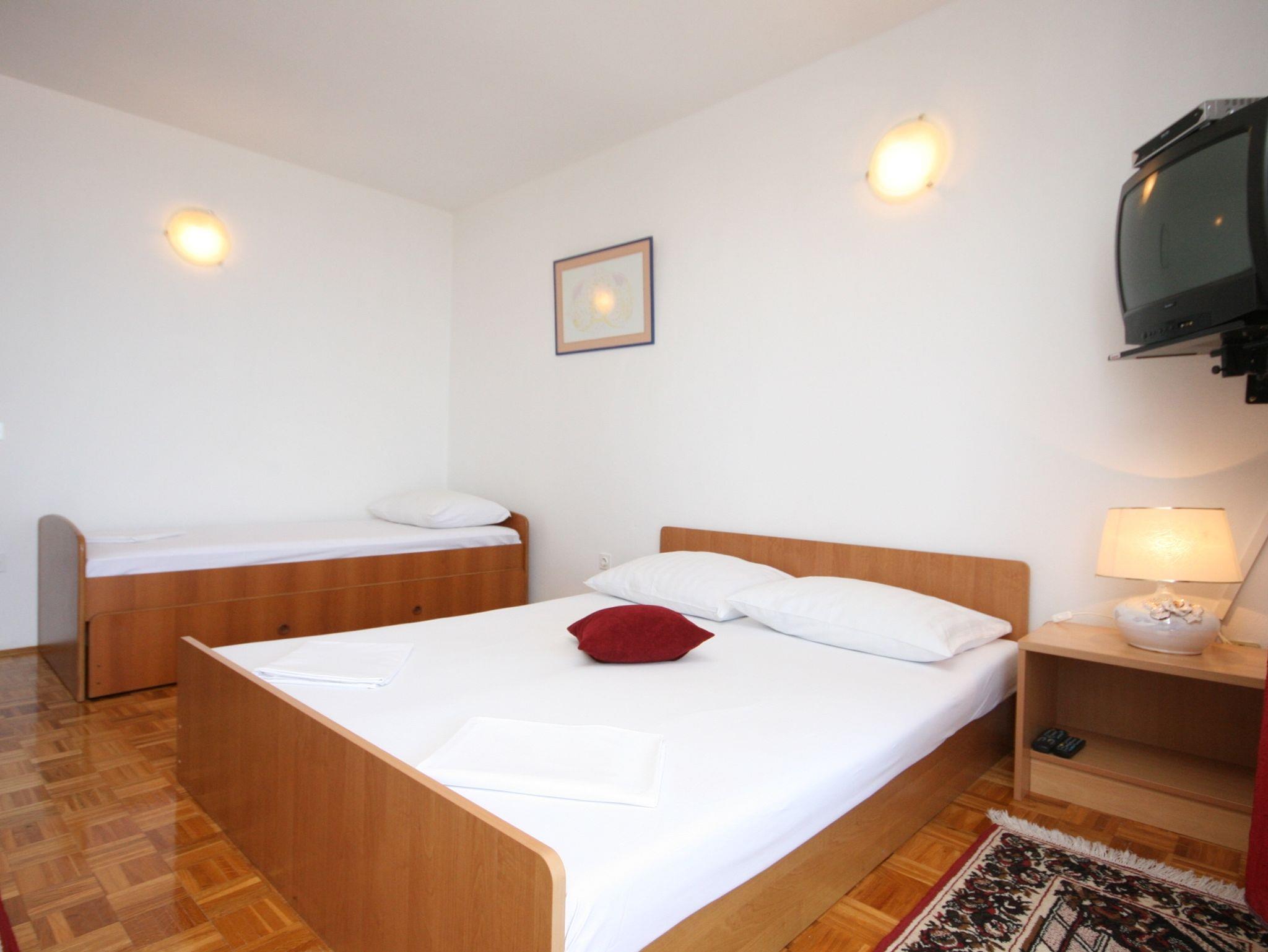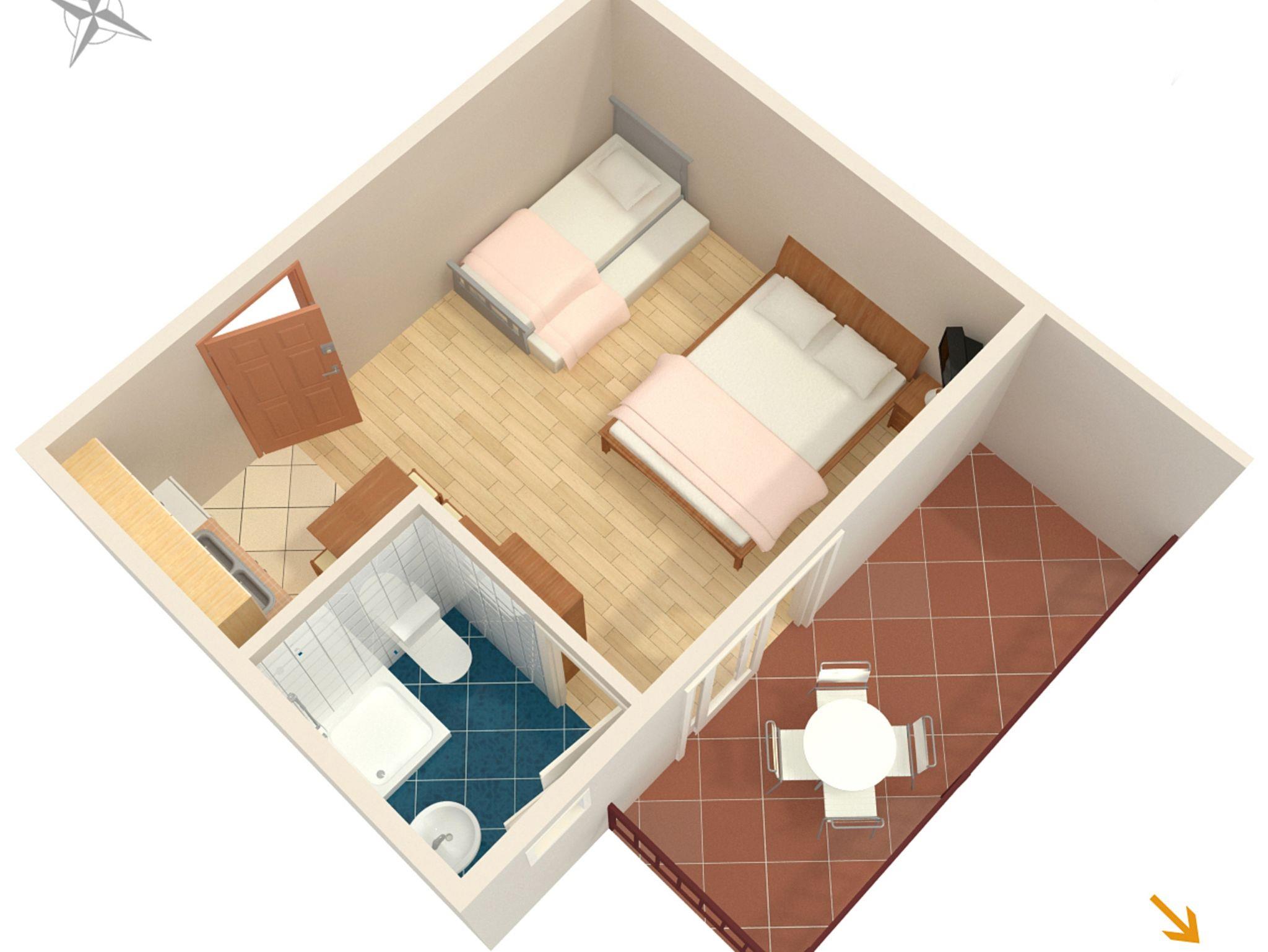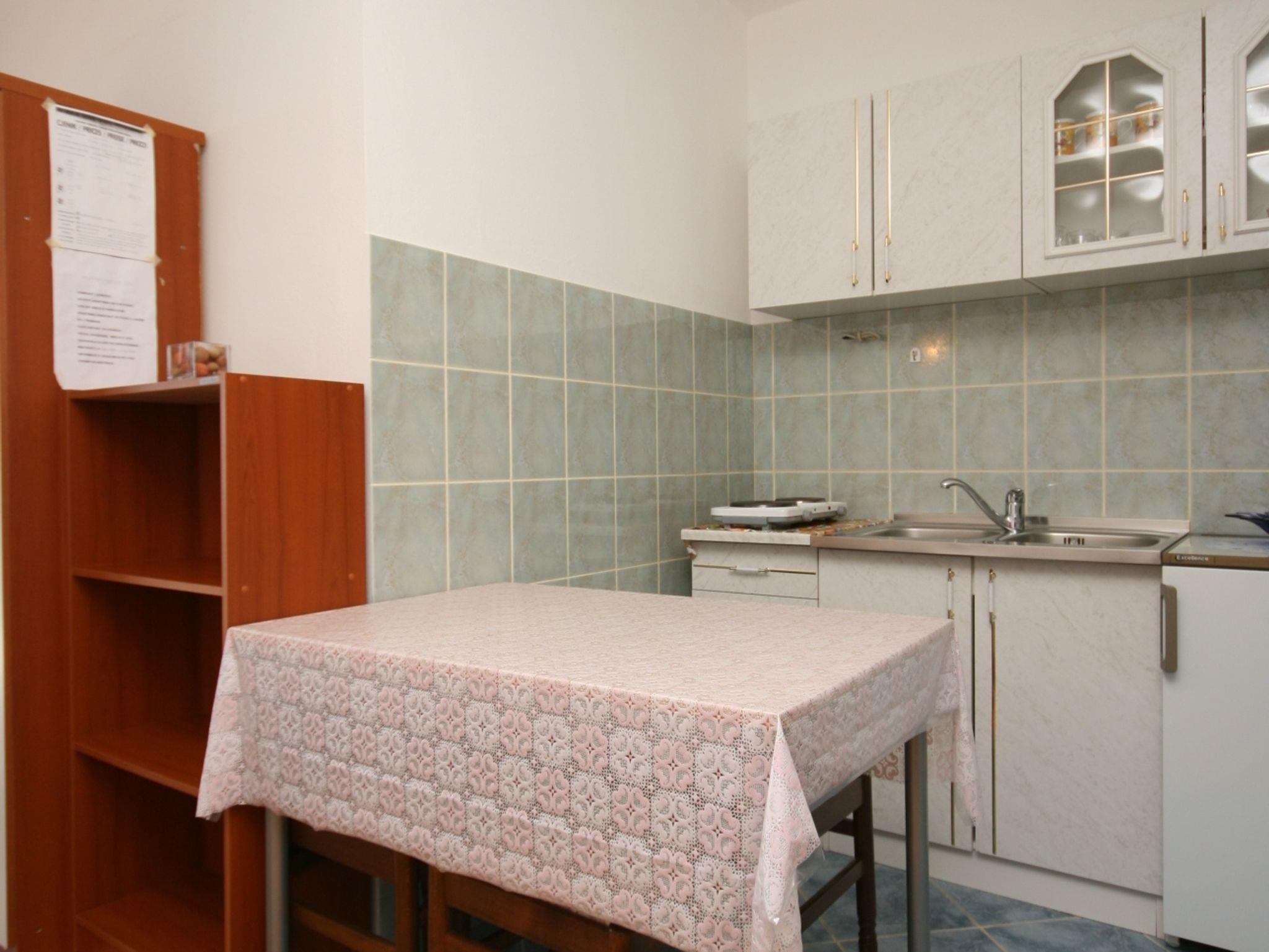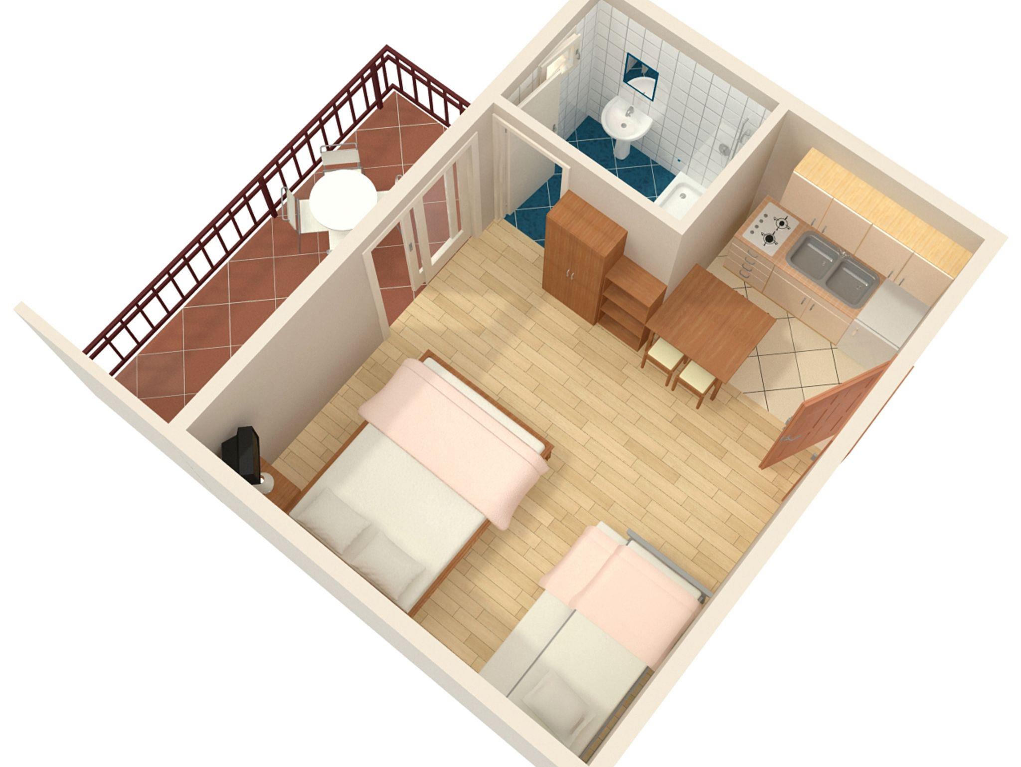Studio bietet Platz für 3 Gäste. Die Betten sind in Schlafzimmern, die es 1 gibt, innerhalb einer Gesamtfläche von 24m2, angeordnet. Die Gäste haben eine eigene Terrasse zur Verfügung, auf der sie in warmen Sommernächten genießen können. Das Studio-Apartment bietet Meerblick. IM PREIS INBEGRIFFEN: Kurtaxe, Endreinigung, Parkplatz, Internet, Kinderbett, Bügeleisen, Bügelbrett, Föhn, Sonnenschirm, Liegestühle. VERBINDLICHE ZUSÄTZLICHE KOSTEN: Aufzahlung für Kurzaufenthalte (prozentualer Zuschlag pro Nächtigungsanzahl: 30% - 1, 20% - 2, 10% - 3). UNVERBINDLICHE ZUSÄTZLICHE KOSTEN: Klimatisierung (8,00 € pro Nacht). Die Verfügbarkeit zusätzlicher Dienstleistungen in Ihrem reservierten Termin und die Preise derselben (falls nicht aufgeführt) müssen im Voraus überprüft werden. Zusätzliche Dienstleistungen die in der Zahlungsaufforderung nicht aufgeführt sind werden direkt beim Vermieter bezahlt, angenommen der Gast nutzt auch diese. Ermäßigung auf den Grundpreis: Gratistag 14=13 (bei einem Aufenthalt von 14 Tagen oder mehr erhalten Sie einen Gratistag für den Aufenthalt bis 31.12.26).