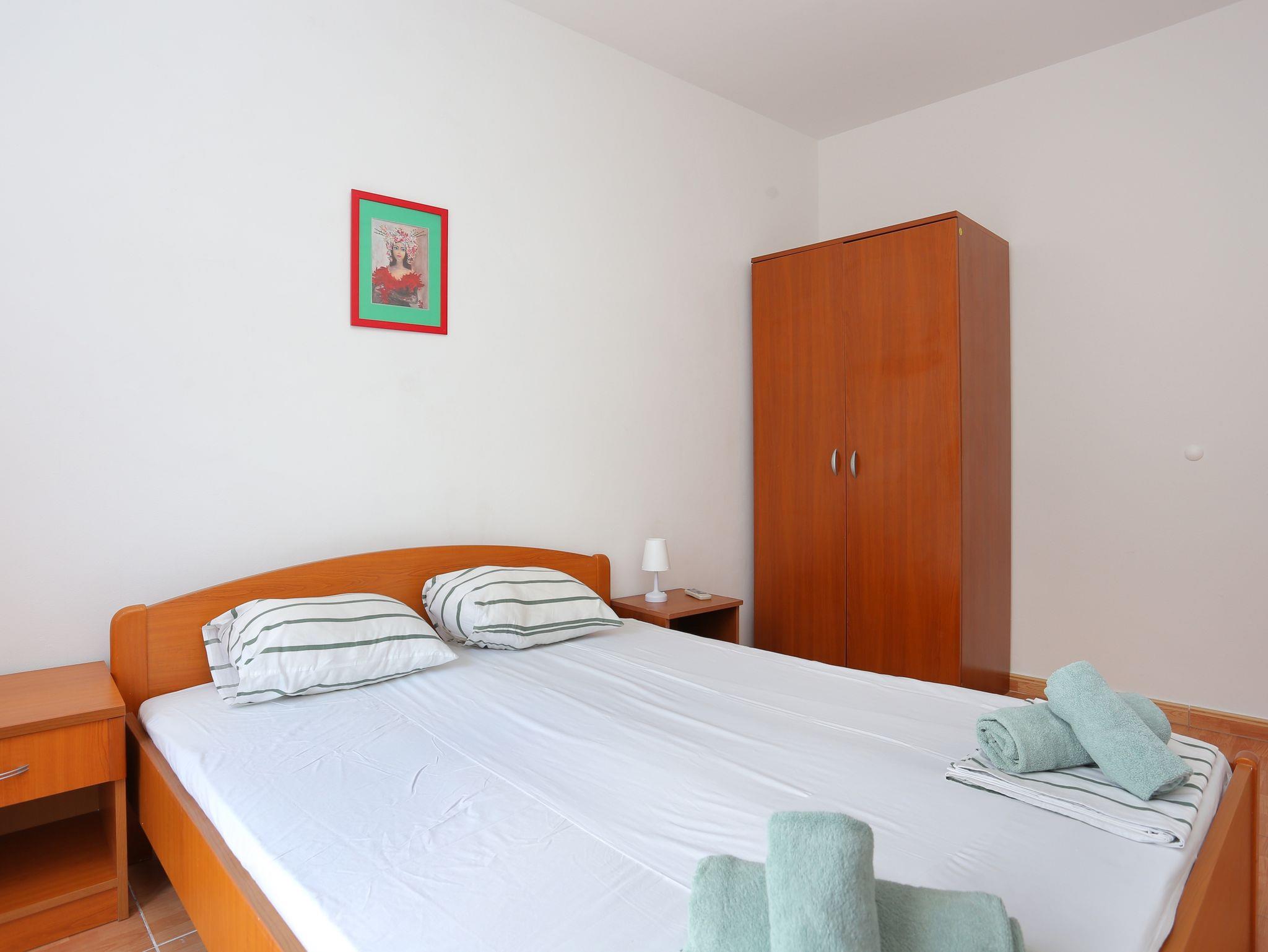 Ferienwohnung bietet Platz für 4 Gäste. Die Betten sind in Schlafzimmern, die es 1 gibt, und in Esszimmer, innerhalb einer Gesamtfläche von 24m2, angeordnet. Die Gäste haben eine eigene Terrasse zur Verfügung, auf der sie in warmen Sommernächten genießen können. IM PREIS INBEGRIFFEN: Kurtaxe, Endreinigung, Klimatisierung, Parkplatz, Internet, Bügeleisen, Bügelbrett, Föhn. VERBINDLICHE ZUSÄTZLICHE KOSTEN: Aufzahlung für Kurzaufenthalte (prozentualer Zuschlag pro Nächtigungsanzahl: 30% - 1, 20% - 2, 10% - 3). UNVERBINDLICHE ZUSÄTZLICHE KOSTEN: Frühstück (7,00 €, 50% Nachlass für Kinder zwischen 4 und 12 Jahren, Kinder bis 4 Jahre sind frei.), Halbpension (15,00 €, 50% Nachlass für Kinder zwischen 4 und 12 Jahren, Kinder bis 4 Jahre sind frei.), Vollpension (23,00 €, 50% Nachlass für Kinder zwischen 4 und 12 Jahren, Kinder bis 4 Jahre sind frei.), Zusatzbett (10,00 € pro Nacht). Die Verfügbarkeit zusätzlicher Dienstleistungen in Ihrem reservierten Termin und die Preise derselben (falls nicht aufgeführt) müssen im Voraus überprüft werden. Zusätzliche Dienstleistungen die in der Zahlungsaufforderung nicht aufgeführt sind werden direkt beim Vermieter bezahlt, angenommen der Gast nutzt auch diese. Ermäßigung auf den Grundpreis: Gratistag 14=13 (bei einem Aufenthalt von 14 Tagen oder mehr erhalten Sie einen Gratistag für den Aufenthalt bis 31.12.26).