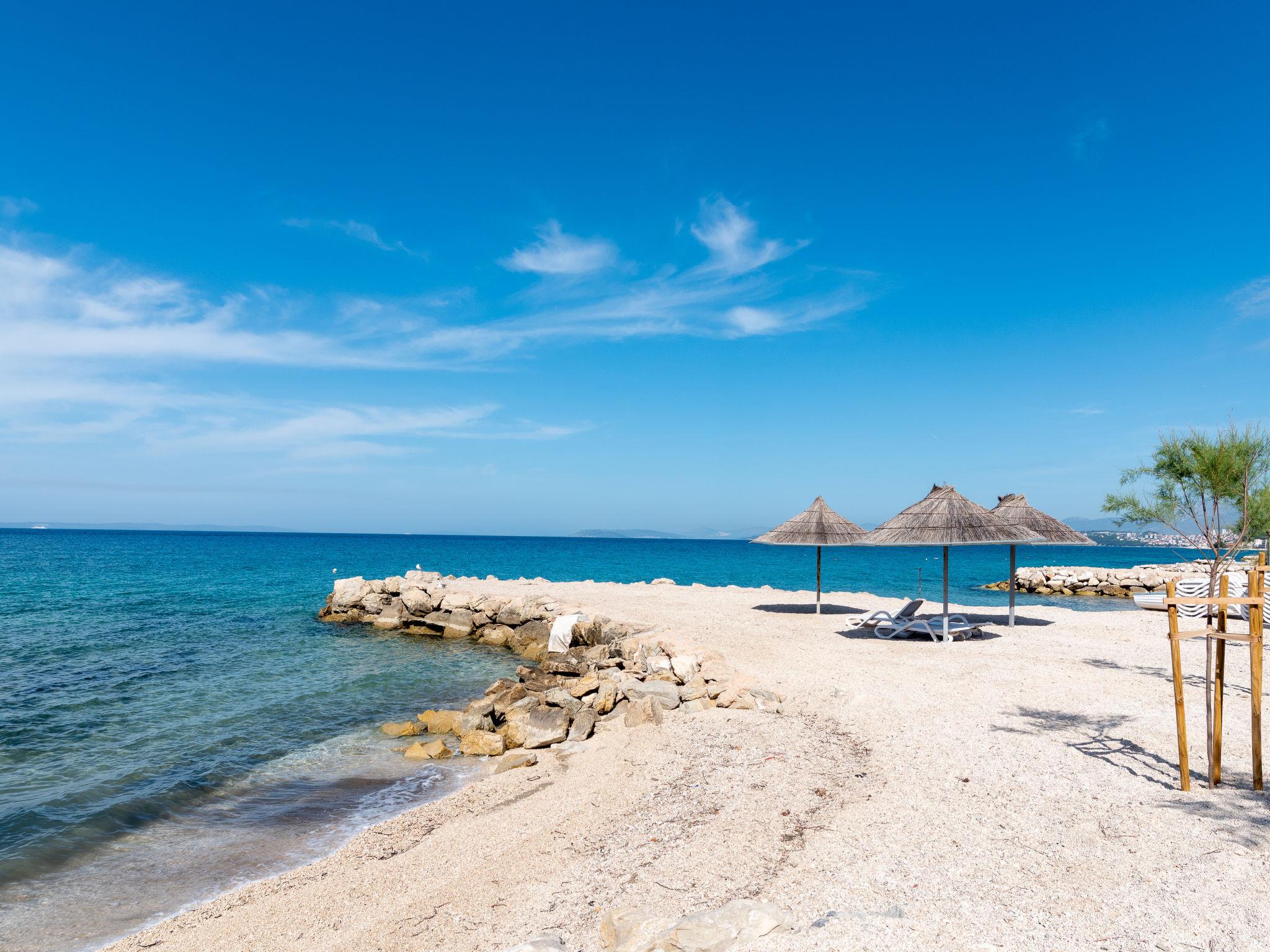 Apartment house. 500 m from the centre of Podstrana, 10 km from the centre of Split, in a sunny position, traffic calmed area, 5 m from the sea, 5 m from the beach, direct access to the beach. For shared use: property 300 m2. In the house: internet access, washing machine (for shared use). Parking at 400 m. Shop 100 m, restaurant 5 m, bus stop 240 m, pebble beach 5 m. Marina 3 km, tennis 3 km, riding stable 4 km. Please note: Loading and unloading of baggage is possible at the holiday house.