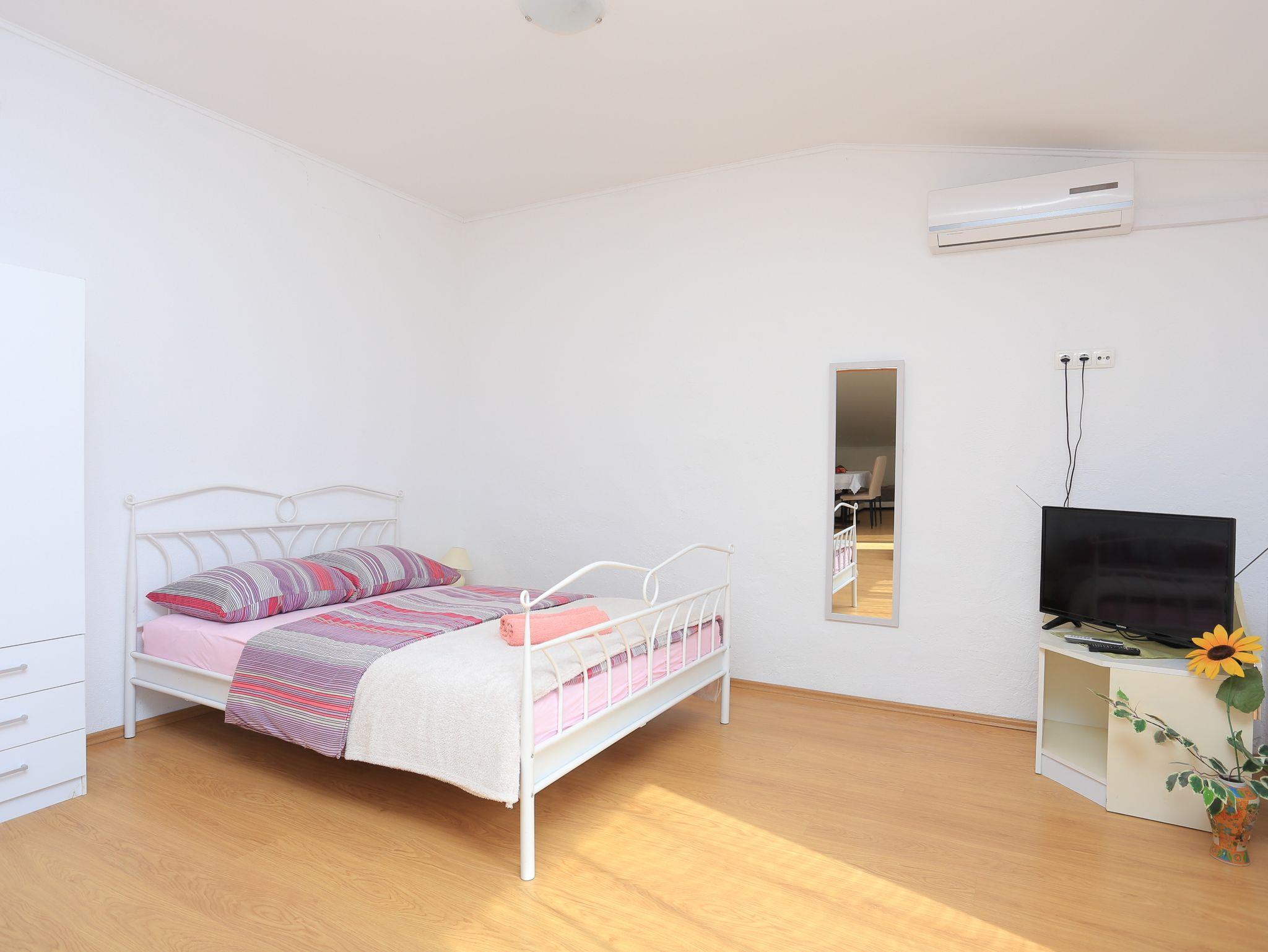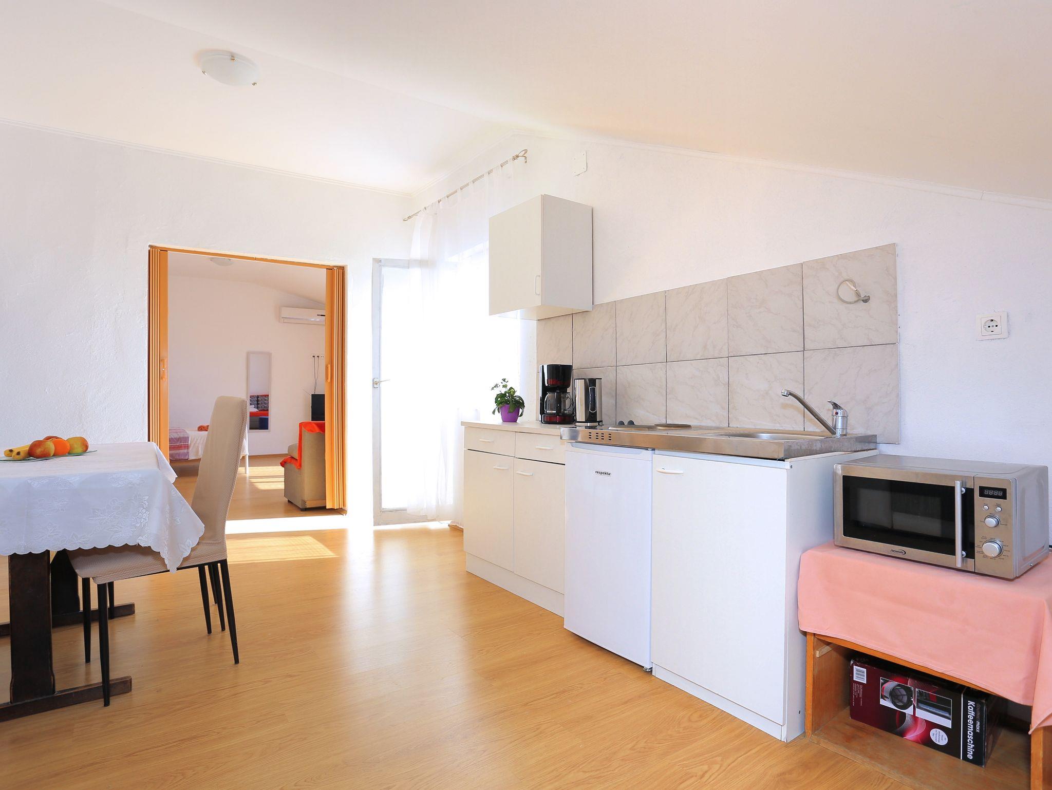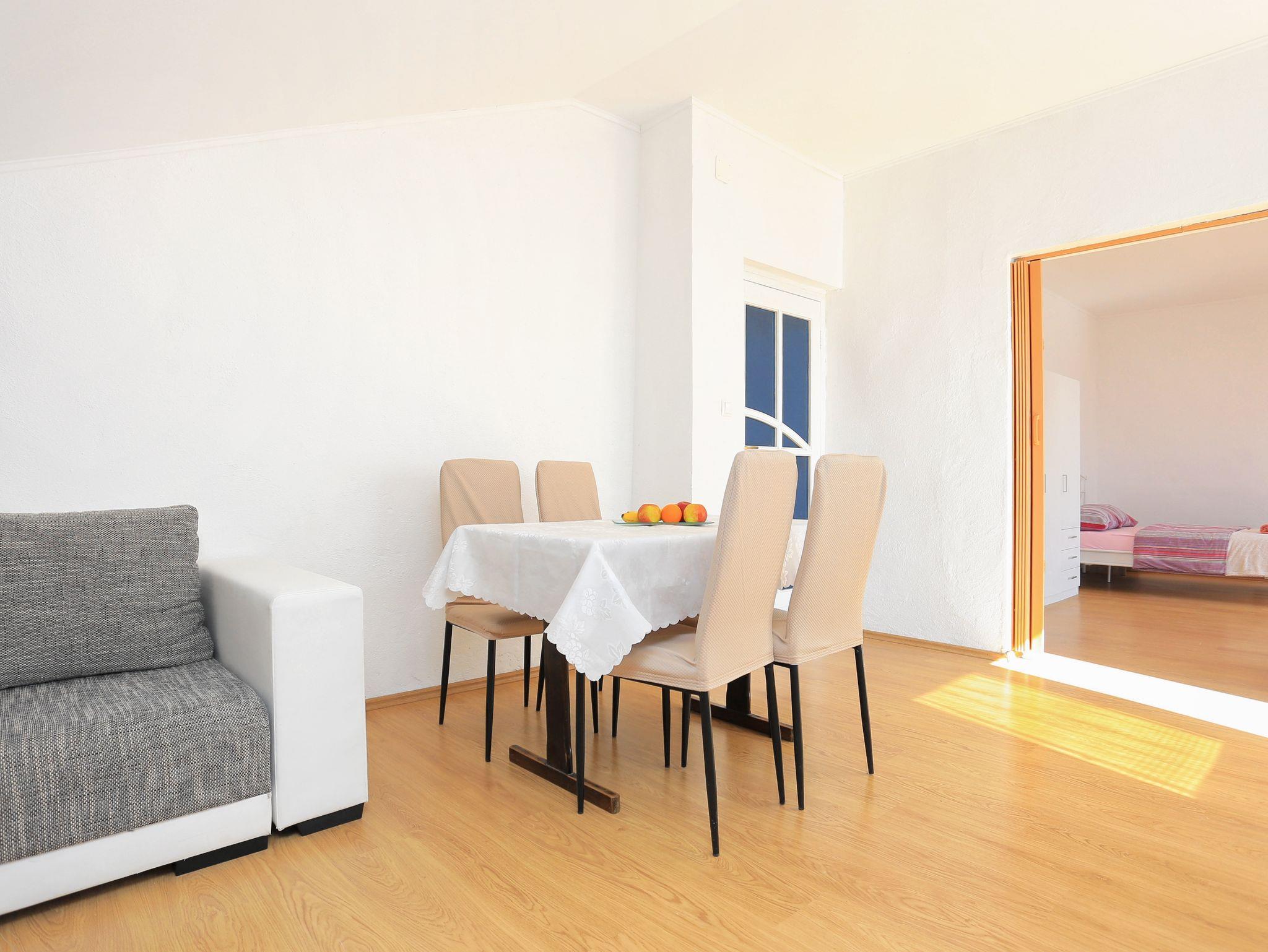 Studio bietet Platz für 4 Gäste. Die Betten sind in Schlafzimmern, die es 1 gibt, und in Wohnzimmer und Esszimmer, innerhalb einer Gesamtfläche von 41m2, angeordnet. Die Gäste haben einen eigenen Balkon zur Verfügung, auf der sie in warmen Sommernächten genießen können. Das Studio-Apartment bietet Meerblick. IM PREIS INBEGRIFFEN: Kurtaxe, Endreinigung, Klimatisierung, Parkplatz, Internet, Bügeleisen, Bügelbrett, Föhn. VERBINDLICHE ZUSÄTZLICHE KOSTEN: Aufzahlung für Kurzaufenthalte (prozentualer Zuschlag pro Nächtigungsanzahl: 30% - 1, 20% - 2, 10% - 3). Die Verfügbarkeit zusätzlicher Dienstleistungen in Ihrem reservierten Termin und die Preise derselben (falls nicht aufgeführt) müssen im Voraus überprüft werden. Zusätzliche Dienstleistungen die in der Zahlungsaufforderung nicht aufgeführt sind werden direkt beim Vermieter bezahlt, angenommen der Gast nutzt auch diese.