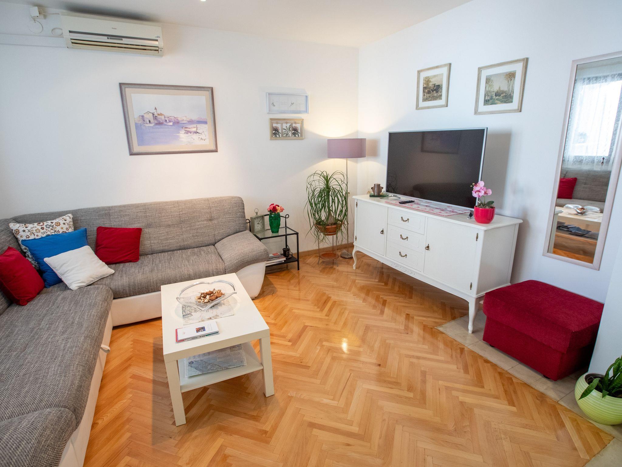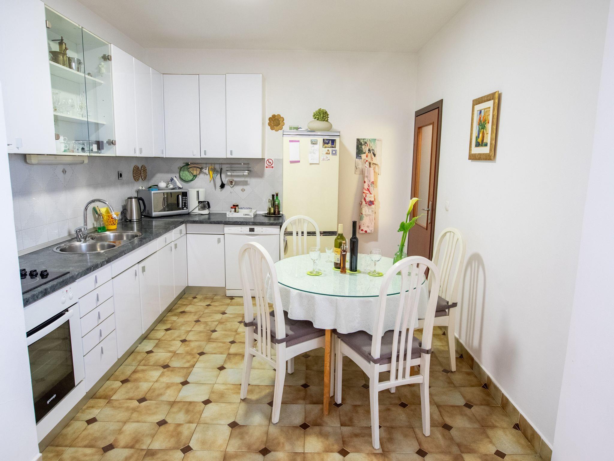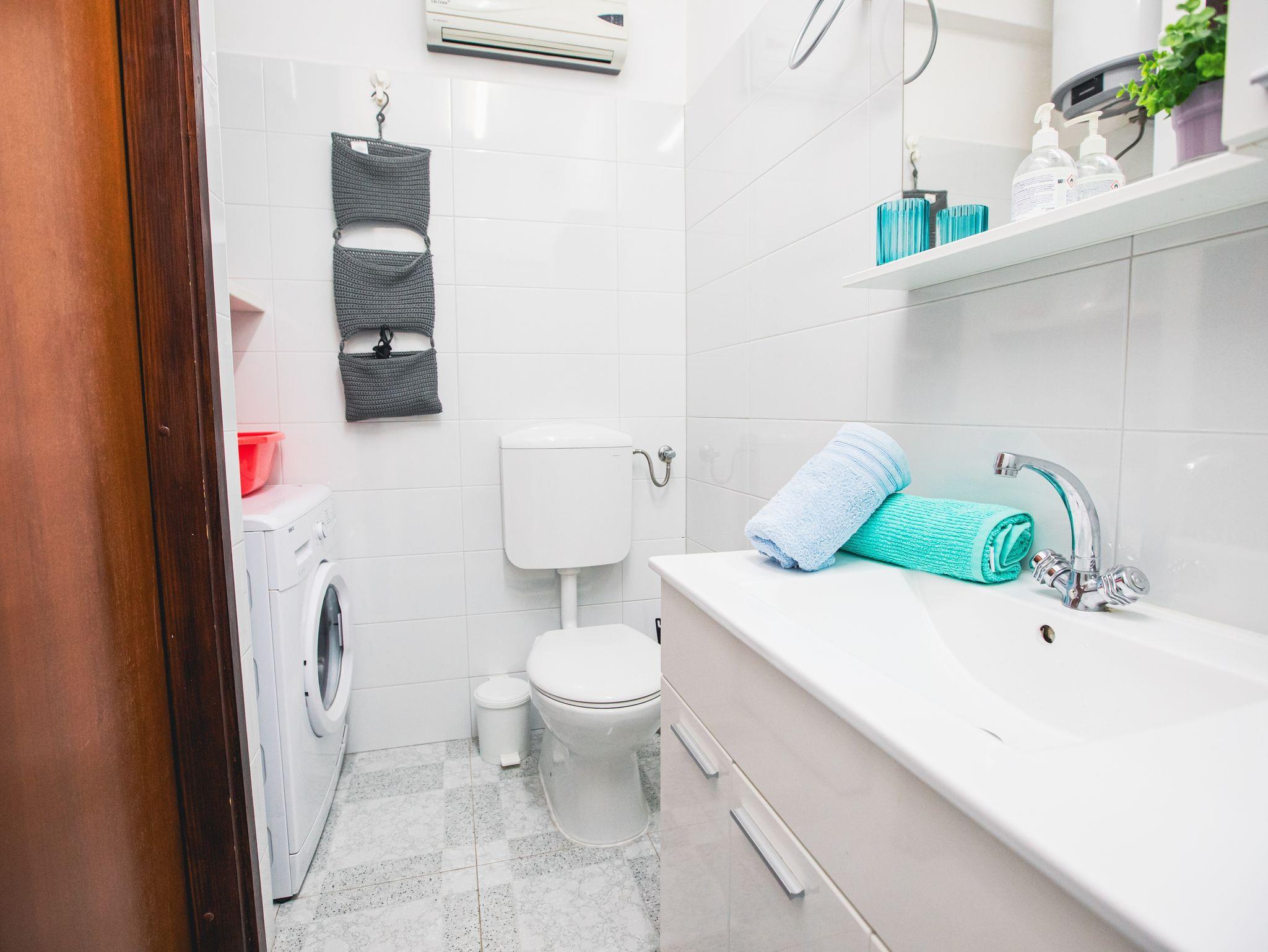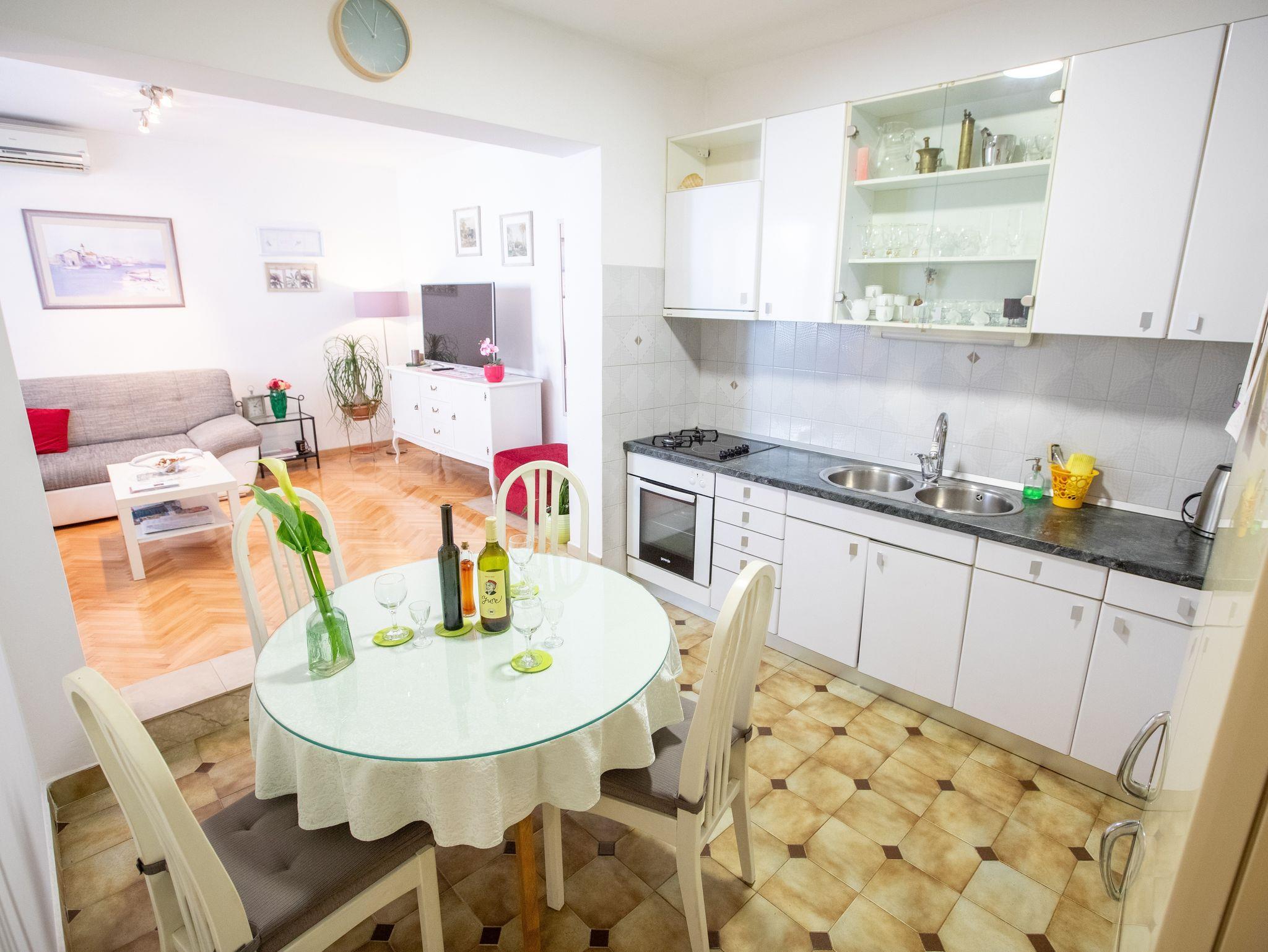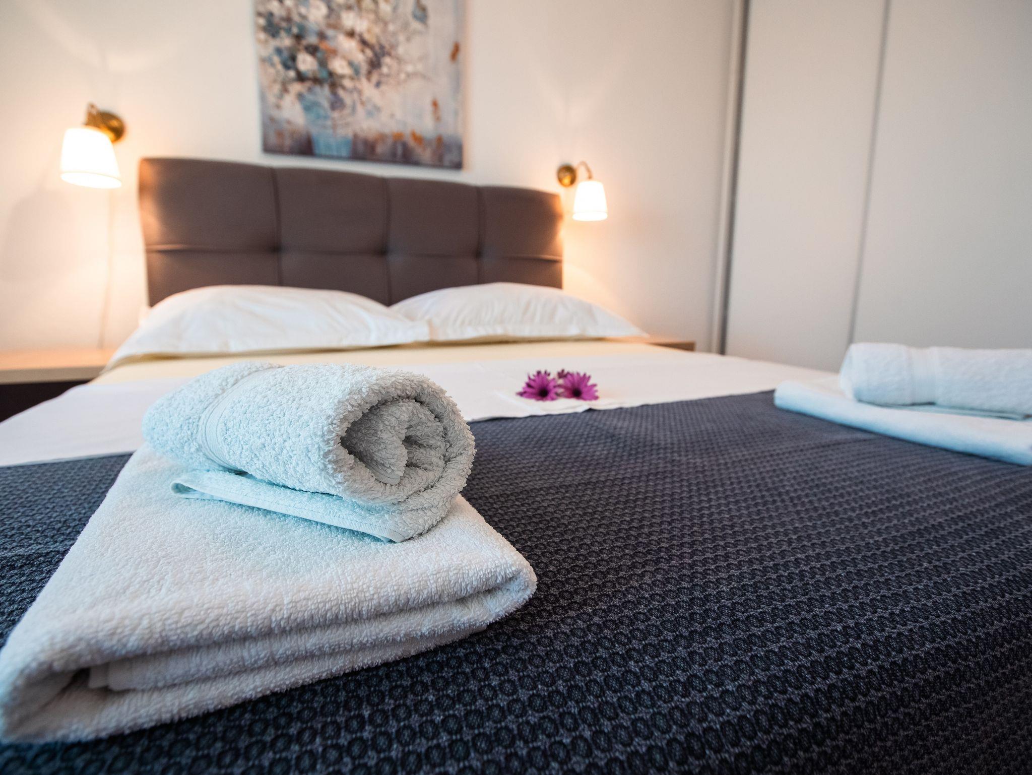Ferienwohnung bietet Platz für 6 Gäste. Die Betten sind in Schlafzimmern, die es 2 gibt, und in Wohnzimmer, innerhalb einer Gesamtfläche von 70m2, angeordnet. Die Gäste haben einen eigenen Balkon zur Verfügung, auf der sie in warmen Sommernächten genießen können. Das Apartment bietet Meerblick. Es ist erlaubt, Speisen auf dem Gemeinschafts-Grill vorzubereiten. IM PREIS INBEGRIFFEN: Kurtaxe, Endreinigung, Klimatisierung, Parkplatz, Internet, Kinderbett, Bügeleisen, Bügelbrett, Föhn. Die Verfügbarkeit zusätzlicher Dienstleistungen in Ihrem reservierten Termin und die Preise derselben (falls nicht aufgeführt) müssen im Voraus überprüft werden. Zusätzliche Dienstleistungen die in der Zahlungsaufforderung nicht aufgeführt sind werden direkt beim Vermieter bezahlt, angenommen der Gast nutzt auch diese.