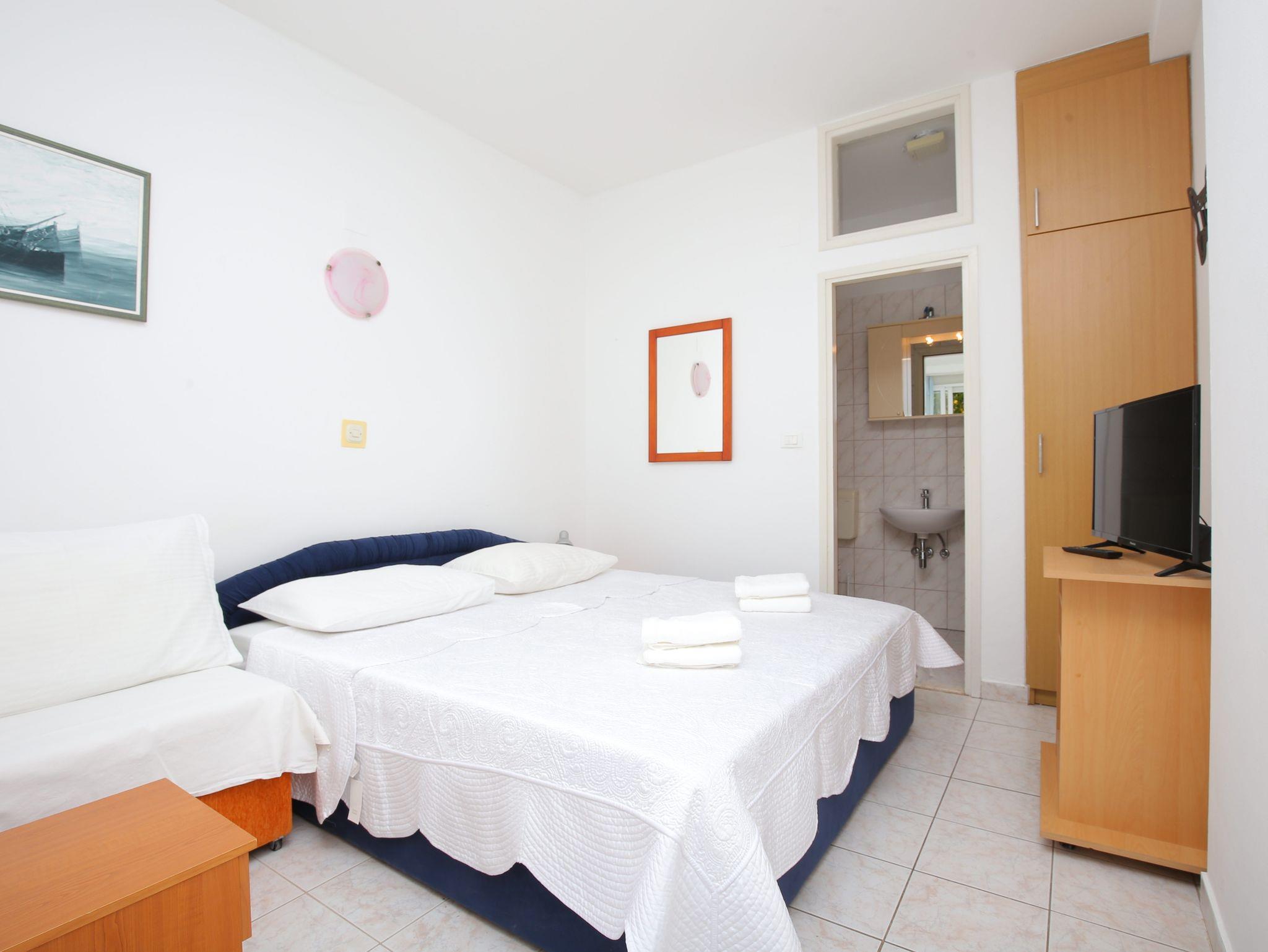 Studio bietet Platz für 2 Gäste. Die Betten sind in Schlafzimmern, die es 1 gibt, innerhalb einer Gesamtfläche von 21m2, angeordnet. Es ist erlaubt, Speisen auf dem Gemeinschafts-Grill vorzubereiten. Die reservierte Unterkunftseinheit verfügt über einen gemeinsame Terrasse. IM PREIS INBEGRIFFEN: Kurtaxe, Endreinigung, Klimatisierung, Parkplatz, Internet, Wäschewaschen, Bügeleisen, Bügelbrett, Föhn, tragbarer Grill, 1 Bett für Kinder (im Preis enthalten). Die Verfügbarkeit zusätzlicher Dienstleistungen in Ihrem reservierten Termin und die Preise derselben (falls nicht aufgeführt) müssen im Voraus überprüft werden. Zusätzliche Dienstleistungen die in der Zahlungsaufforderung nicht aufgeführt sind werden direkt beim Vermieter bezahlt, angenommen der Gast nutzt auch diese. Ermäßigung auf den Grundpreis: Gratistag 14=13 (bei einem Aufenthalt von 14 Tagen oder mehr erhalten Sie einen Gratistag für den Aufenthalt bis 31.12.26).