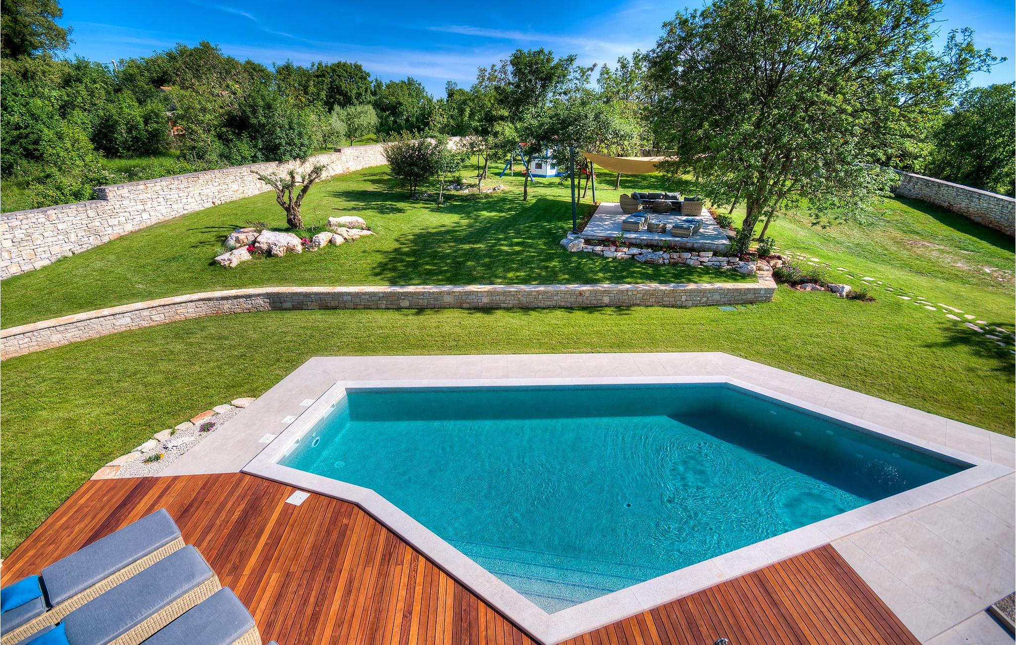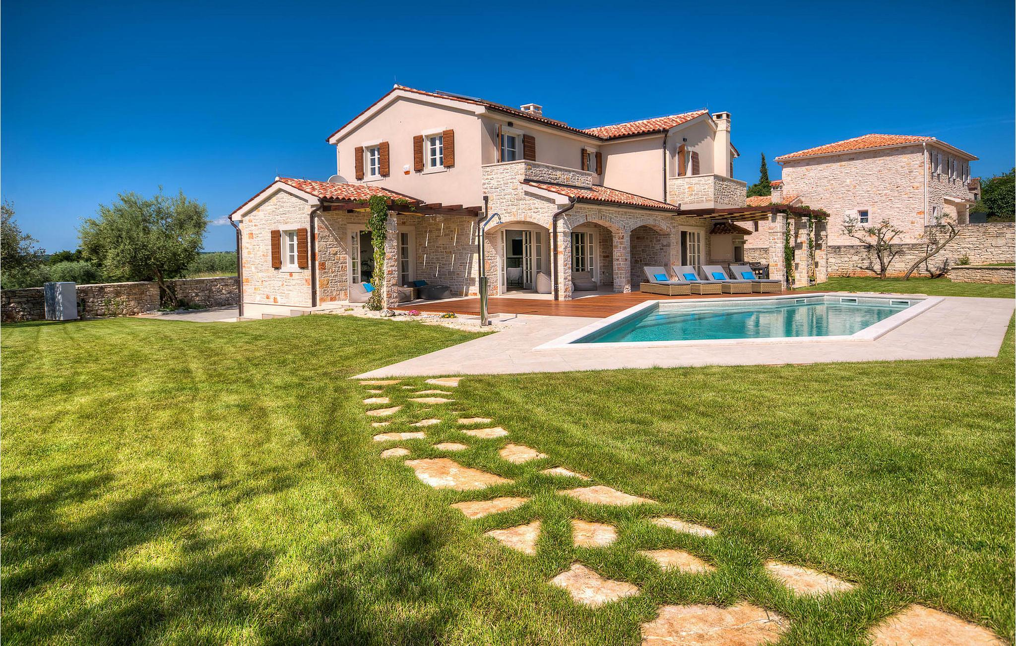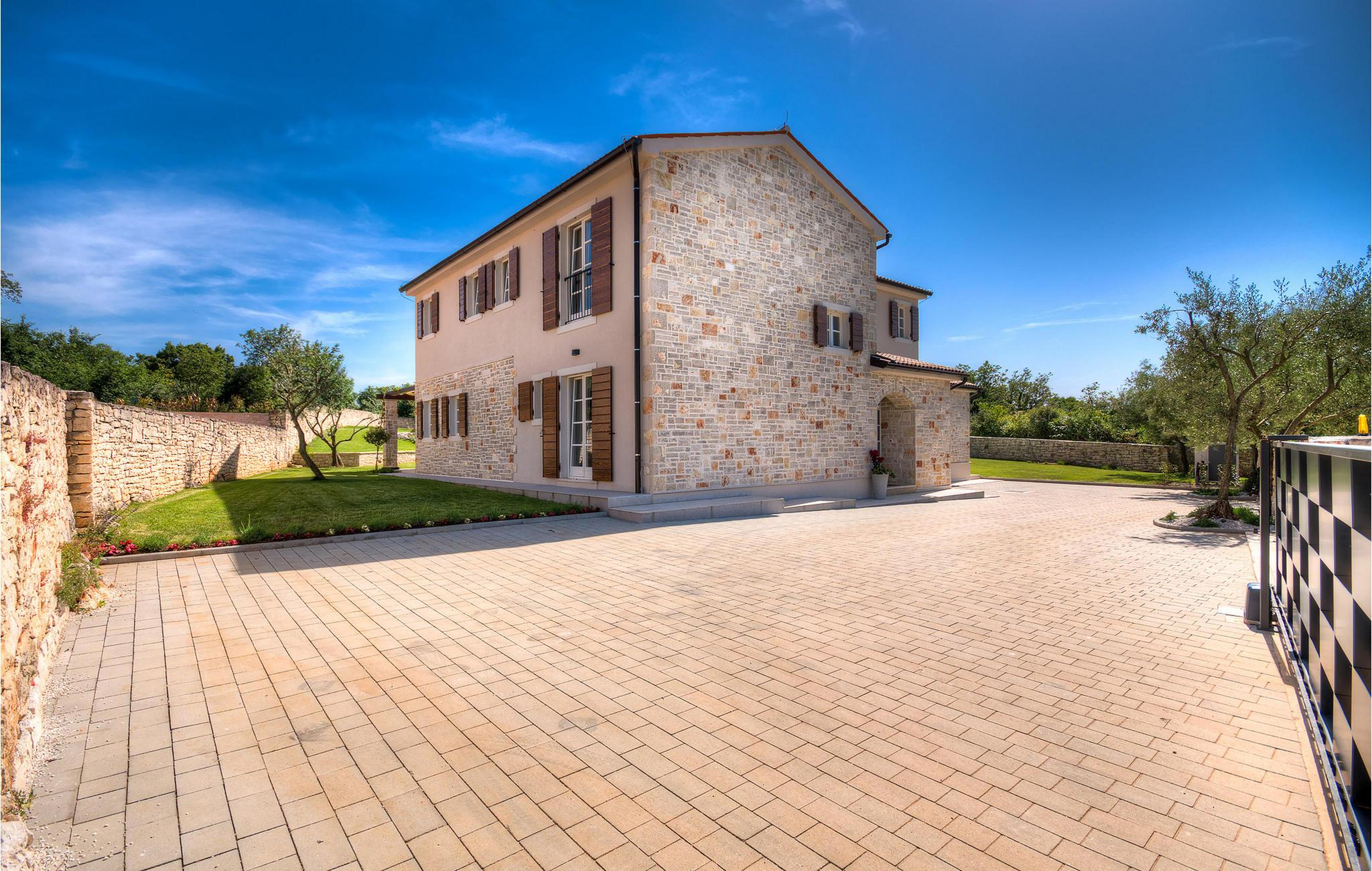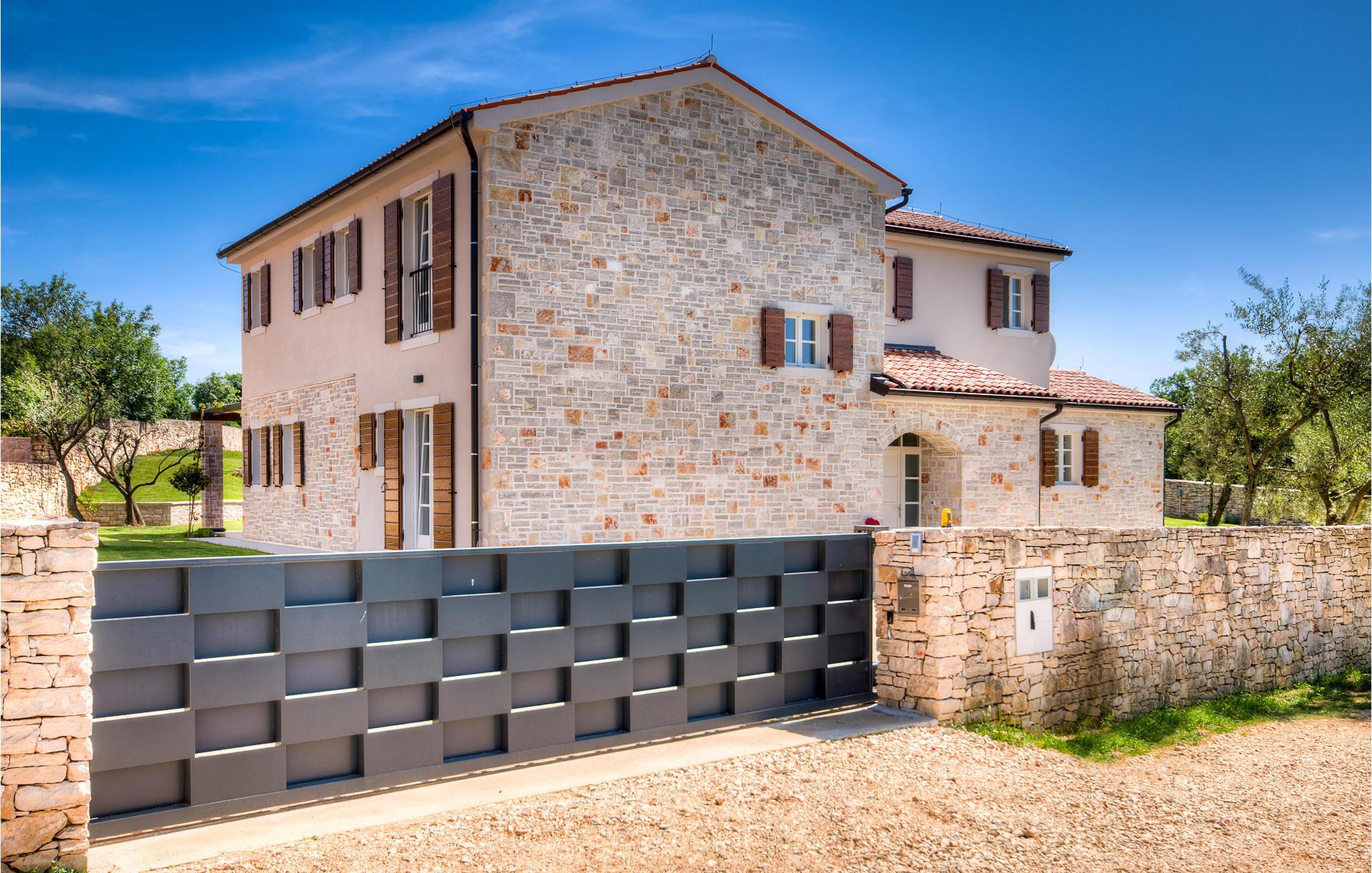 Diese charmante neu erbaute Villa ist das letzte Haus in einem kleinen traditionellen Steinhausdorf in der Nähe von Porec. Der Garten ist groß und umzäunt, um Ihnen Privatsphäre zu gewährleisten. Das Anwesen verfügt über einen schönen großen Pool, eine Lounge mit Blick auf das Haus und einen Kinderspielplatz.