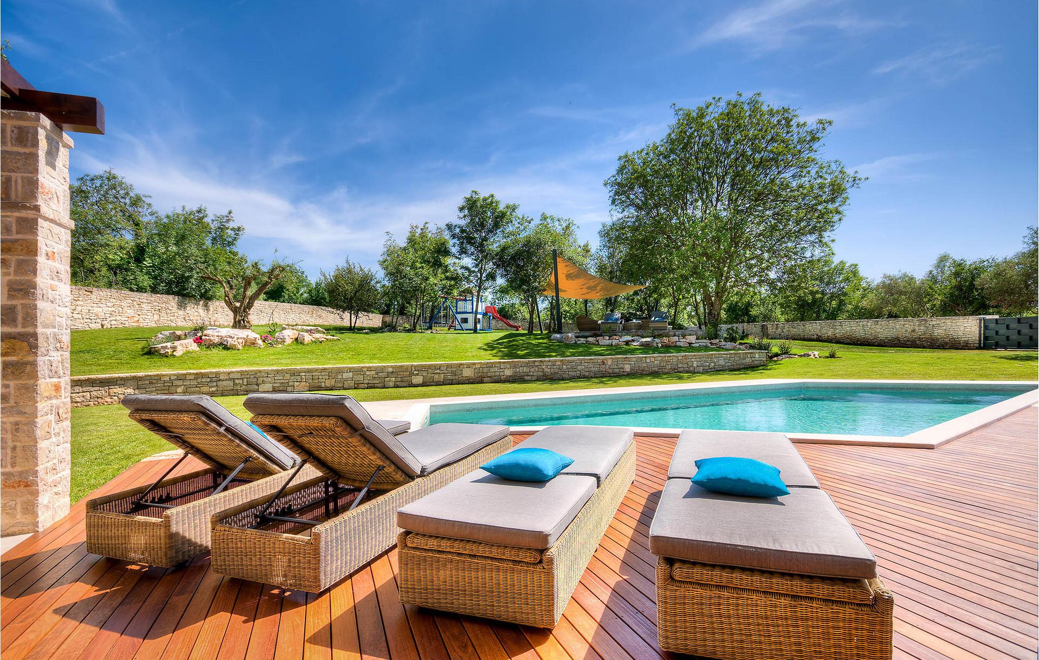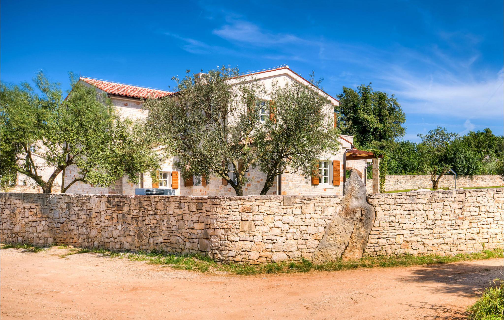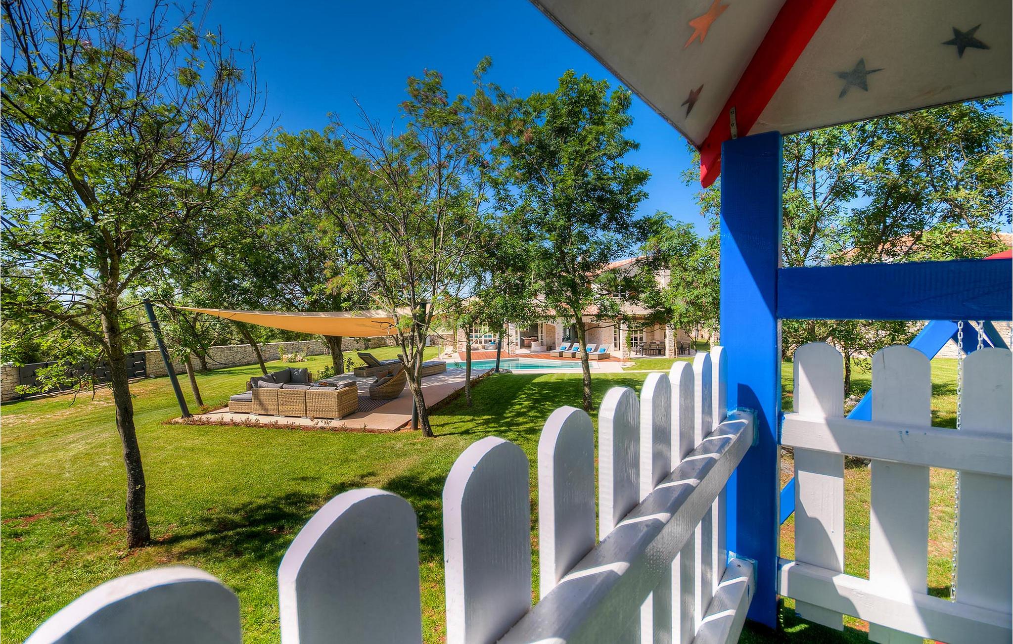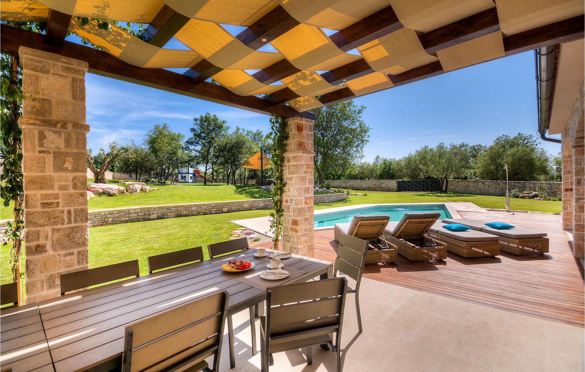 Diese charmante neu erbaute Villa ist das letzte Haus in einem kleinen traditionellen Steinhausdorf in der Nähe von Porec. Der Garten ist groß und umzäunt, um Ihnen Privatsphäre zu gewährleisten. Das Anwesen verfügt über einen schönen großen Pool, eine Lounge mit Blick auf das Haus und einen Kinderspielplatz.