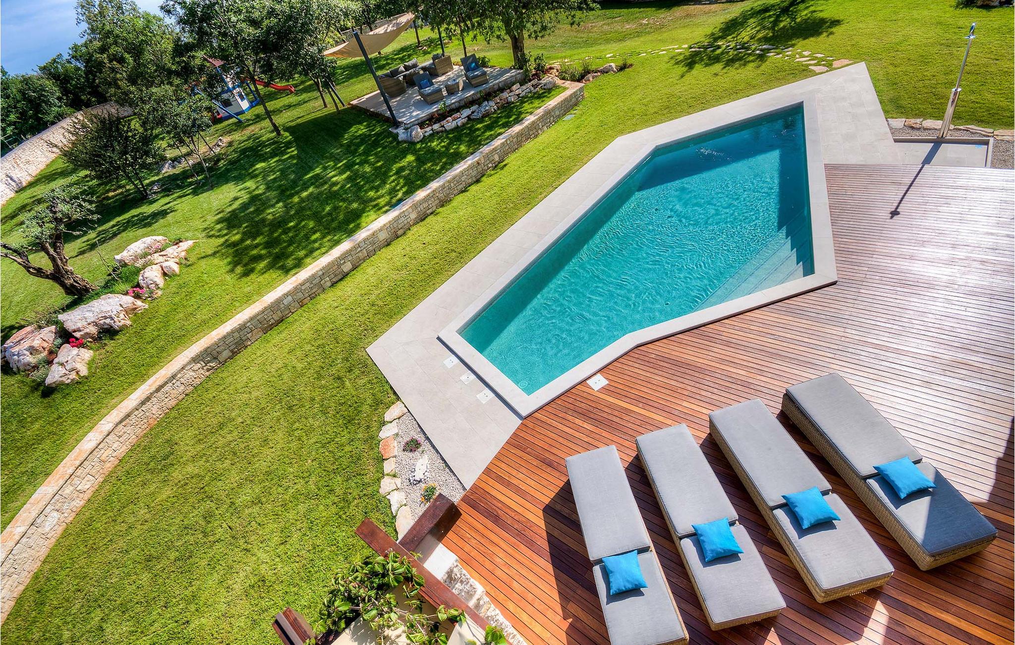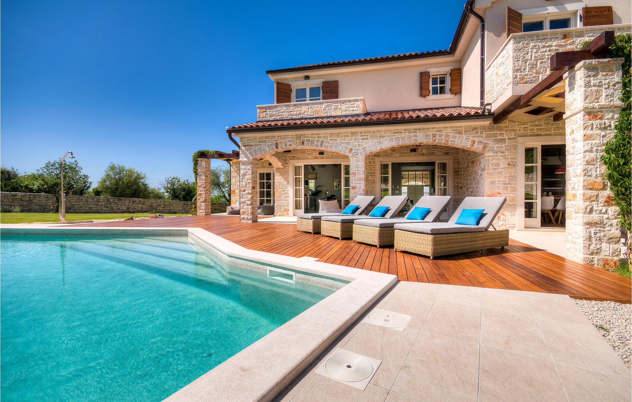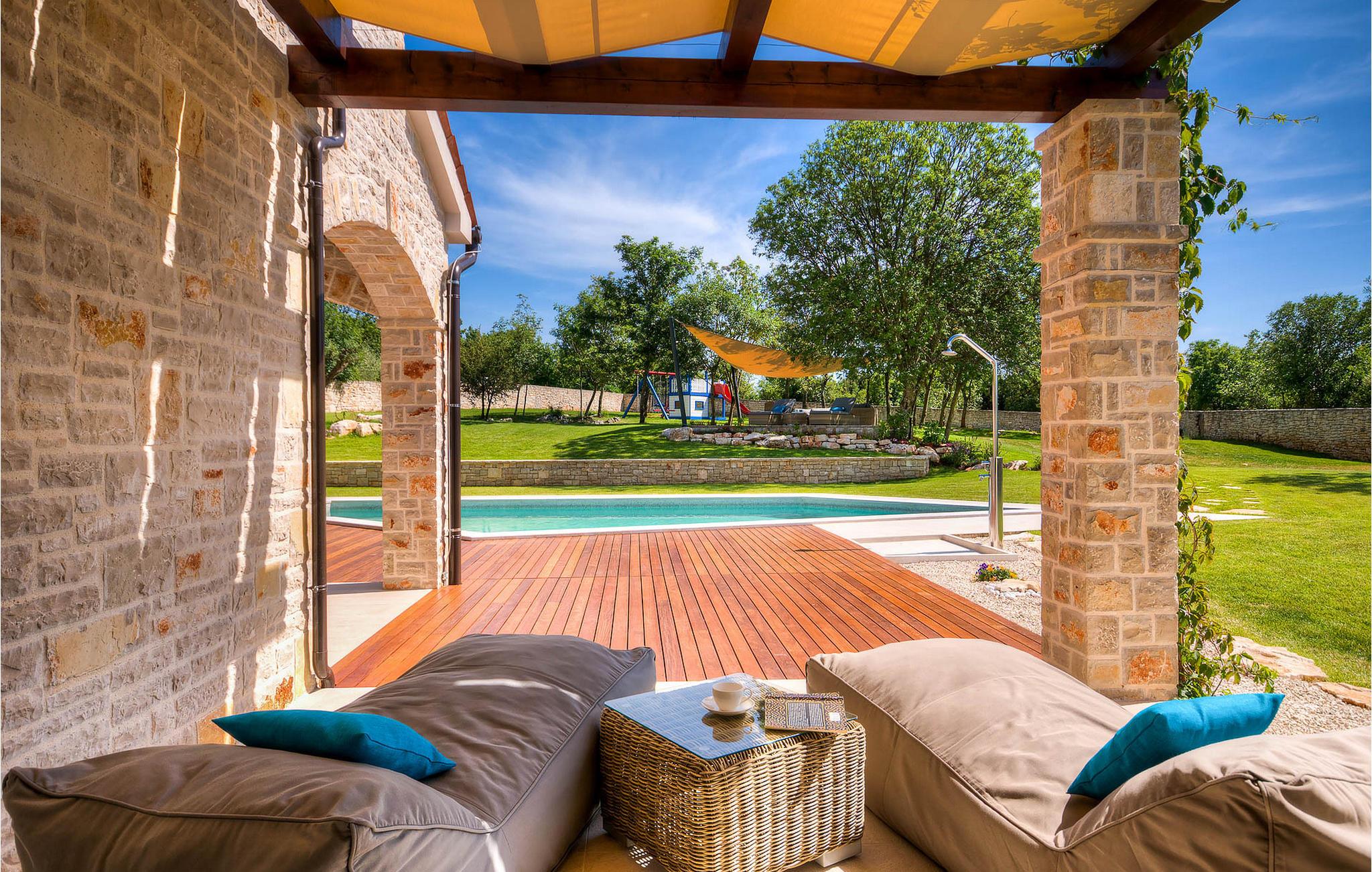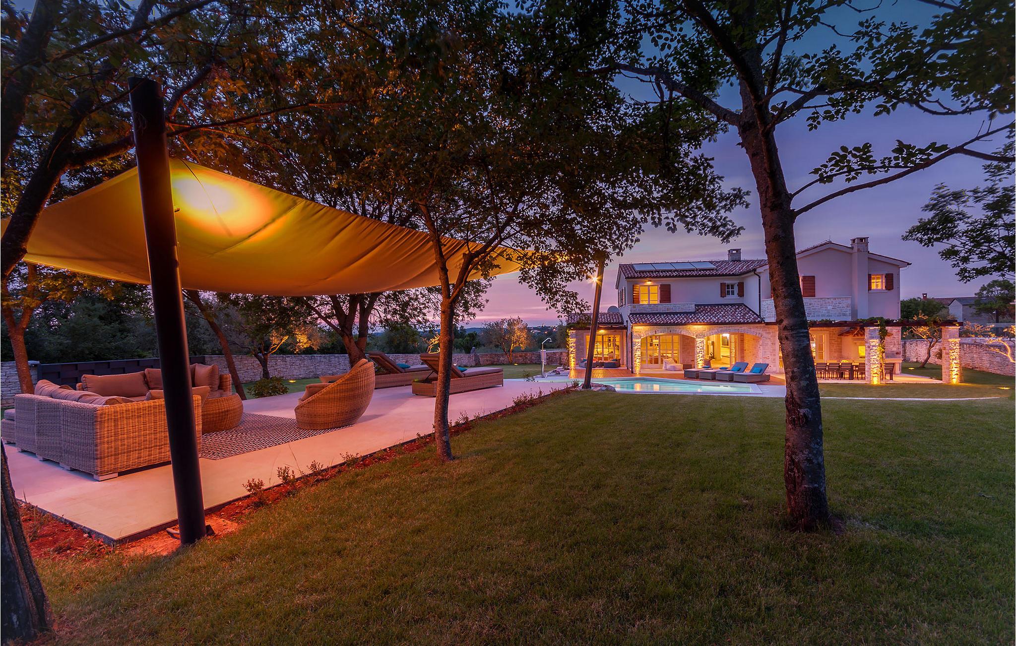 Diese charmante neu erbaute Villa ist das letzte Haus in einem kleinen traditionellen Steinhausdorf in der Nähe von Porec. Der Garten ist groß und umzäunt, um Ihnen Privatsphäre zu gewährleisten. Das Anwesen verfügt über einen schönen großen Pool, eine Lounge mit Blick auf das Haus und einen Kinderspielplatz.