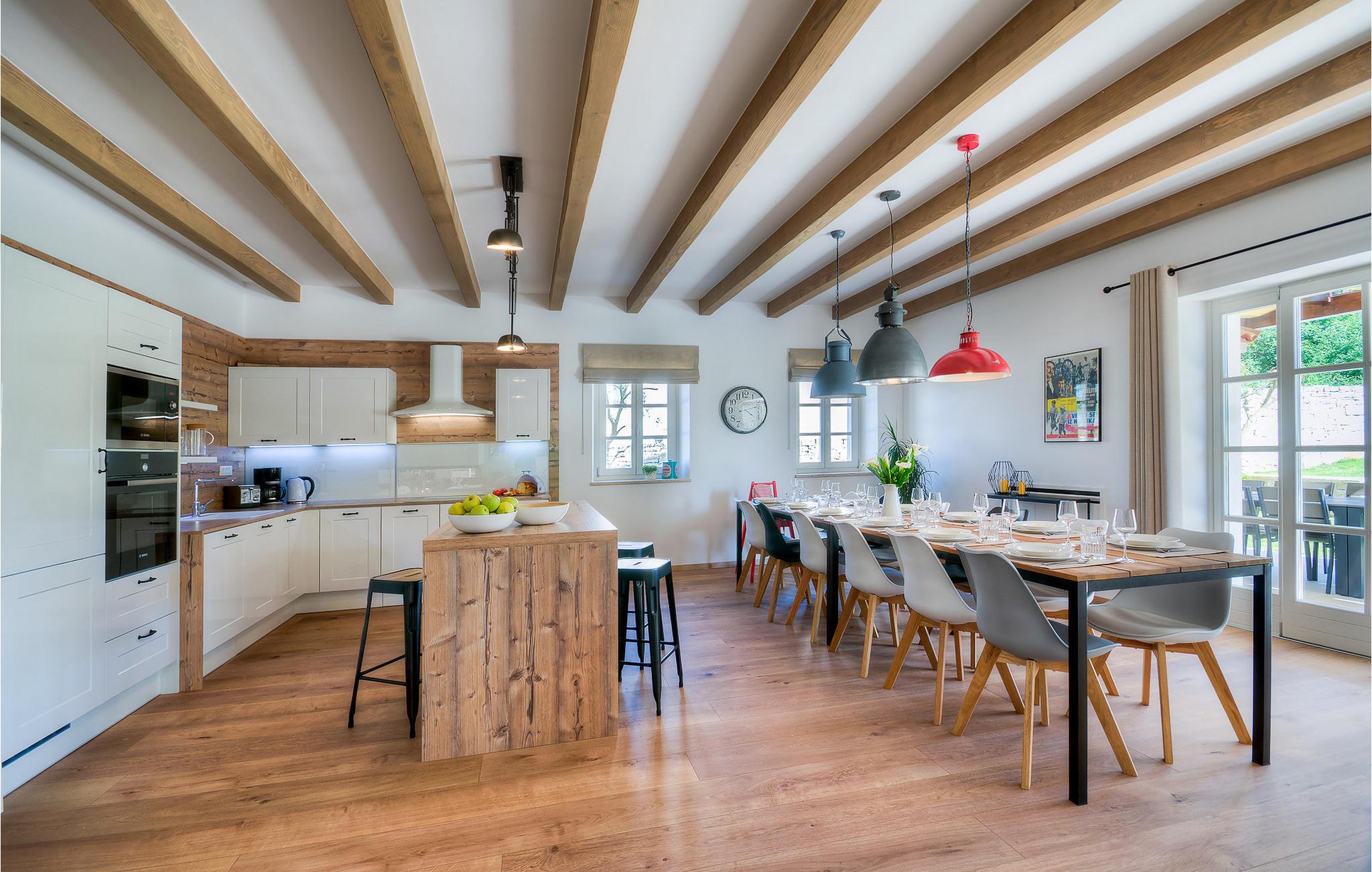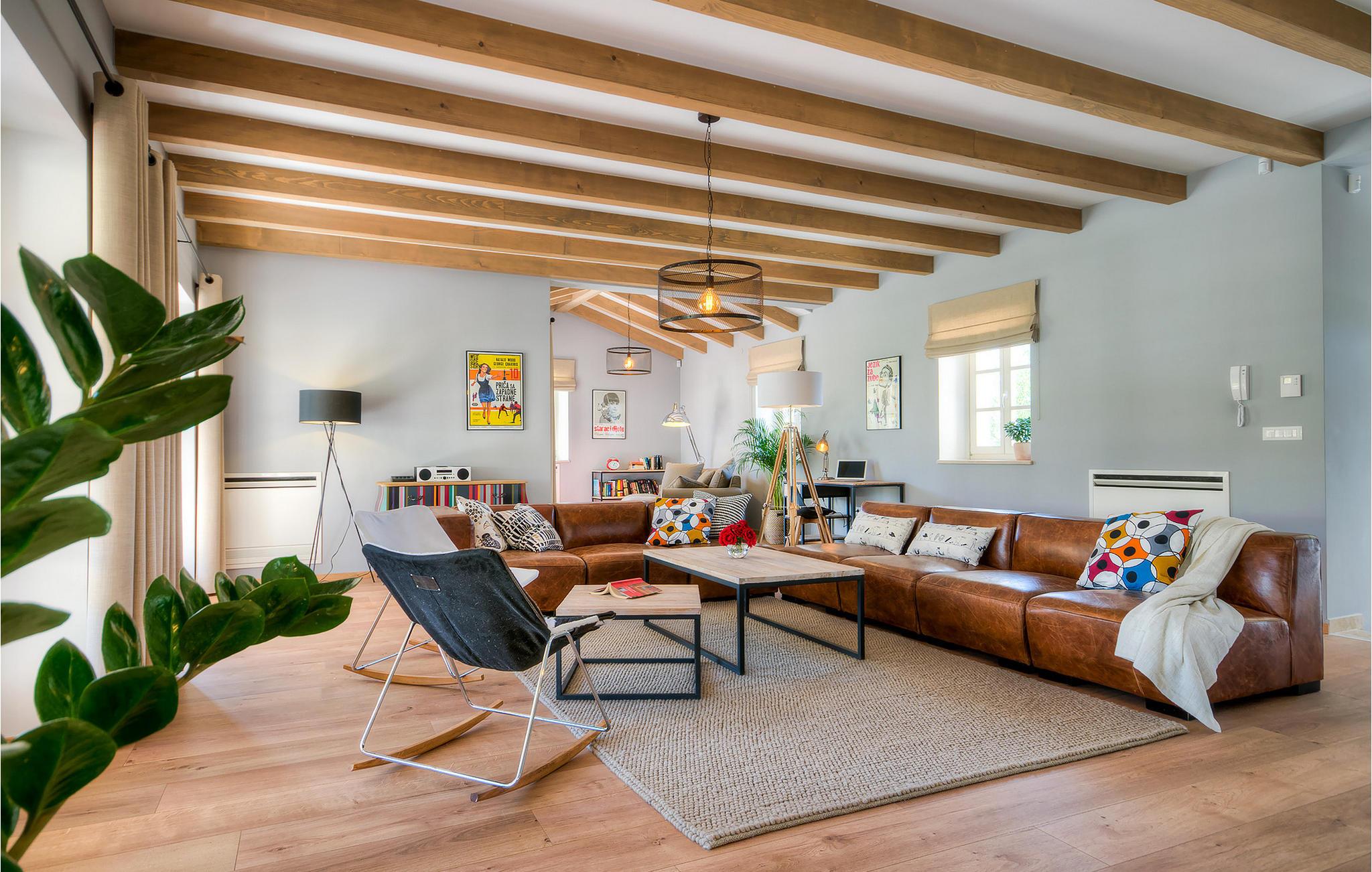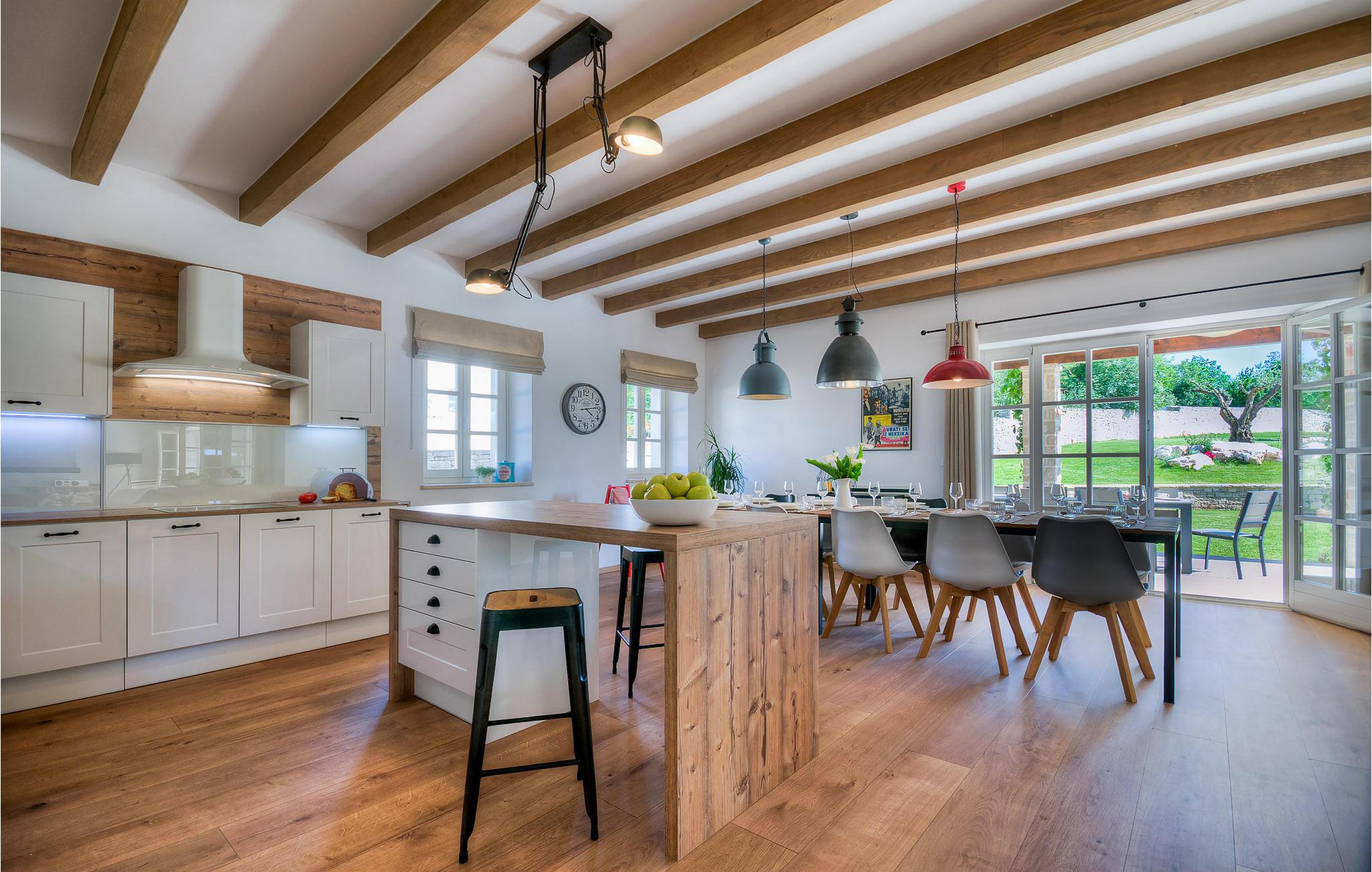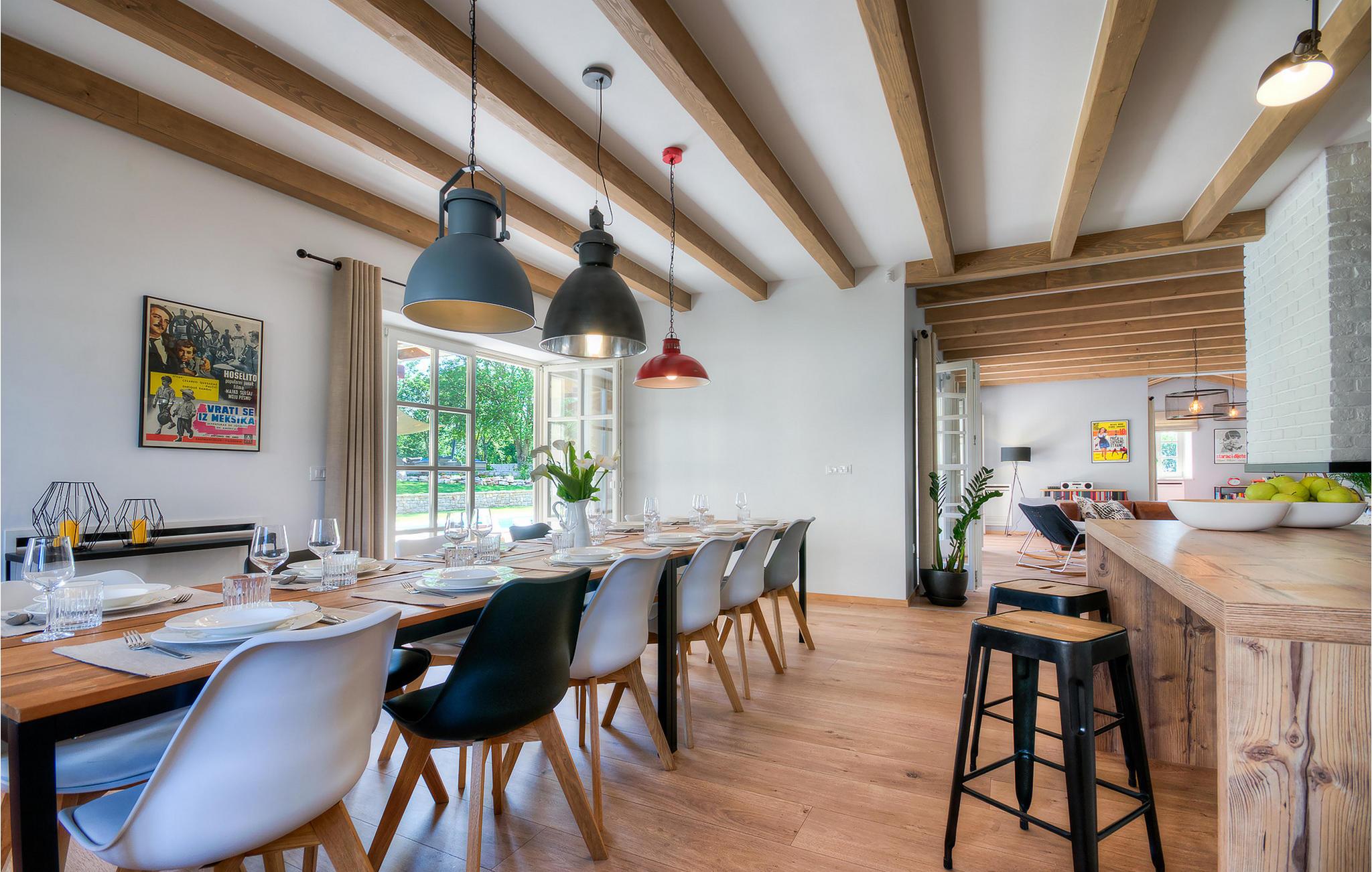 Die schönen Holzbalken und retro Glühbirnen verleihen dem Haus einen entsprechenden vintage Stil.
