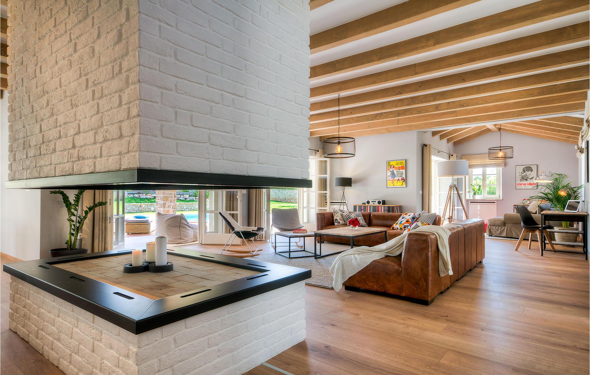 Im Inneren finden Sie einen sehr geräumigen offenen Wohnbereich mit einem großen offenen Kamin. Vier große Glasdoppeltüren verbinden das Innere mit dem Poolbereich. Das gesamte Haus wurde sorgfältig und mit viel Liebe zum Detail und einem Hauch von Industrie-Design dekoriert.