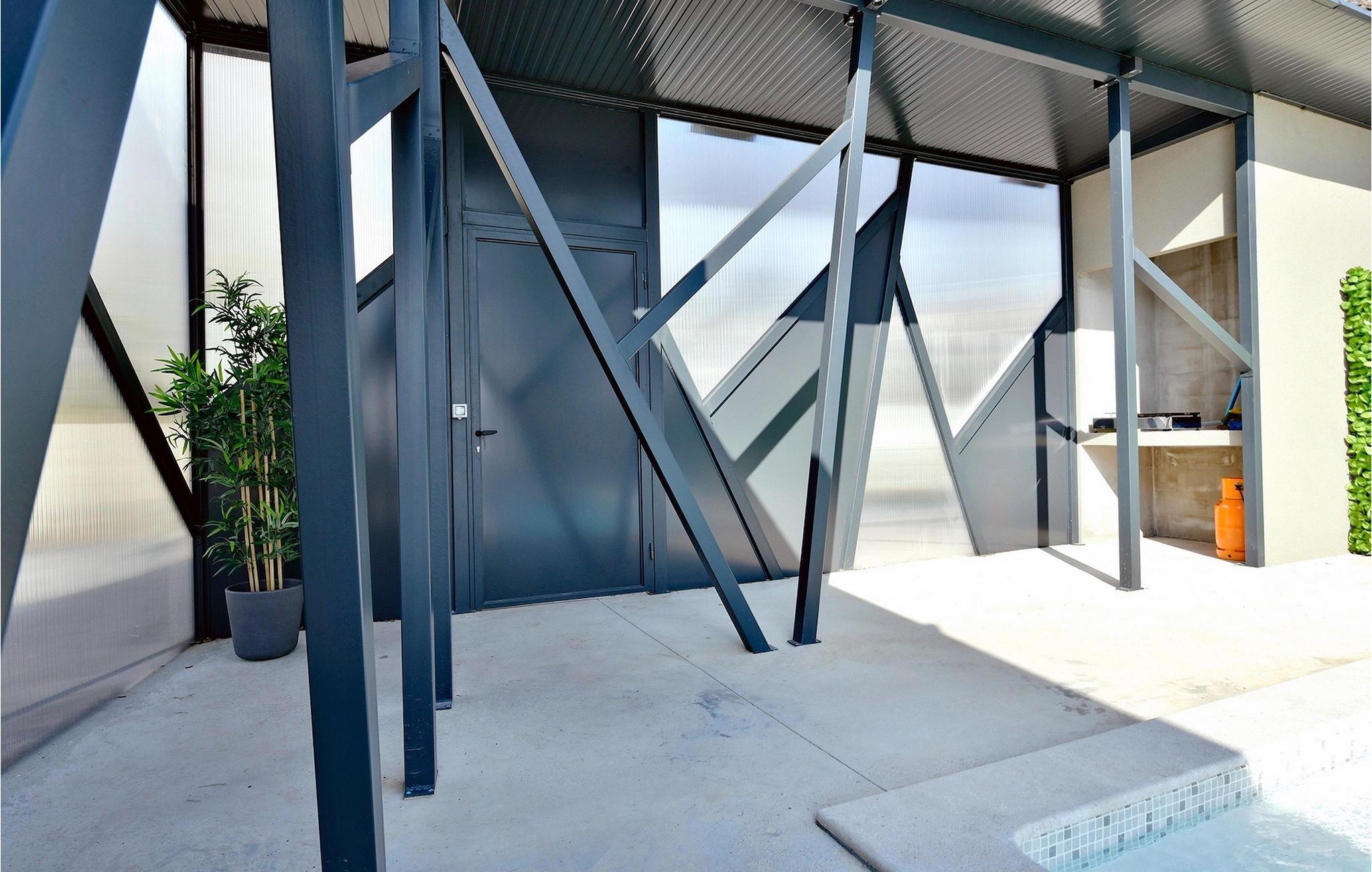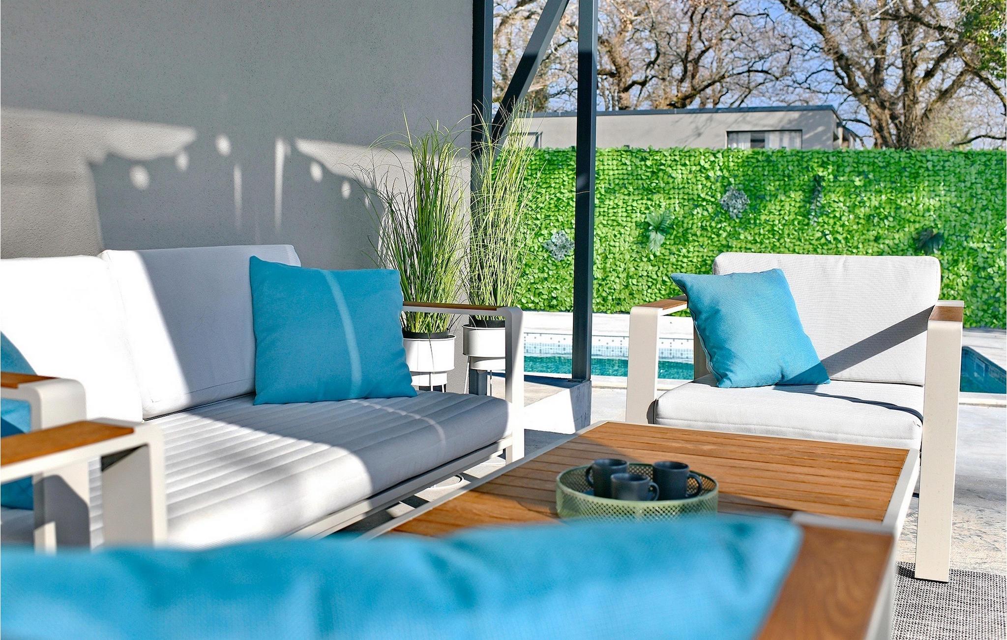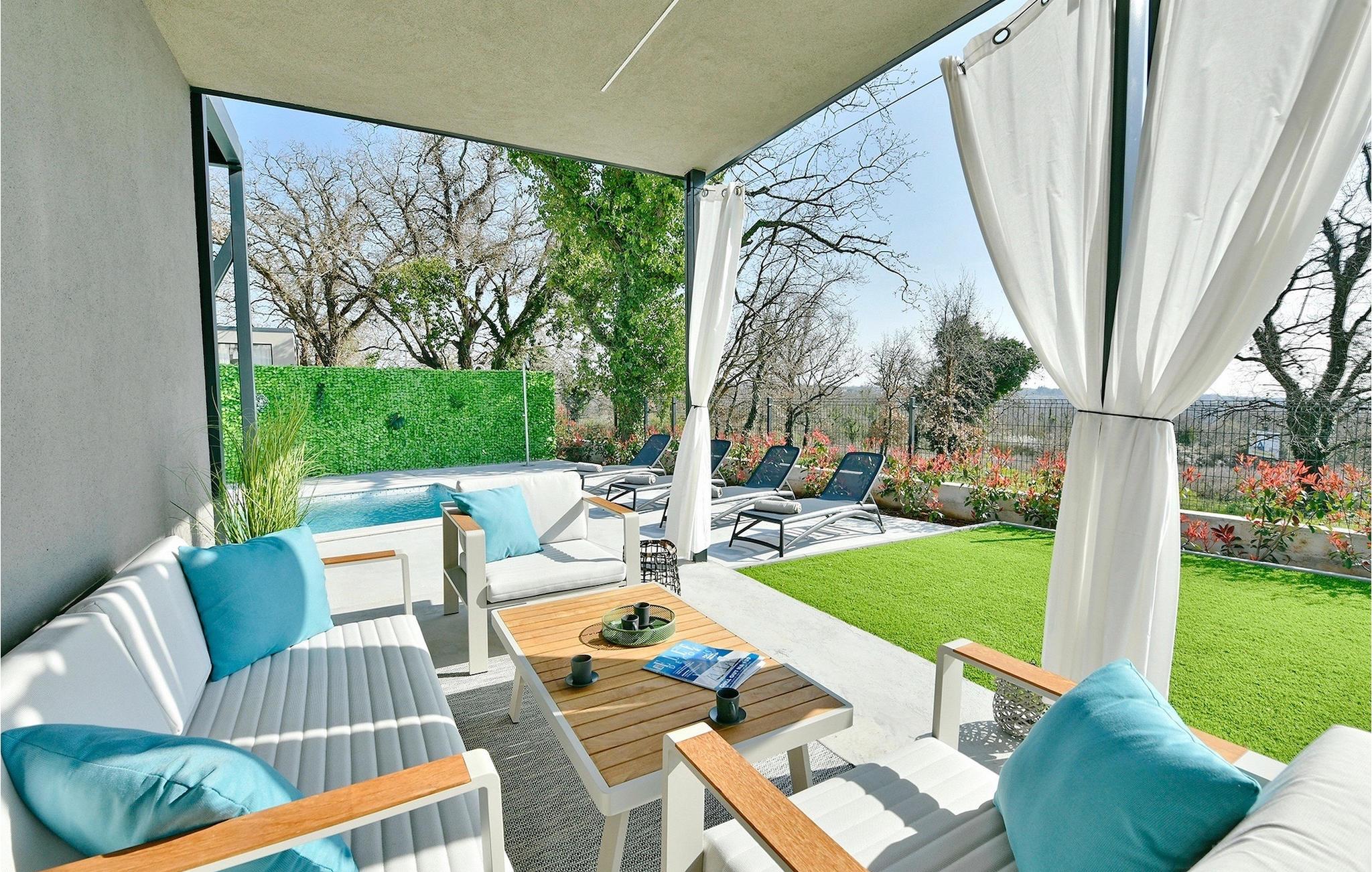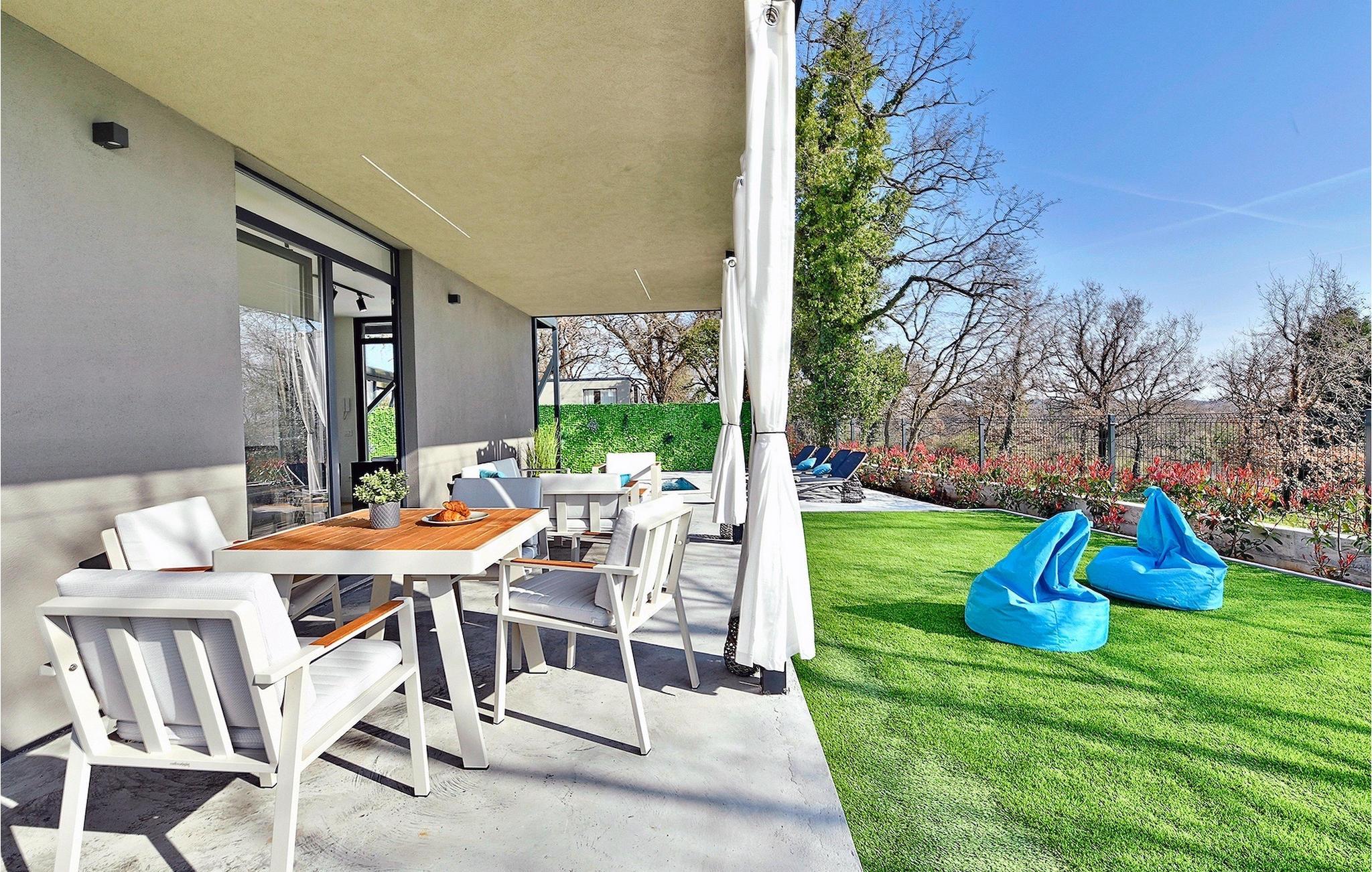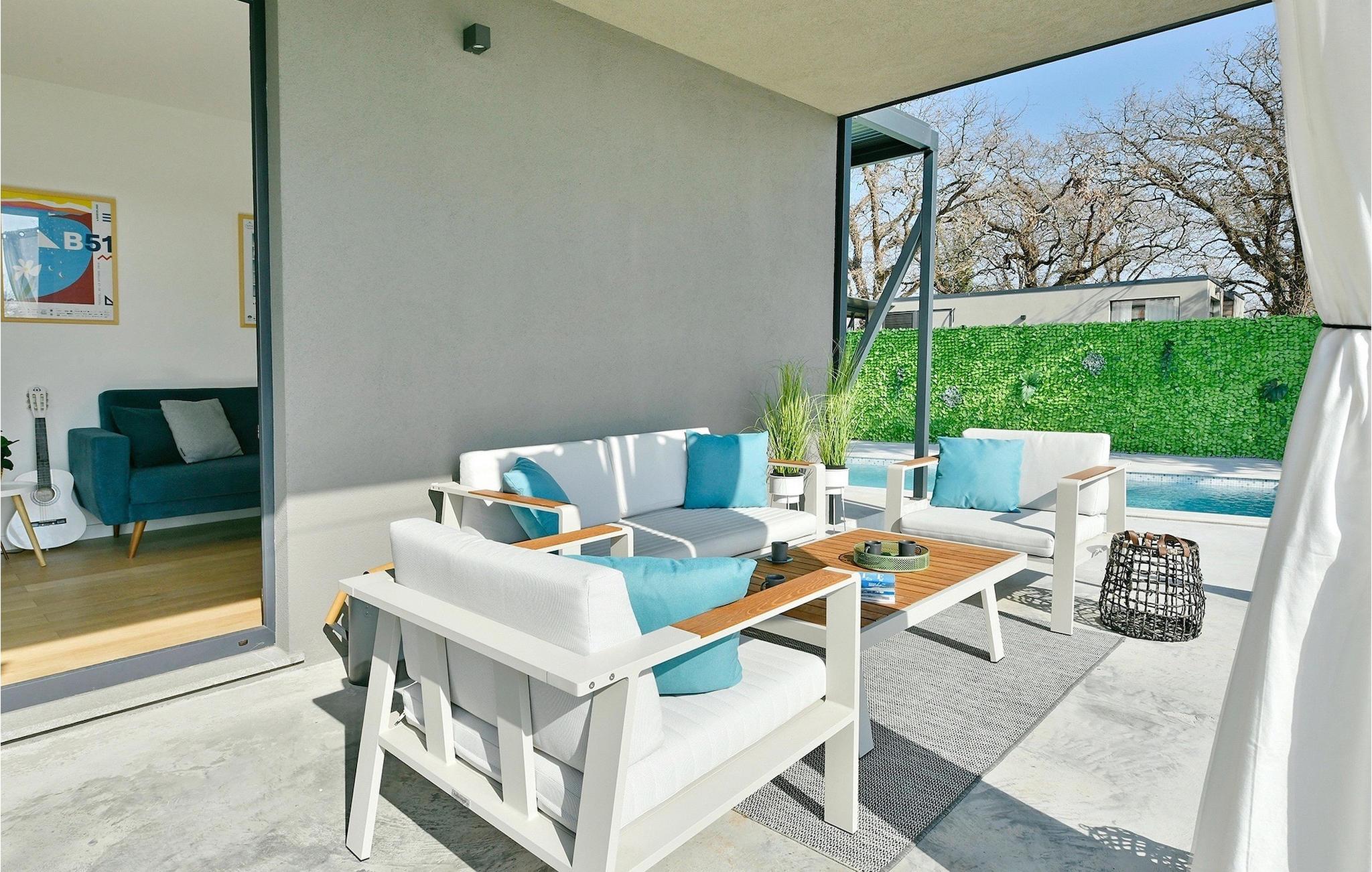 Die Küche und der Wohnbereich bieten direkten Zugang zum Außenhof und zum Poolbereich. Auf der überdachten Terrasse befindet sich ein komfortabler Loungebereich, ideal zum Entspannen an warmen Sommerabenden. Es gibt auch einen Essbereich, in dem Sie Ihre Mahlzeiten genießen können, die beispielsweise auf dem Grill der Villa zubereitet werden.