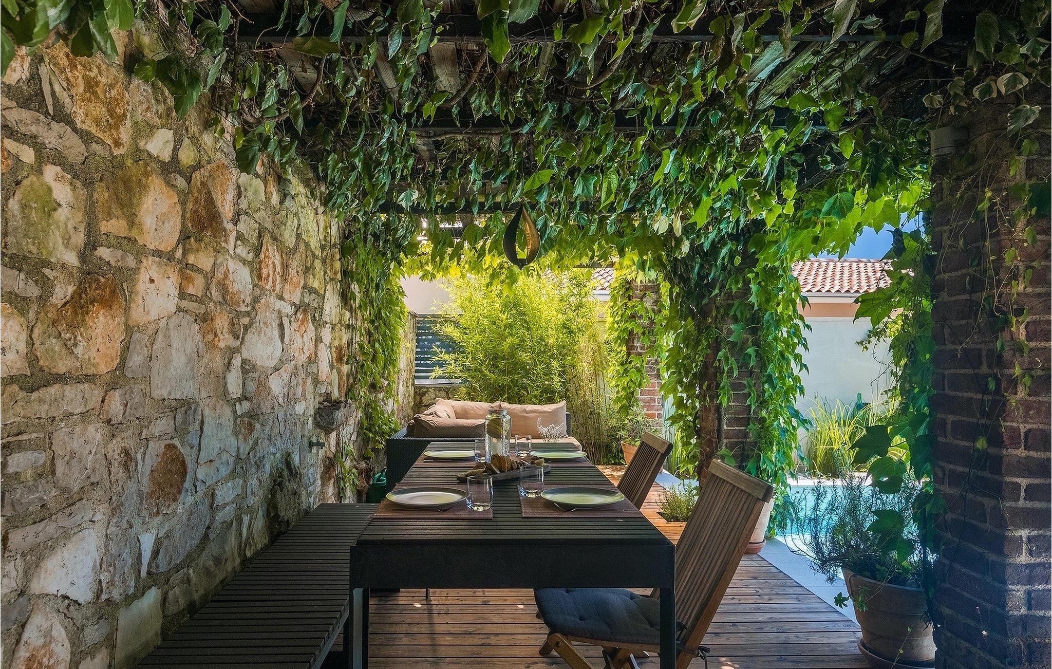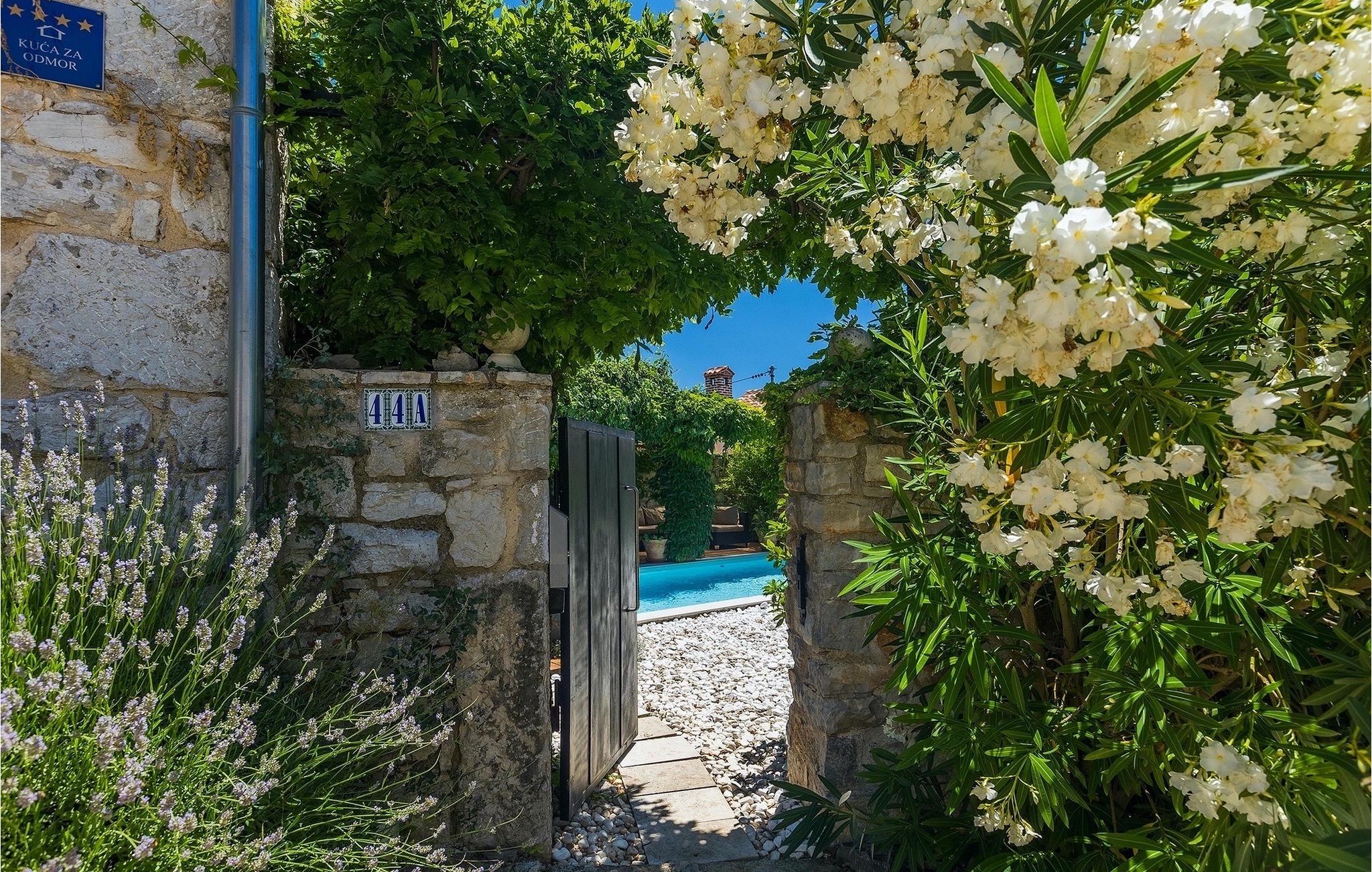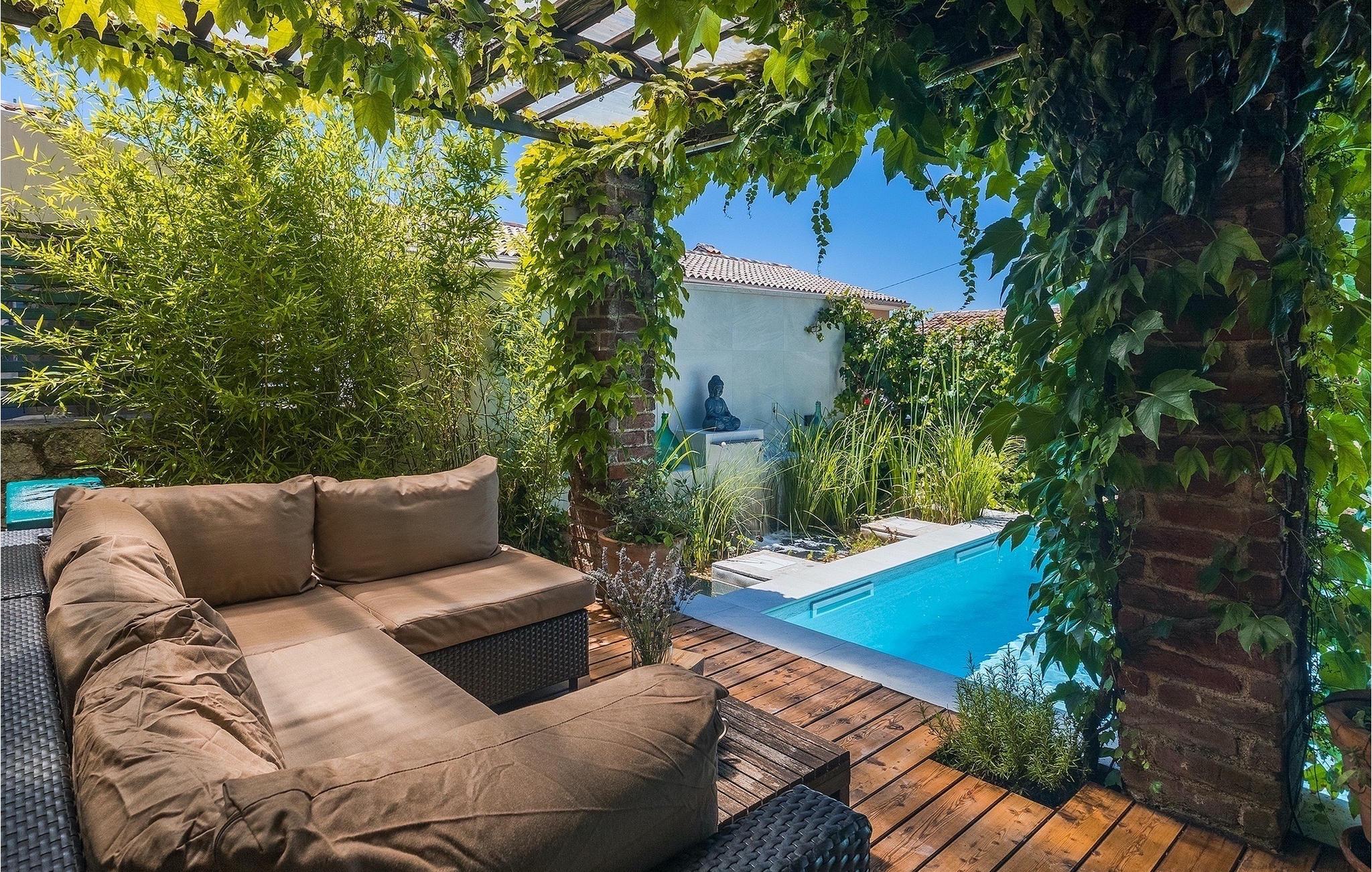 Der Außenbereich umfasst einen vollständig umzäunten grünen Garten mit einem privaten Pool, in dem Sie im natürlichen Schatten entspannen oder die Sonne genießen können, während Sie die Düfte mediterraner Pflanzen einatmen.