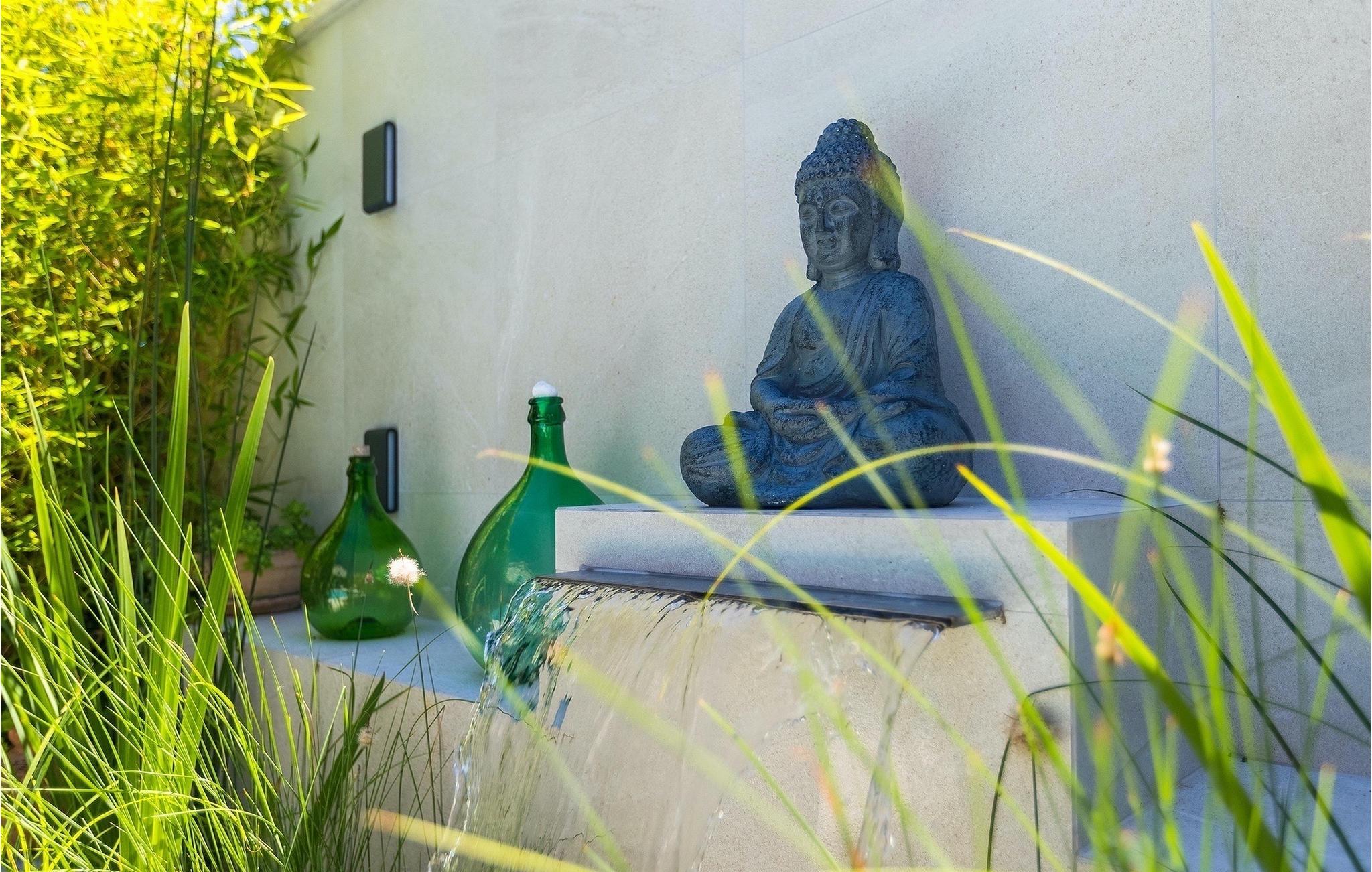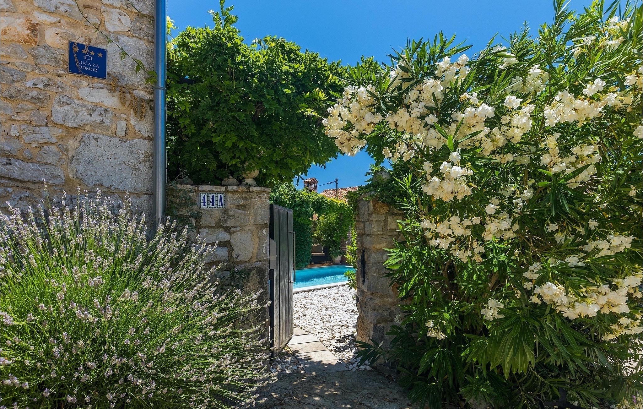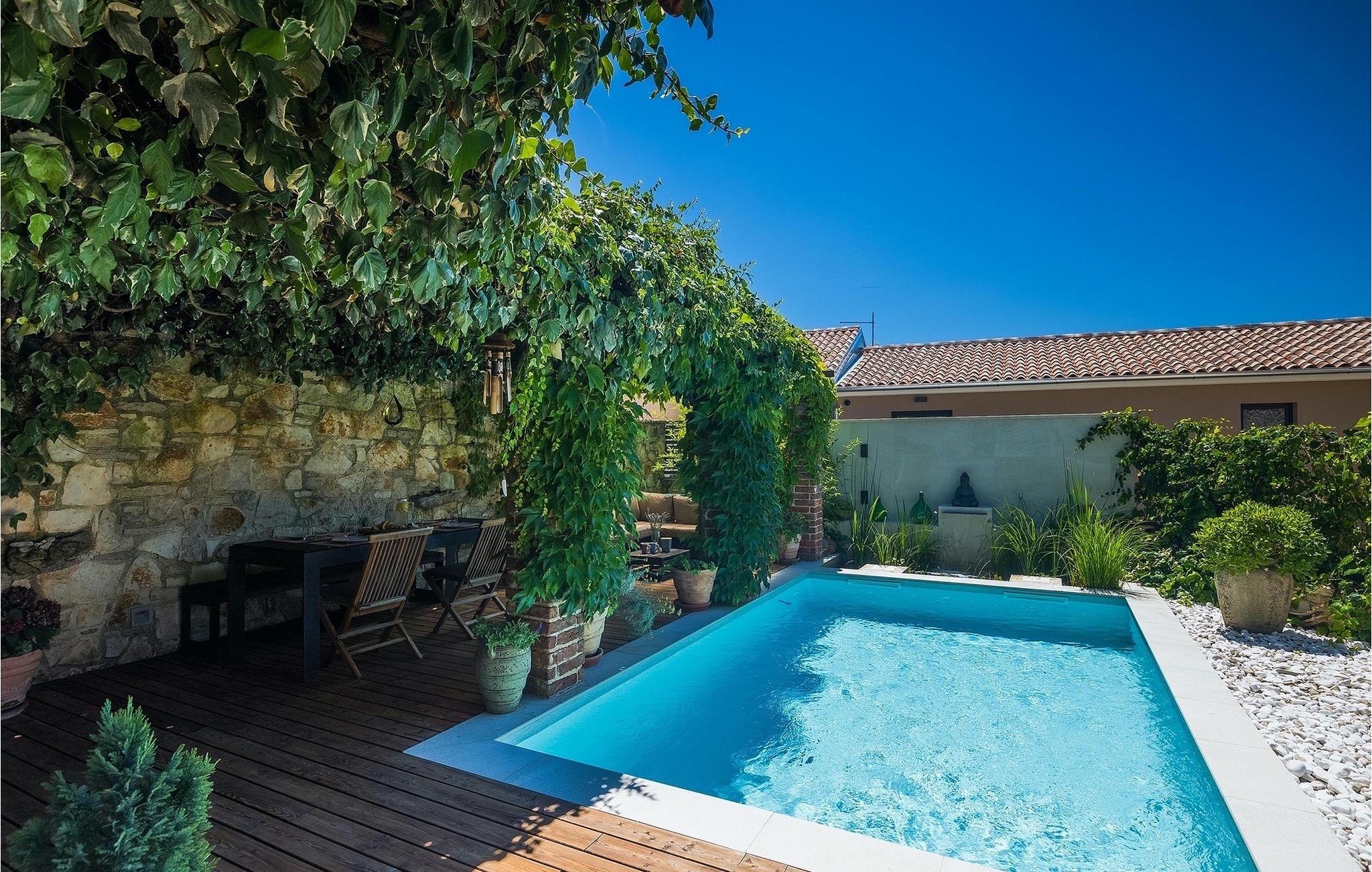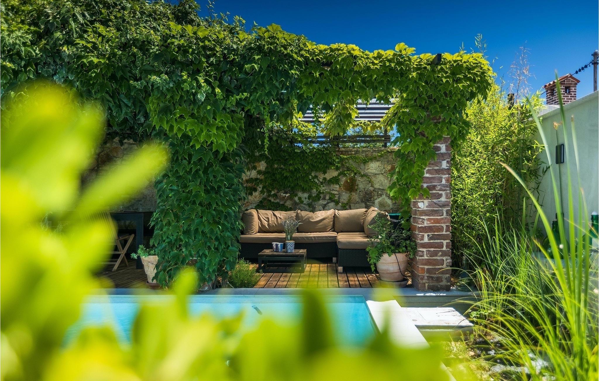 Der Außenbereich umfasst einen vollständig umzäunten grünen Garten mit einem privaten Pool, in dem Sie im natürlichen Schatten entspannen oder die Sonne genießen können, während Sie die Düfte mediterraner Pflanzen einatmen.