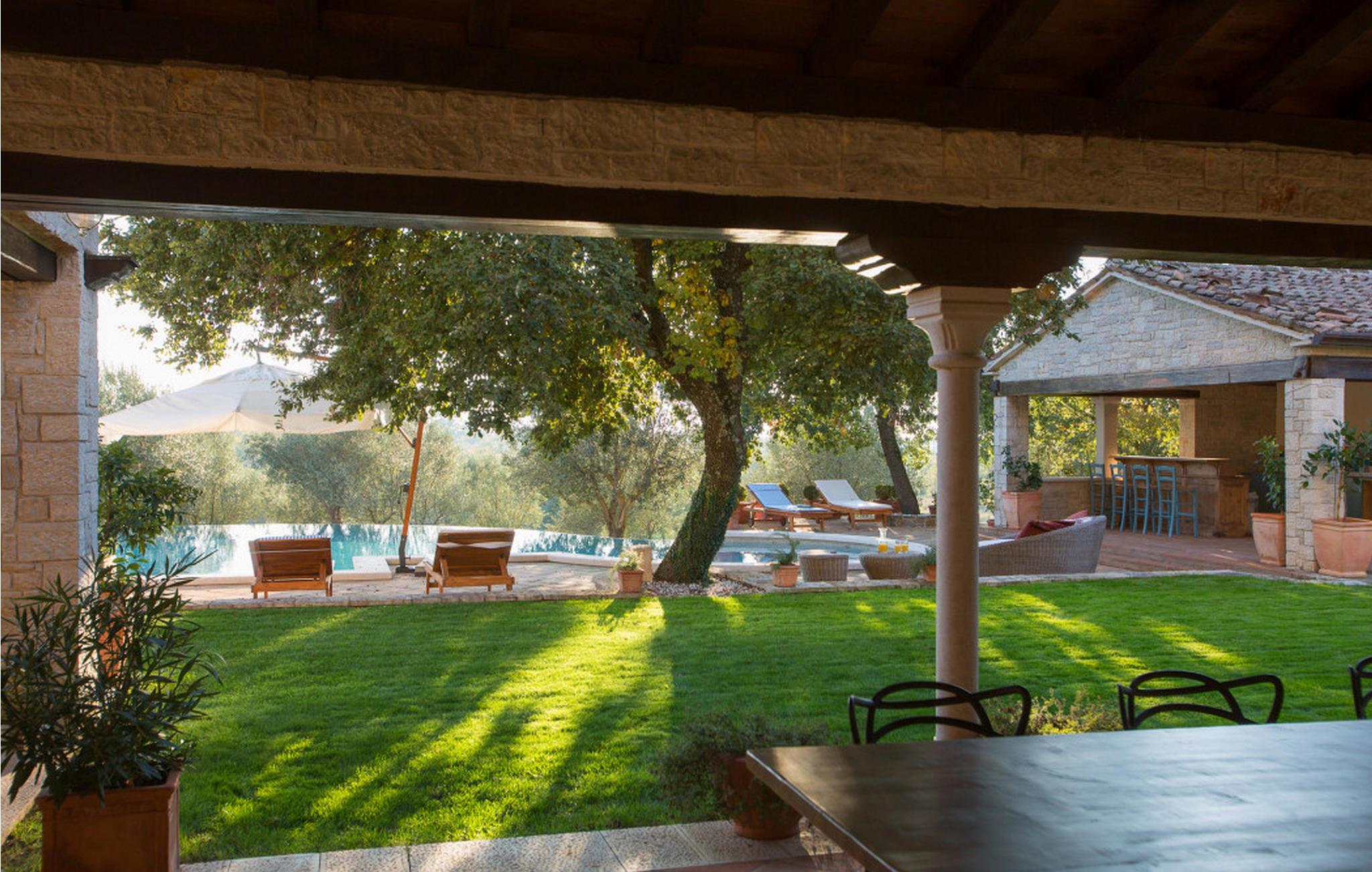 Villa Lou-Sophie ist die perfekte Möglichkeit, die Ruhe Istriens in der Privatsphäre Ihrer eigenen, abgeschiedenen, modernen Villa zu genießen. Die Balkone und Sitzveranden dieser wunderschönen istrischen Villa liegen im ruhigen Dorf Filipini und sind so positioniert, dass sie einen atemberaubenden Blick auf die Natur und den Wald bieten, von dem das Anwesen umgeben ist. Die Villa ist ideal für Traumhochzeiten und intime Zeremonien! Wenn Sie sich für die Villa Lou-Sophie entscheiden, entscheiden Sie sich für einen völlig privaten Standort mit einem Pool, 5 Schlafzimmern, 6 Badezimmern, Ihrem eigenen und einem privaten Garten. Diese luxuriöse, einzigartige Villa liegt nur wenige Kilometer östlich der istrischen Stadt Porec und ihrer Strände. Obwohl Sie sich in der Nähe der wichtigsten Sehenswürdigkeiten befinden, garantiert Ihnen Ihr Aufenthalt in der Villa Lou-Sophie gleichzeitig absolute Privatsphäre. Ihr eigenes Fluchtparadies! Das atemberaubend gestaltete Luxus-Mietobjekt ist von einem üppigen mediterranen Garten von 30.000 m2 und einem 100 m2 großen Swimmingpool mit Liegewiese umgeben. Neben dem Pool gibt es einen Grillplatz, der mit allen Koch- und anderen Utensilien ausgestattet ist, wo Sie und Ihre Gäste ruhige Abendessen genießen können. Die überdachte Veranda bietet Platz für bis zu 14 Personen. Eine schöne Beleuchtung trägt dazu bei, eine unglaublich romantische Atmosphäre zu schaffen, wenn Sie den Abend am Pool verbringen. Der Pool ist im Juni, Juli und August nicht beheizt.