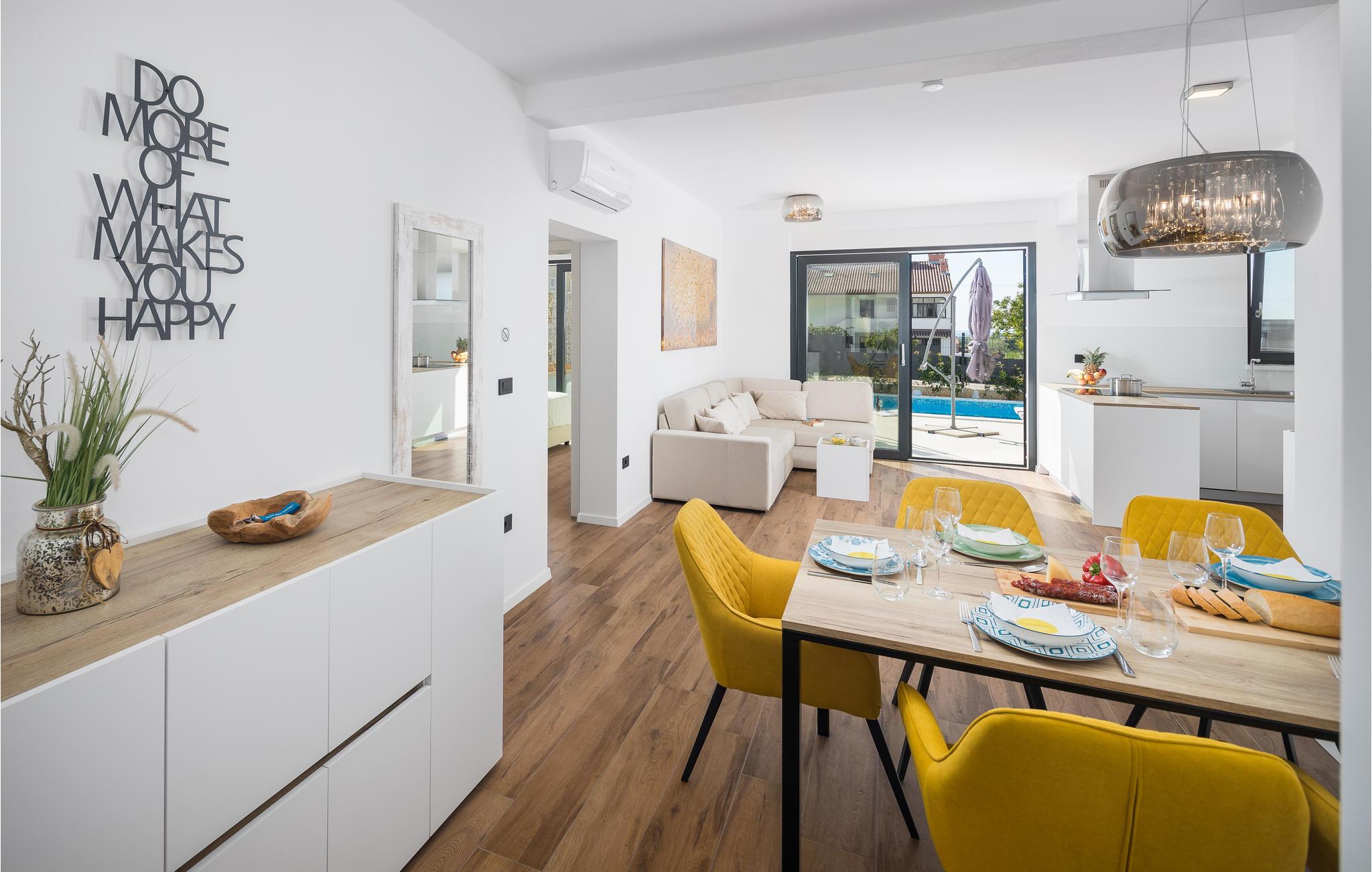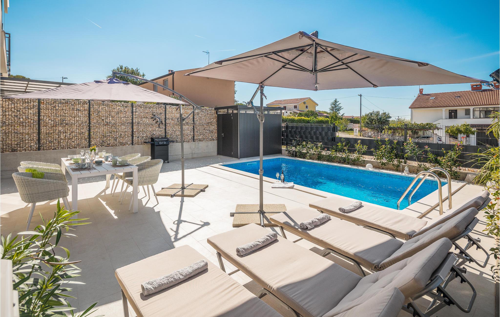 In diesem stilvoll und komfortabel eingerichteten Ferienhaus können Sie mit Ihren Liebsten eine wunderbare Urlaubszeit verbringen. Gleich nach Ankunft können Sie es sich in den geräumigen Zimmern bequem machen und sich wohlfühlen. Auf der Terrasse und dem Balkon finden Sie zu jeder Tageszeit sowohl sonnige als auch schattige Plätze zum Entspannen und für eine willkommene Erfrischung zwischendurch steht Ihnen der Pool zur Verfügung. Auch Kinder werden hier viel Spaß beim Herumplanschen haben. Durch die Einzäunung des Grundstücks können Sie die Kleinen unbesorgt im Freien spielen lassen.