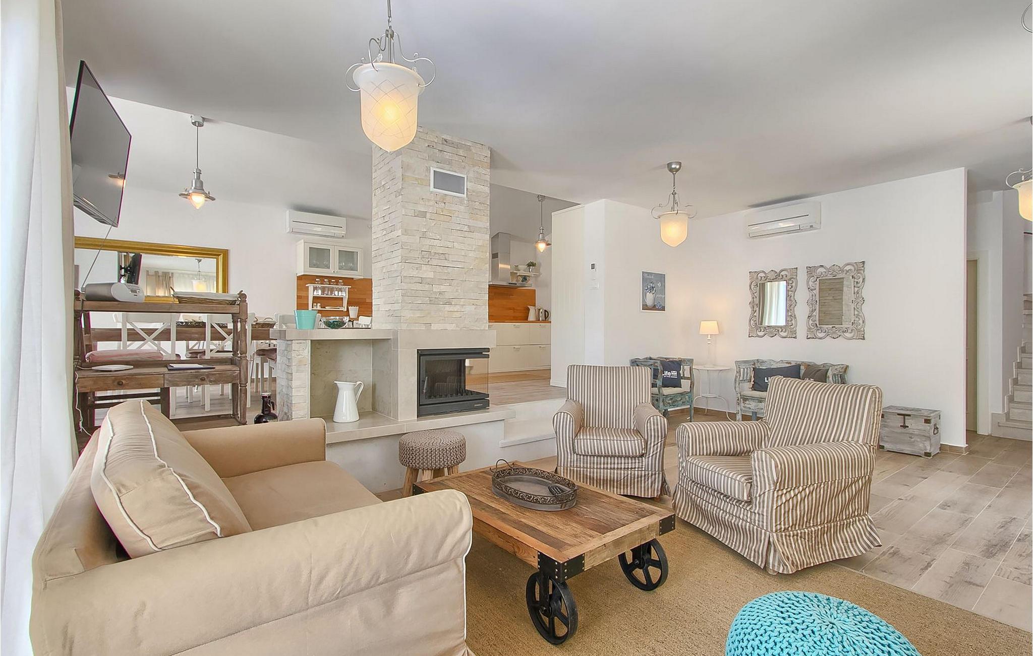 Im Erdgeschoss befindet sich ein helles Wohnzimmer mit TV und Kamin, das Sie einfach zum Relaxen einlädt. Die komplett ausgestattete Küche mit Essbereich ist der perfekte Ort, um köstliche Gerichte für Ihre Liebsten zu zubereiten. Alle drei Schlafzimmer mit Doppelbett haben jeweils ein eigenes Bad mit Dusche. Ein Schlafzimmer finden Sie im Erdgeschoss vor, während sich die anderen zwei auf der ersten Etage befinden. Eines der Badezimmer verfügt über eine Sauna, die sicherlich ein Pluspunkt dieser Villa ist.