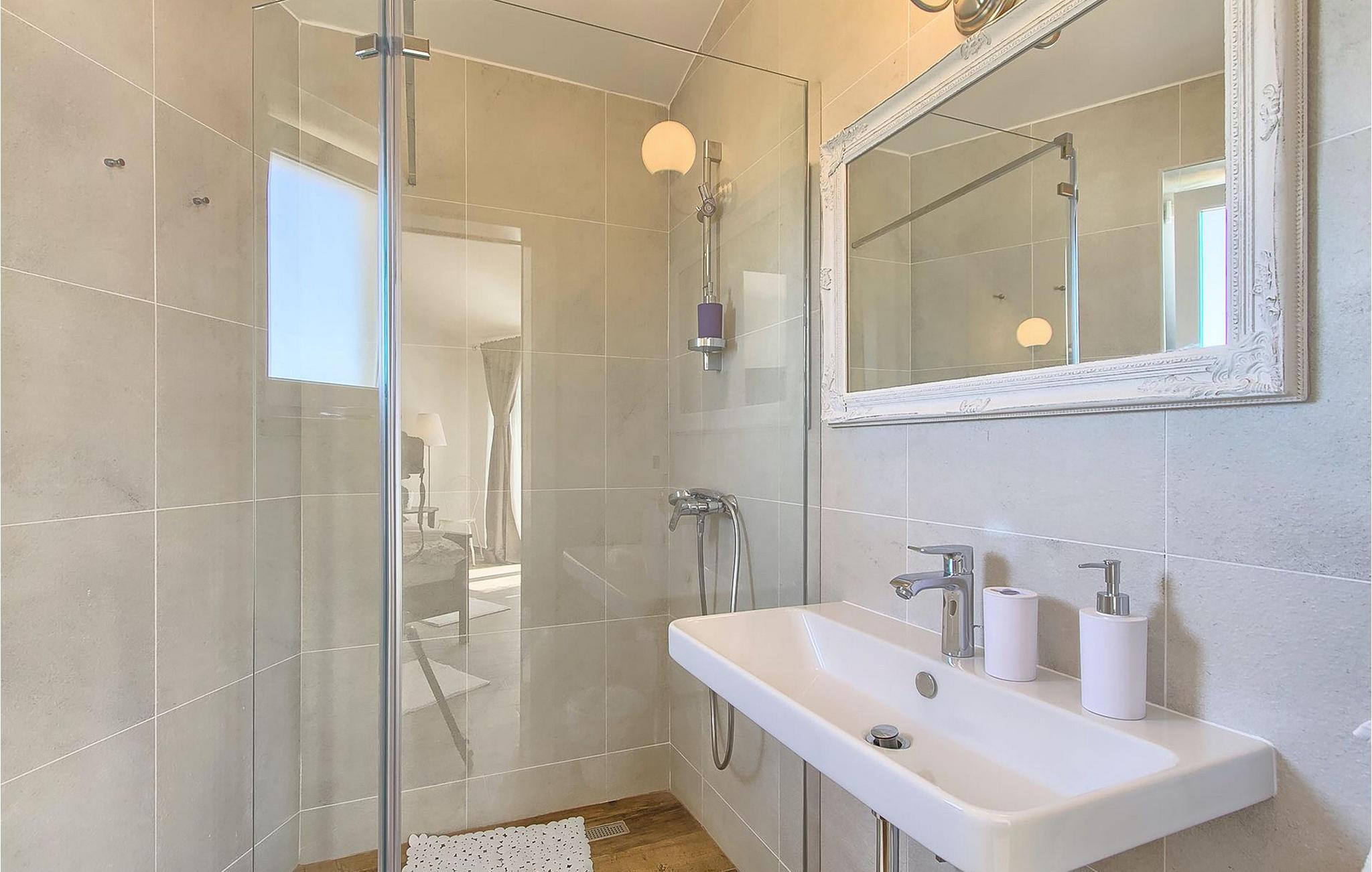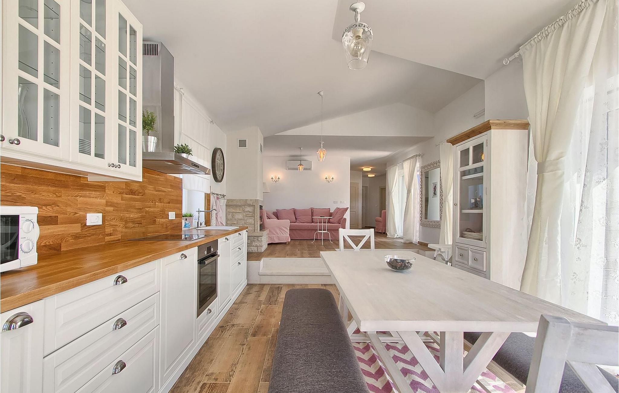 Im Erdgeschoss befindet sich ein helles und offenes Wohnzimmer, wo Sie relaxen und Ihren wohl verdienten Urlaub genießen können. Es ist mit einer komplett ausgestatteten Küche mit Essbereich verbunden, die der perfekte Ort ist, um köstliche Mahlzeiten mit Ihren Liebsten zu genießen. Alle drei Schlafzimmer haben jeweils ein eigenes Bad mit Dusche. Ein Schlafzimmer mit Doppelbett finden Sie im Erdgeschoss vor, während sich die anderen zwei auf der ersten Etage befinden. Sicherlich einer der größten Pluspunkte dieser Villa ist die Sauna, die sich in einem der Badezimmer befindet.