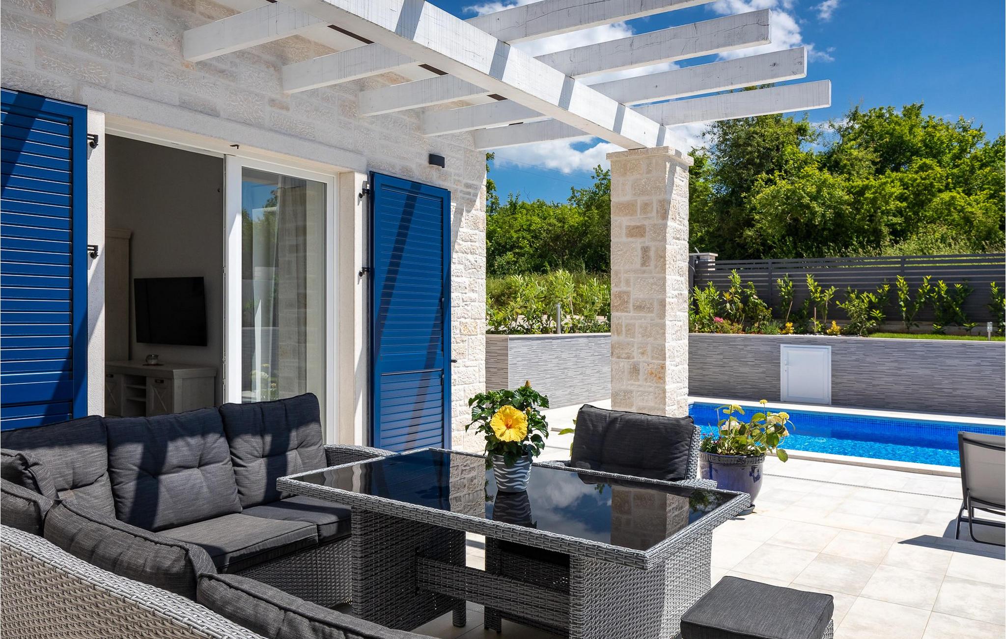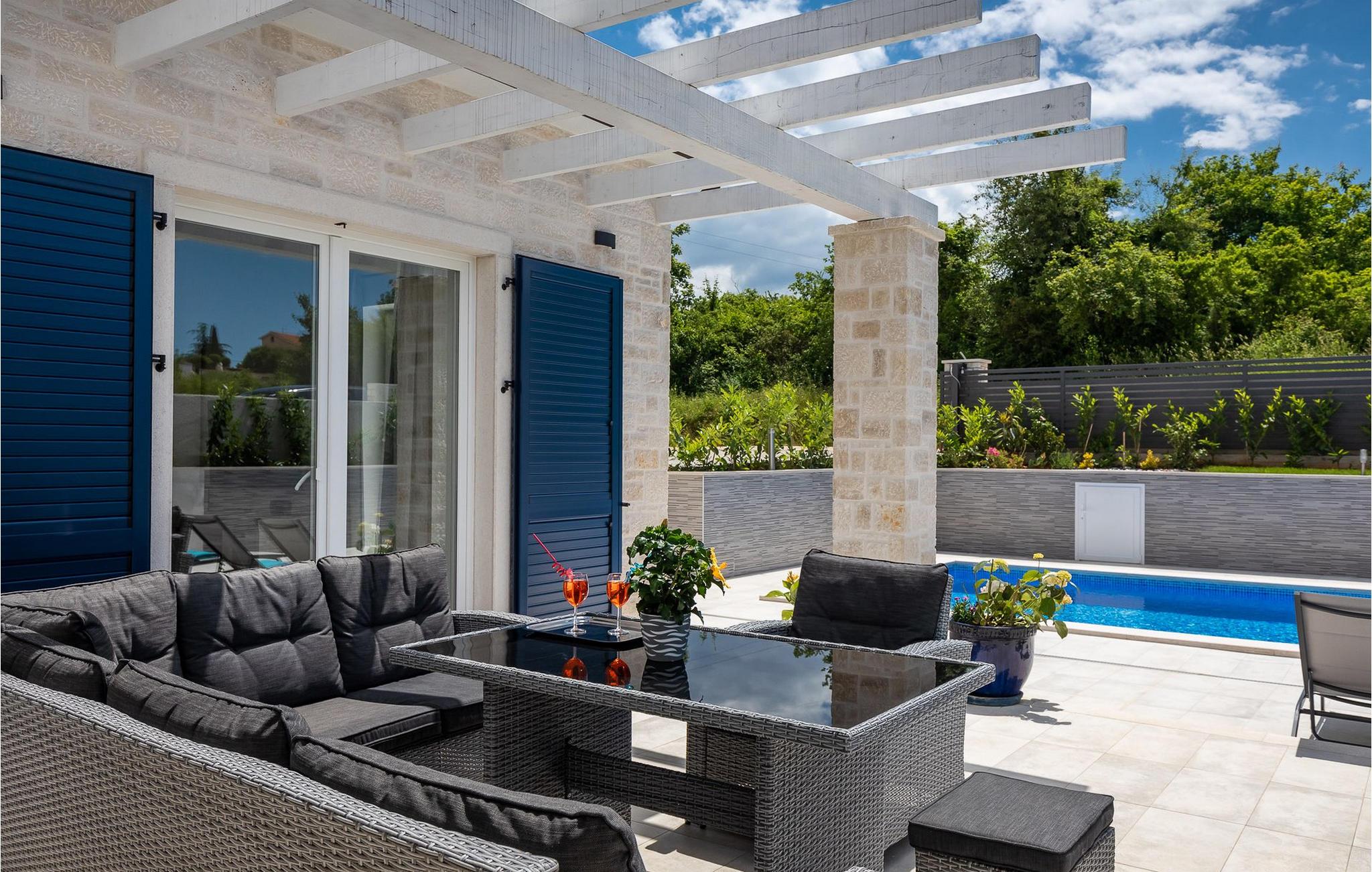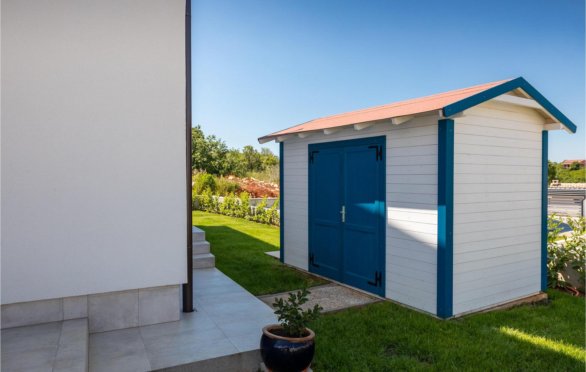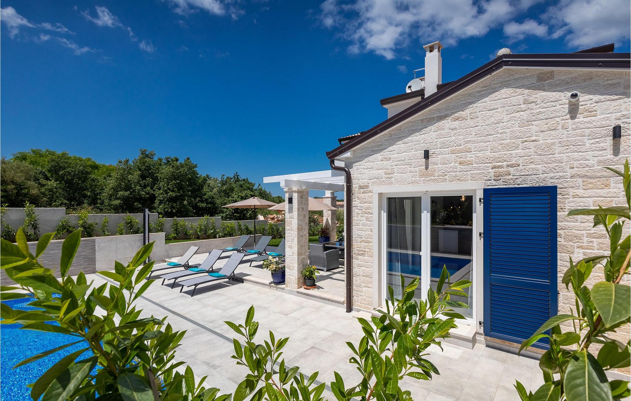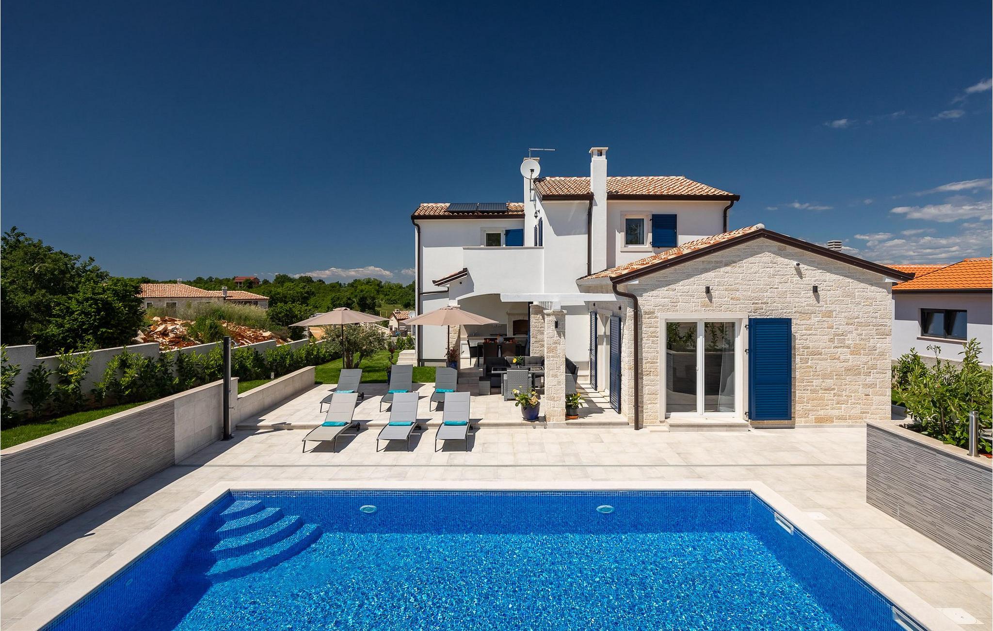 Im Wohnzimmer finden Sie ein gemütliches graues Sofa, auf dem Sie sich entspannen oder einen Filmabend mit Familie oder Freunden verbringen können. Die Terrassentür im Wohnzimmer bietet einen atemberaubenden Blick auf den Pool und die wunderschöne Landschaft. Im ersten Stock befinden sich 2 Schlafzimmer mit en-suite Badezimmern. Beide Schlafzimmer haben Zugang zum Balkon. Im Außenbereich der Villa auf der Terrasse befindet sich ein Tisch mit 8 Stühlen, an dem Sie eine köstliche Mahlzeit servieren können, die auf dem verfügbaren Holzkohlegrill zubereitet wurde. Es gibt auch Gartenmöbel, in denen Sie nach einem langen Tag voller Freude bei einem kalten Getränk entspannen können. Erfrischen Sie sich im Pool vor der Terrasse oder entspannen Sie auf den Sonnenliegen. Sonnenbaden auf den Sonnenliegen rundet Ihren Tag ab. Die Villa Camelia ist ideal für einen schönen Urlaub mit Familie oder Freunden und wird Sie mit ihrer schönen mediterranen Umgebung begeistern.Die Villa Camelia befindet sich unweit von Novigrad in der kleinen Stadt Tar. Tar ist bekannt für seinen Olivenanbau und Fischfang sowie für die gastfreundlichen Gastgeber. Das Zentrum der kleinen Stadt bewahrt den traditionellen istrischen Geist in vielen Steinhäusern und Tavernen, in denen Sie die besten istrischen Spezialitäten probieren können, darunter Olivenöl, Meeresfrüchte, Trüffel und köstliche Desserts. Die Halbinsel Lanterna ist ein ideales Ziel für alle Liebhaber von Sonne und Meer. Am Strand können Sie viele sportliche Aktivitäten ausüben oder in einem der Cafés mit Blick auf Novigrad entspannen. Naturliebhaber sollten es sich nicht entgehen lassen, an die Mündung des Flusses Mirna zu gehen. Der Fluss Mirna ist der längste Fluss Istriens und erstreckt sich entlang des Motovun-Waldes, der ein beliebtes Ziel für alle Trüffelfans ist. Der Fluss Mirna ist ein geschätztes und bekanntes ornithologisches Reservat. Entlang des Flusses gibt es kleine Städte wie Motovun, Grožnjan und Oprtalj, die unbedingt erkundet werden sollten.