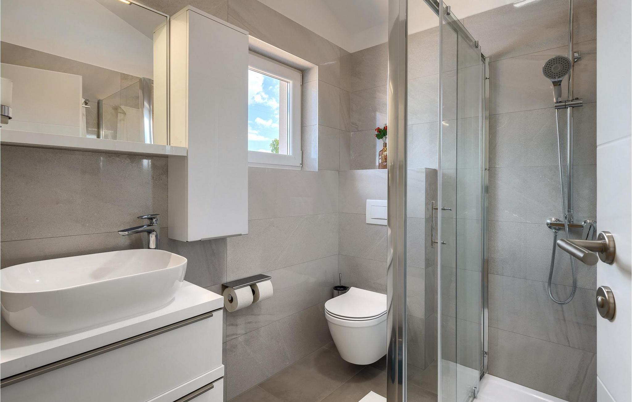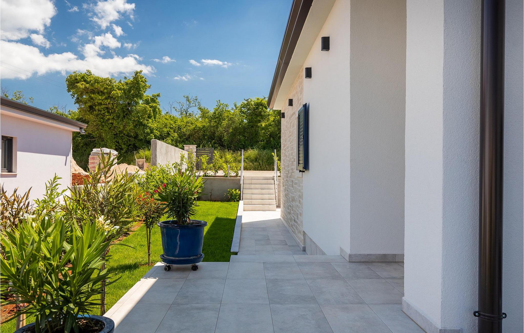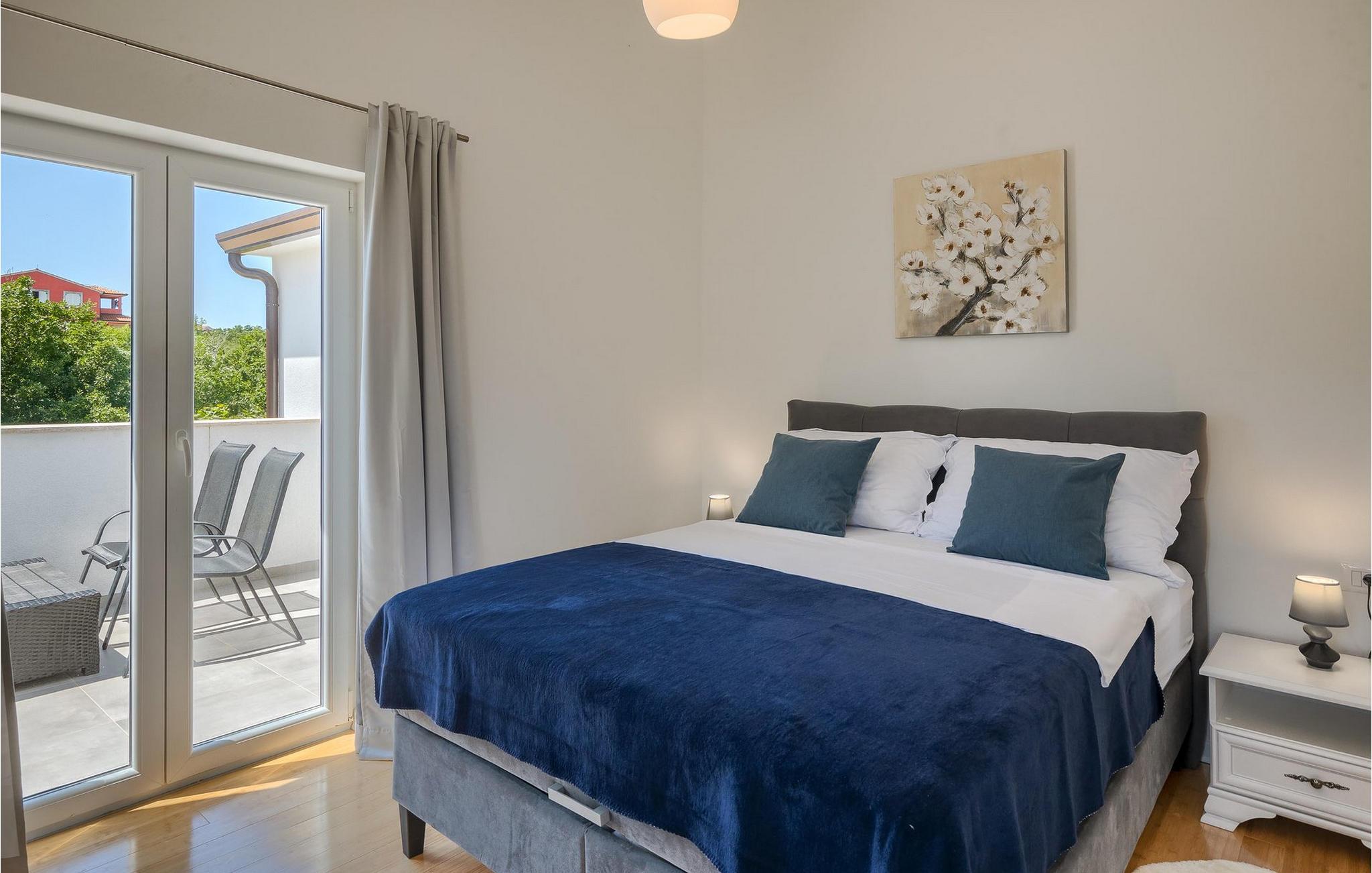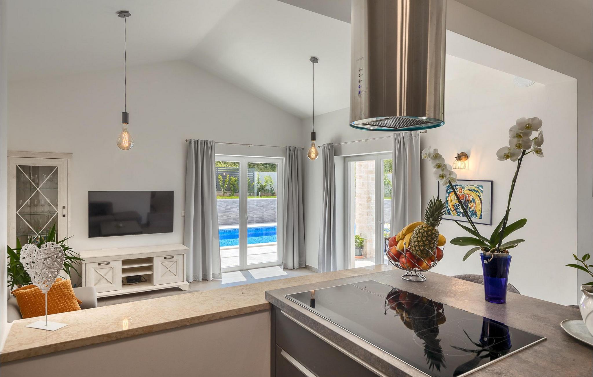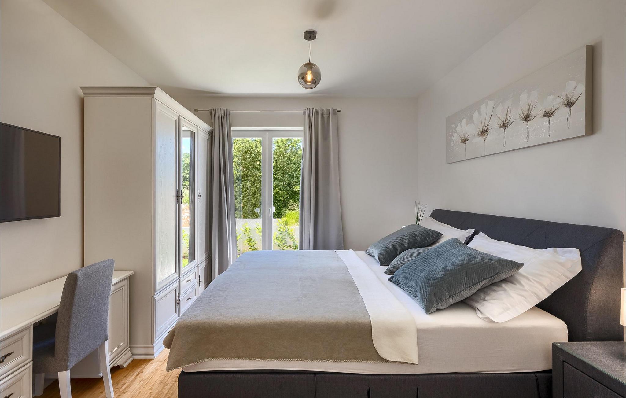 Im Wohnzimmer finden Sie ein gemütliches graues Sofa, auf dem Sie sich entspannen oder einen Filmabend mit Familie oder Freunden verbringen können. Die Terrassentür im Wohnzimmer bietet einen atemberaubenden Blick auf den Pool und die wunderschöne Landschaft. Im ersten Stock befinden sich 2 Schlafzimmer mit en-suite Badezimmern. Beide Schlafzimmer haben Zugang zum Balkon. Im Außenbereich der Villa auf der Terrasse befindet sich ein Tisch mit 8 Stühlen, an dem Sie eine köstliche Mahlzeit servieren können, die auf dem verfügbaren Holzkohlegrill zubereitet wurde. Es gibt auch Gartenmöbel, in denen Sie nach einem langen Tag voller Freude bei einem kalten Getränk entspannen können. Erfrischen Sie sich im Pool vor der Terrasse oder entspannen Sie auf den Sonnenliegen. Sonnenbaden auf den Sonnenliegen rundet Ihren Tag ab. Die Villa Camelia ist ideal für einen schönen Urlaub mit Familie oder Freunden und wird Sie mit ihrer schönen mediterranen Umgebung begeistern.Die Villa Camelia befindet sich unweit von Novigrad in der kleinen Stadt Tar. Tar ist bekannt für seinen Olivenanbau und Fischfang sowie für die gastfreundlichen Gastgeber. Das Zentrum der kleinen Stadt bewahrt den traditionellen istrischen Geist in vielen Steinhäusern und Tavernen, in denen Sie die besten istrischen Spezialitäten probieren können, darunter Olivenöl, Meeresfrüchte, Trüffel und köstliche Desserts. Die Halbinsel Lanterna ist ein ideales Ziel für alle Liebhaber von Sonne und Meer. Am Strand können Sie viele sportliche Aktivitäten ausüben oder in einem der Cafés mit Blick auf Novigrad entspannen. Naturliebhaber sollten es sich nicht entgehen lassen, an die Mündung des Flusses Mirna zu gehen. Der Fluss Mirna ist der längste Fluss Istriens und erstreckt sich entlang des Motovun-Waldes, der ein beliebtes Ziel für alle Trüffelfans ist. Der Fluss Mirna ist ein geschätztes und bekanntes ornithologisches Reservat. Entlang des Flusses gibt es kleine Städte wie Motovun, Grožnjan und Oprtalj, die unbedingt erkundet werden sollten.