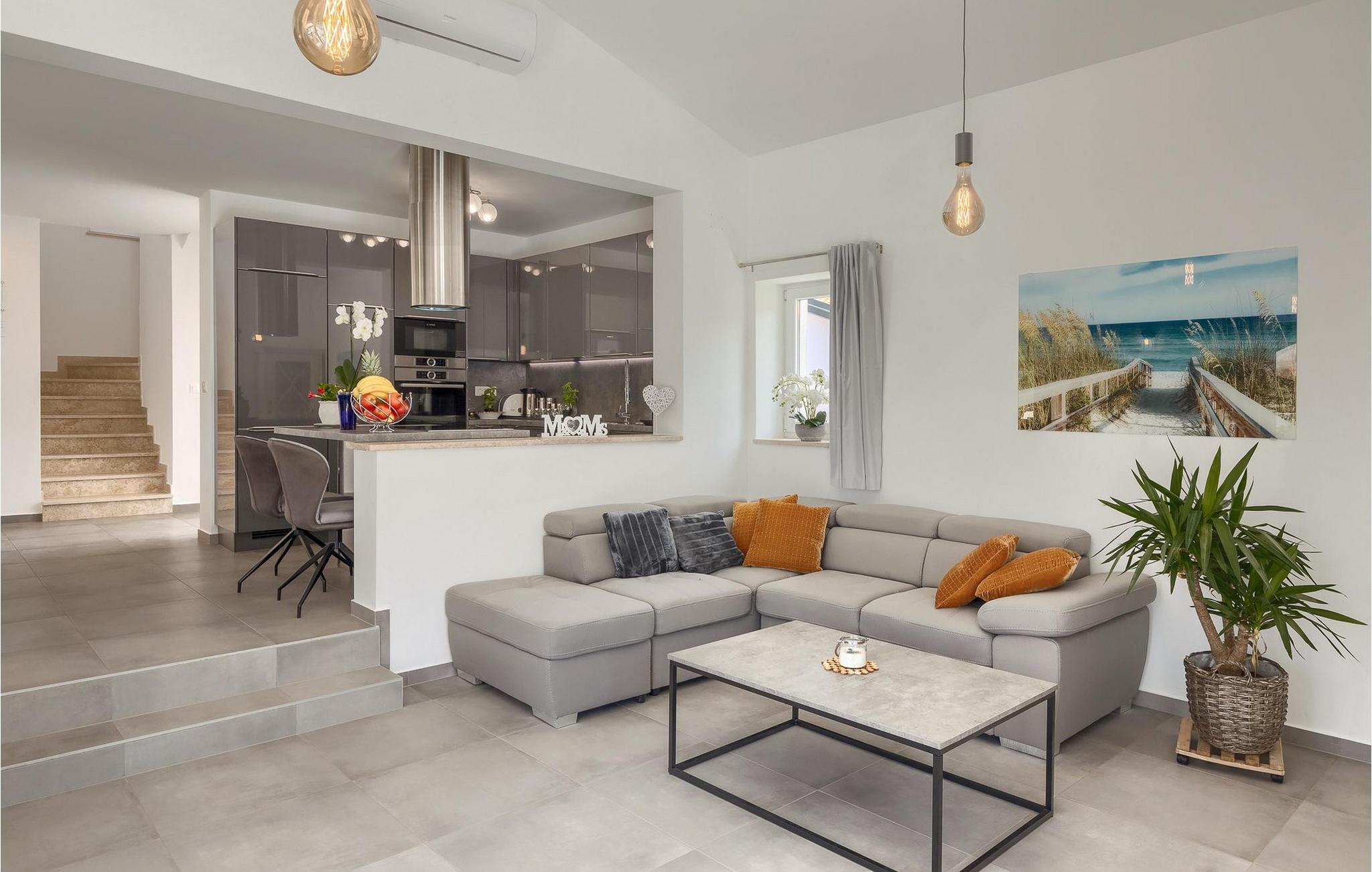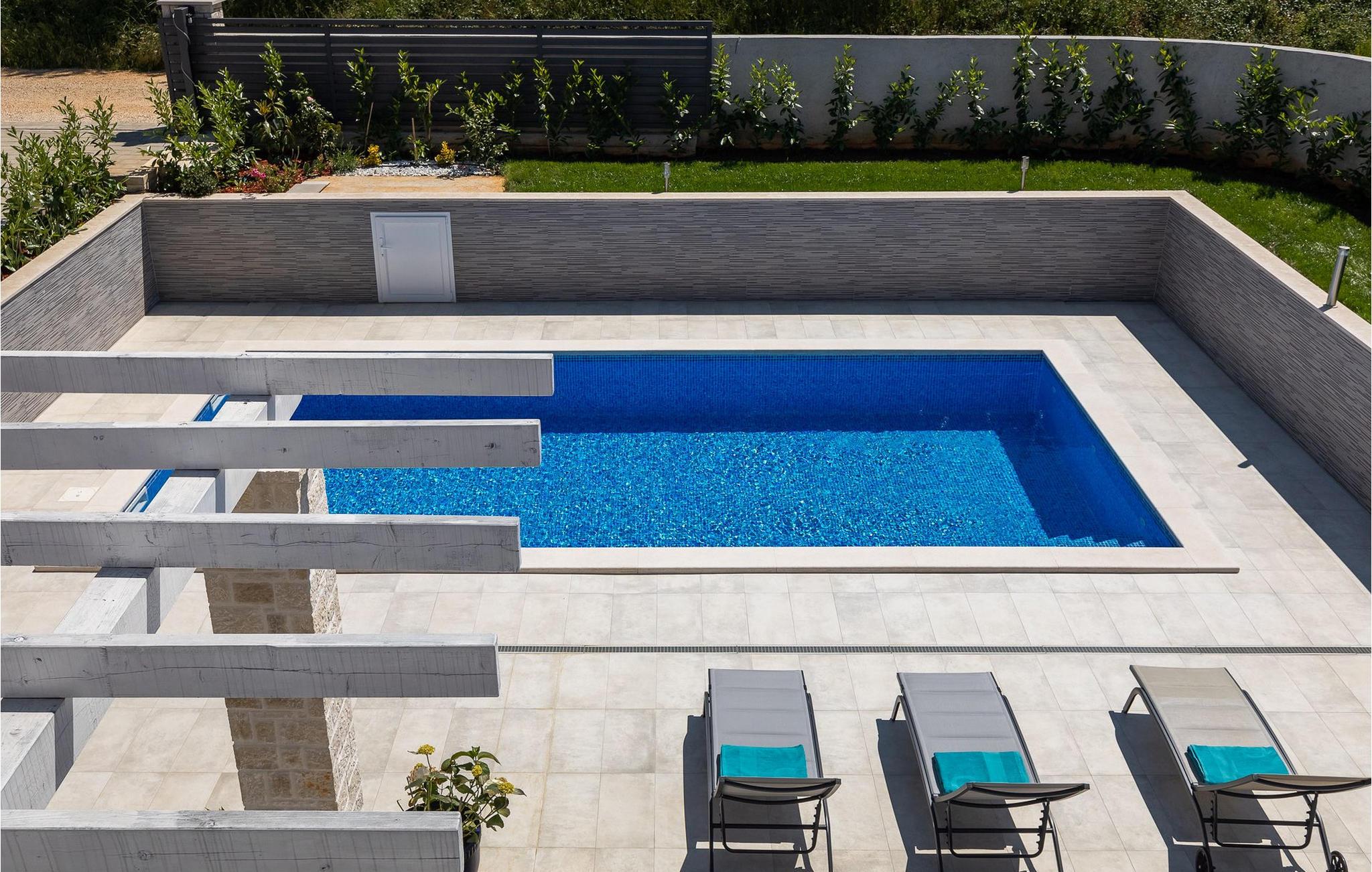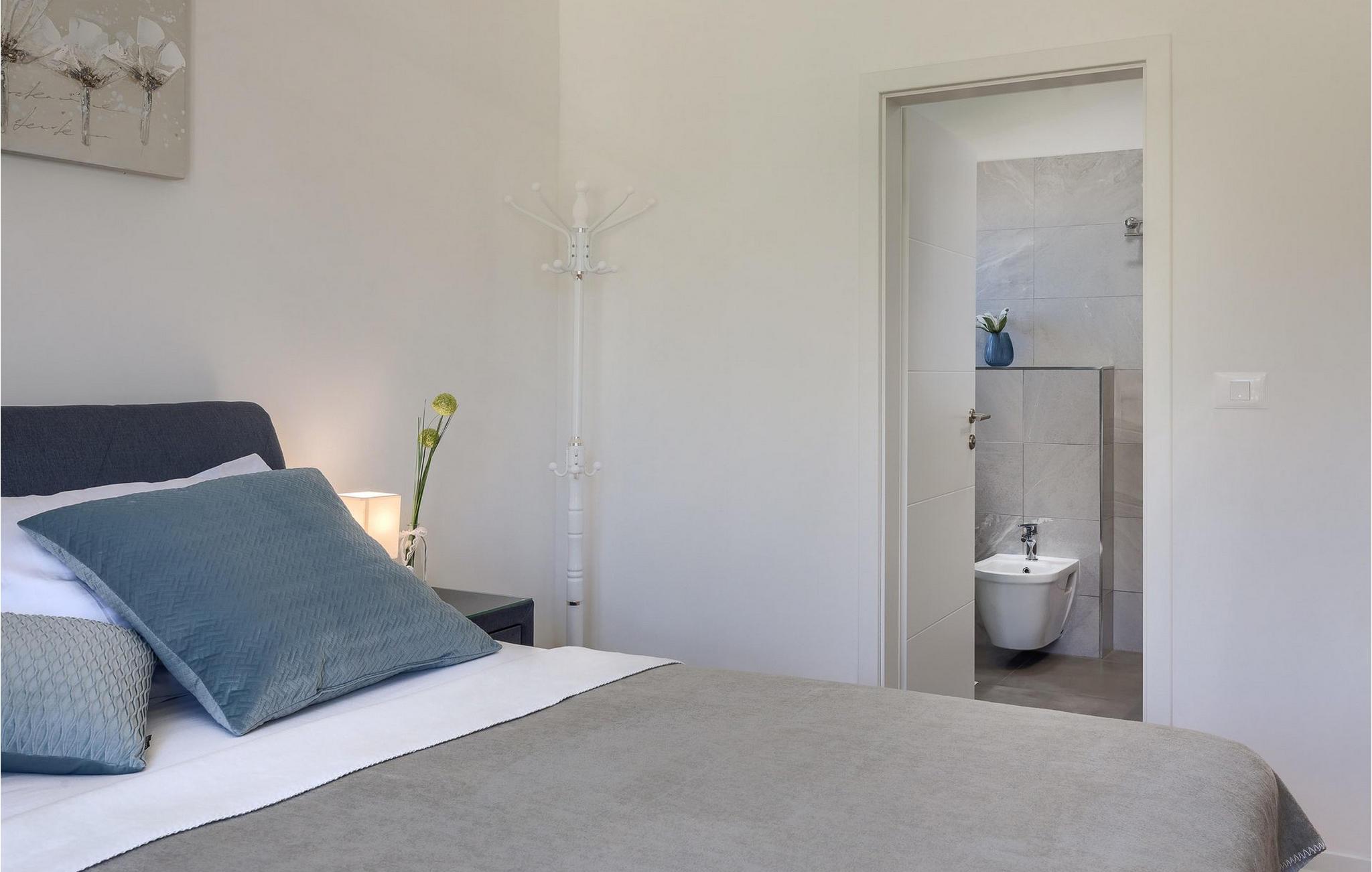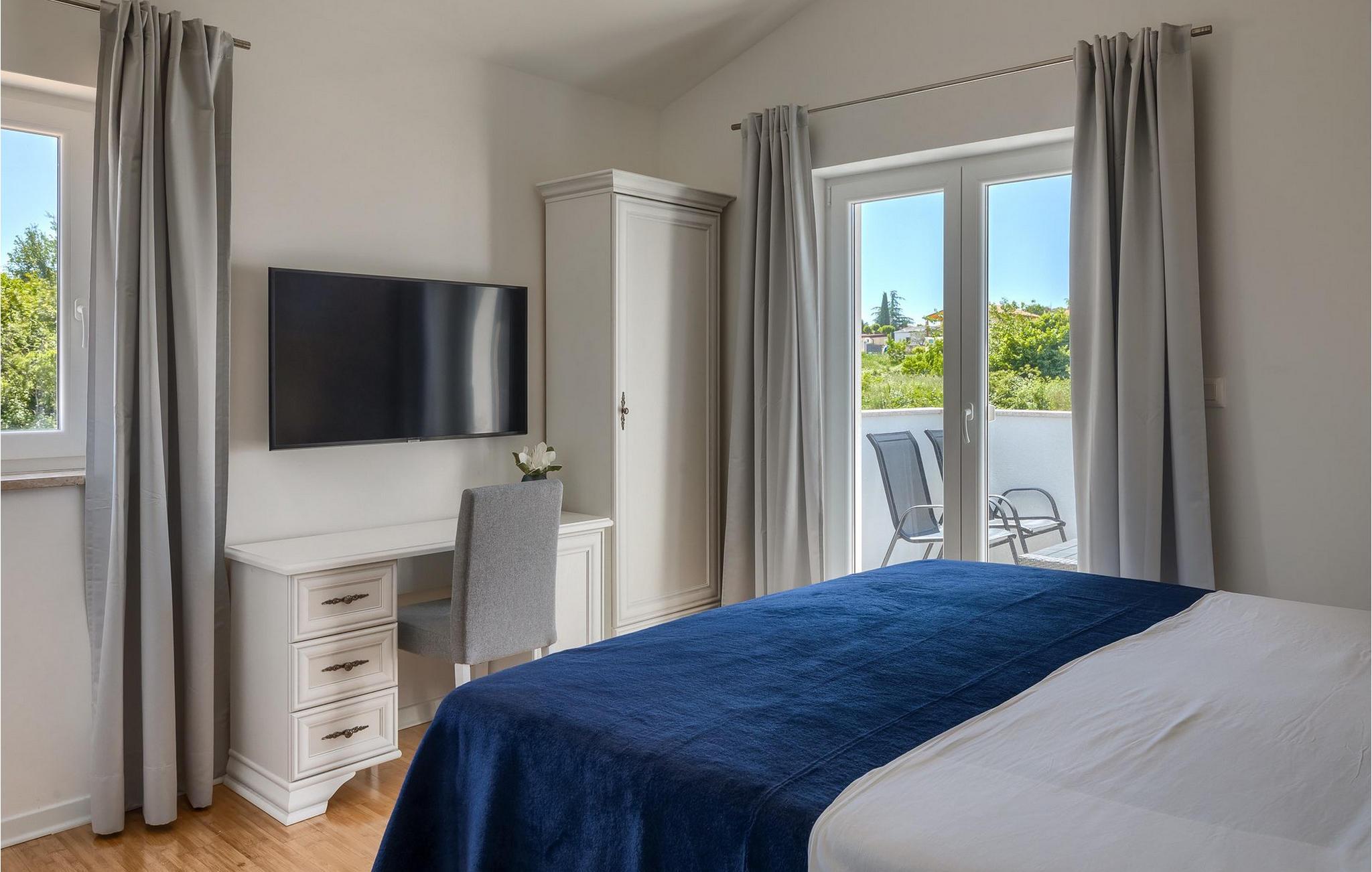Im Wohnzimmer finden Sie ein gemütliches graues Sofa, auf dem Sie sich entspannen oder einen Filmabend mit Familie oder Freunden verbringen können. Die Terrassentür im Wohnzimmer bietet einen atemberaubenden Blick auf den Pool und die wunderschöne Landschaft. Im ersten Stock befinden sich 2 Schlafzimmer mit en-suite Badezimmern. Beide Schlafzimmer haben Zugang zum Balkon. Im Außenbereich der Villa auf der Terrasse befindet sich ein Tisch mit 8 Stühlen, an dem Sie eine köstliche Mahlzeit servieren können, die auf dem verfügbaren Holzkohlegrill zubereitet wurde. Es gibt auch Gartenmöbel, in denen Sie nach einem langen Tag voller Freude bei einem kalten Getränk entspannen können. Erfrischen Sie sich im Pool vor der Terrasse oder entspannen Sie auf den Sonnenliegen. Sonnenbaden auf den Sonnenliegen rundet Ihren Tag ab. Die Villa Camelia ist ideal für einen schönen Urlaub mit Familie oder Freunden und wird Sie mit ihrer schönen mediterranen Umgebung begeistern.Die Villa Camelia befindet sich unweit von Novigrad in der kleinen Stadt Tar. Tar ist bekannt für seinen Olivenanbau und Fischfang sowie für die gastfreundlichen Gastgeber. Das Zentrum der kleinen Stadt bewahrt den traditionellen istrischen Geist in vielen Steinhäusern und Tavernen, in denen Sie die besten istrischen Spezialitäten probieren können, darunter Olivenöl, Meeresfrüchte, Trüffel und köstliche Desserts. Die Halbinsel Lanterna ist ein ideales Ziel für alle Liebhaber von Sonne und Meer. Am Strand können Sie viele sportliche Aktivitäten ausüben oder in einem der Cafés mit Blick auf Novigrad entspannen. Naturliebhaber sollten es sich nicht entgehen lassen, an die Mündung des Flusses Mirna zu gehen. Der Fluss Mirna ist der längste Fluss Istriens und erstreckt sich entlang des Motovun-Waldes, der ein beliebtes Ziel für alle Trüffelfans ist. Der Fluss Mirna ist ein geschätztes und bekanntes ornithologisches Reservat. Entlang des Flusses gibt es kleine Städte wie Motovun, Grožnjan und Oprtalj, die unbedingt erkundet werden sollten.