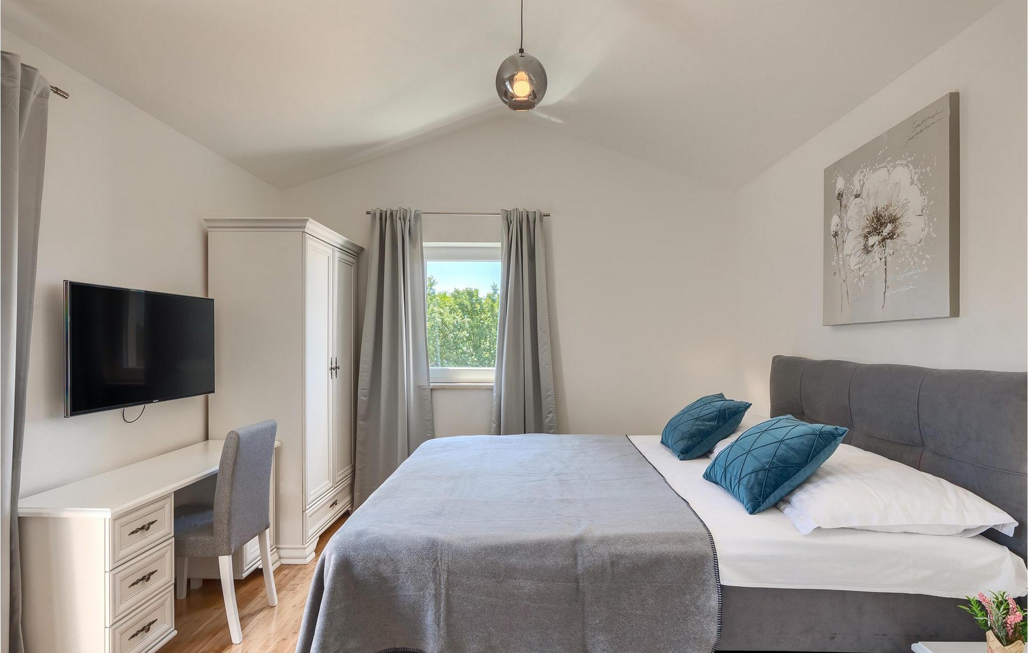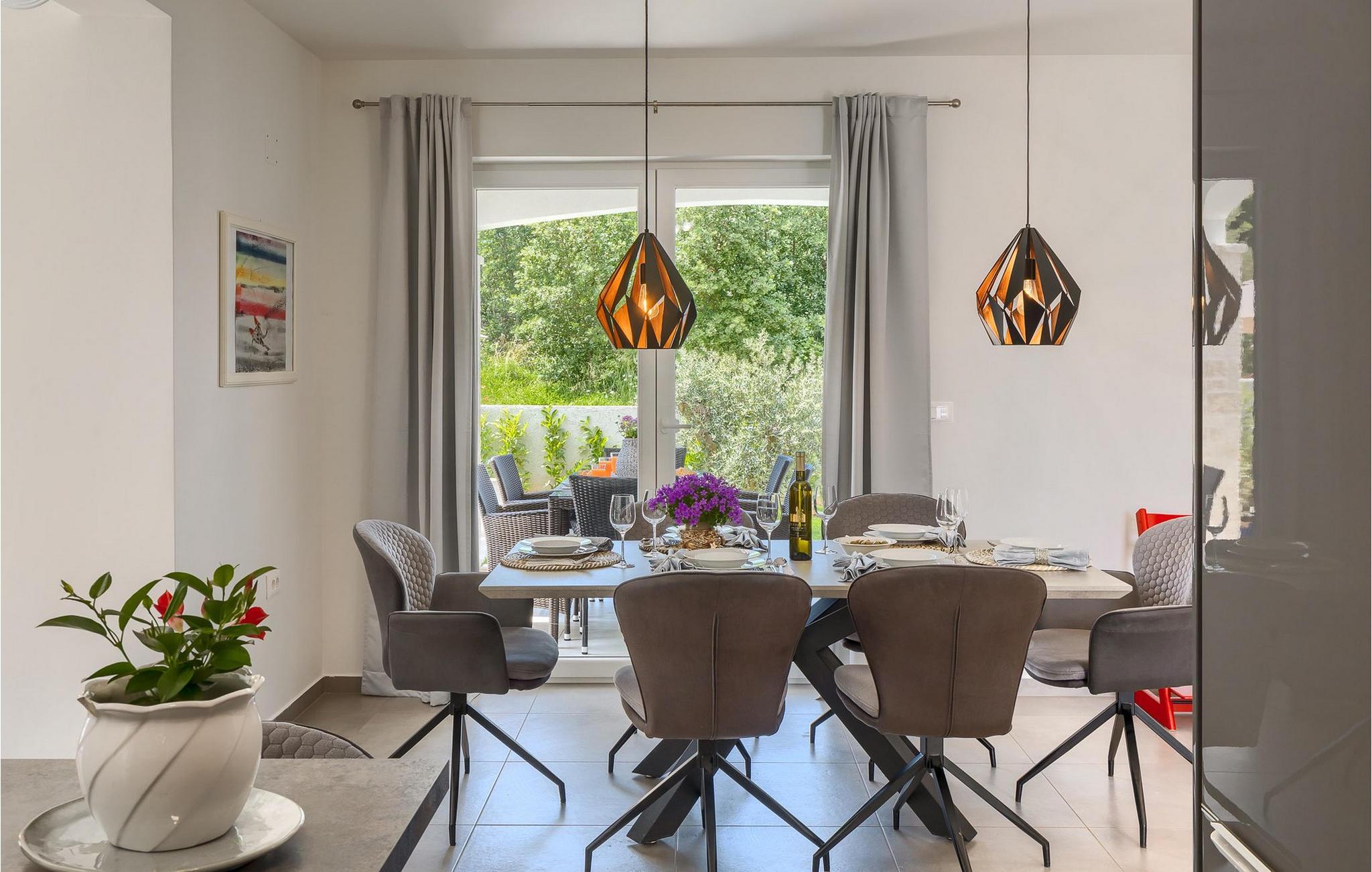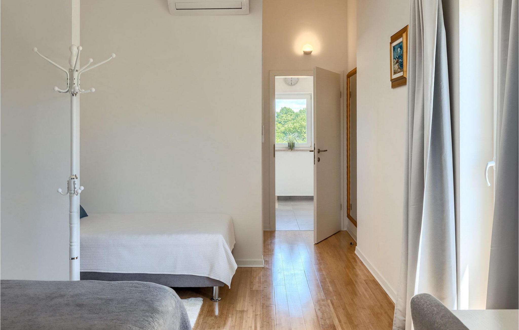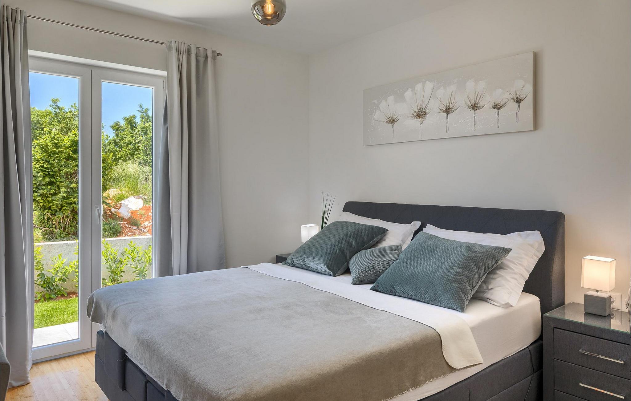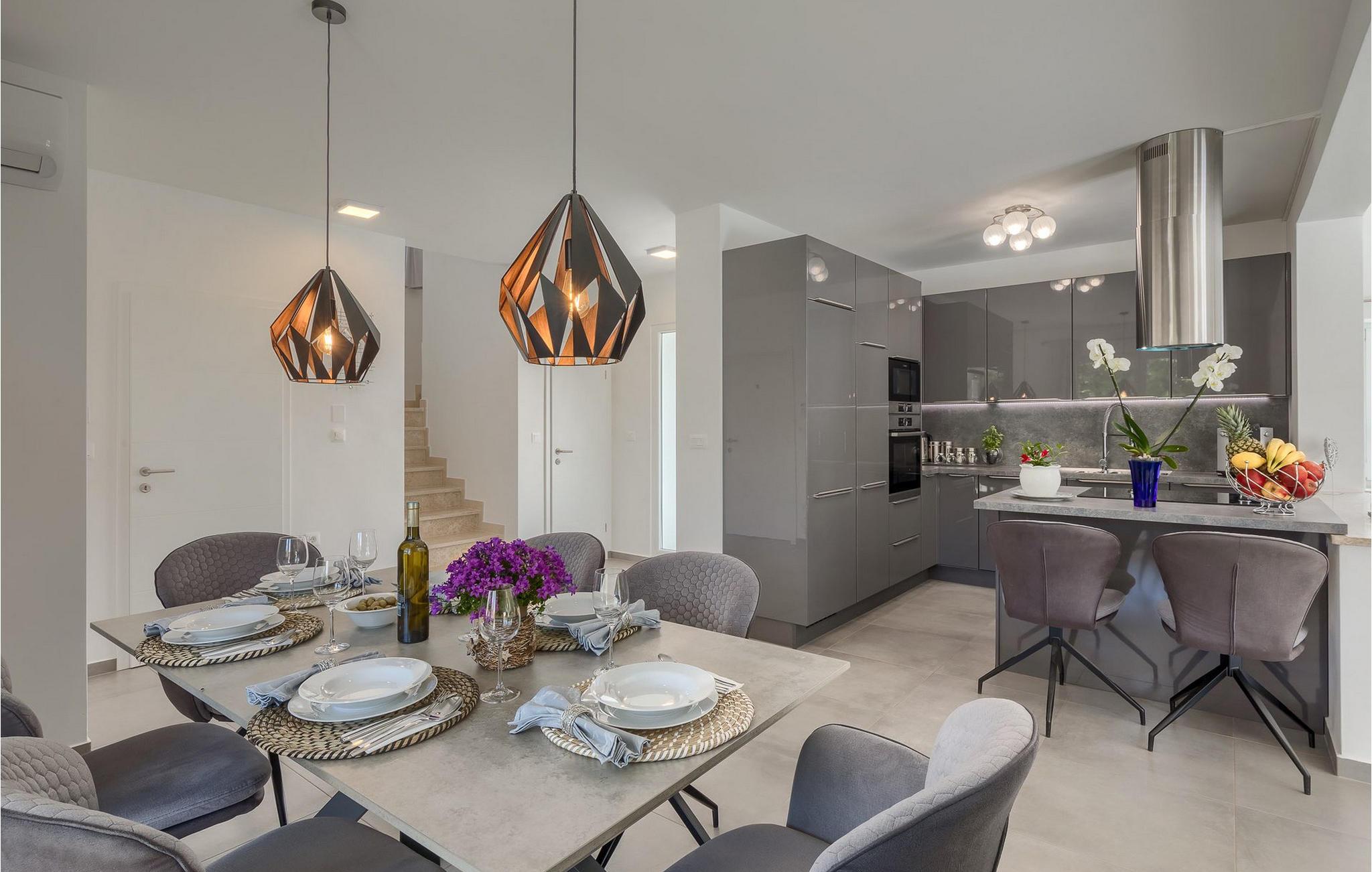 Im Wohnzimmer finden Sie ein gemütliches graues Sofa, auf dem Sie sich entspannen oder einen Filmabend mit Familie oder Freunden verbringen können. Die Terrassentür im Wohnzimmer bietet einen atemberaubenden Blick auf den Pool und die wunderschöne Landschaft. Im ersten Stock befinden sich 2 Schlafzimmer mit en-suite Badezimmern. Beide Schlafzimmer haben Zugang zum Balkon. Im Außenbereich der Villa auf der Terrasse befindet sich ein Tisch mit 8 Stühlen, an dem Sie eine köstliche Mahlzeit servieren können, die auf dem verfügbaren Holzkohlegrill zubereitet wurde. Es gibt auch Gartenmöbel, in denen Sie nach einem langen Tag voller Freude bei einem kalten Getränk entspannen können. Erfrischen Sie sich im Pool vor der Terrasse oder entspannen Sie auf den Sonnenliegen. Sonnenbaden auf den Sonnenliegen rundet Ihren Tag ab. Die Villa Camelia ist ideal für einen schönen Urlaub mit Familie oder Freunden und wird Sie mit ihrer schönen mediterranen Umgebung begeistern.Die Villa Camelia befindet sich unweit von Novigrad in der kleinen Stadt Tar. Tar ist bekannt für seinen Olivenanbau und Fischfang sowie für die gastfreundlichen Gastgeber. Das Zentrum der kleinen Stadt bewahrt den traditionellen istrischen Geist in vielen Steinhäusern und Tavernen, in denen Sie die besten istrischen Spezialitäten probieren können, darunter Olivenöl, Meeresfrüchte, Trüffel und köstliche Desserts. Die Halbinsel Lanterna ist ein ideales Ziel für alle Liebhaber von Sonne und Meer. Am Strand können Sie viele sportliche Aktivitäten ausüben oder in einem der Cafés mit Blick auf Novigrad entspannen. Naturliebhaber sollten es sich nicht entgehen lassen, an die Mündung des Flusses Mirna zu gehen. Der Fluss Mirna ist der längste Fluss Istriens und erstreckt sich entlang des Motovun-Waldes, der ein beliebtes Ziel für alle Trüffelfans ist. Der Fluss Mirna ist ein geschätztes und bekanntes ornithologisches Reservat. Entlang des Flusses gibt es kleine Städte wie Motovun, Grožnjan und Oprtalj, die unbedingt erkundet werden sollten.