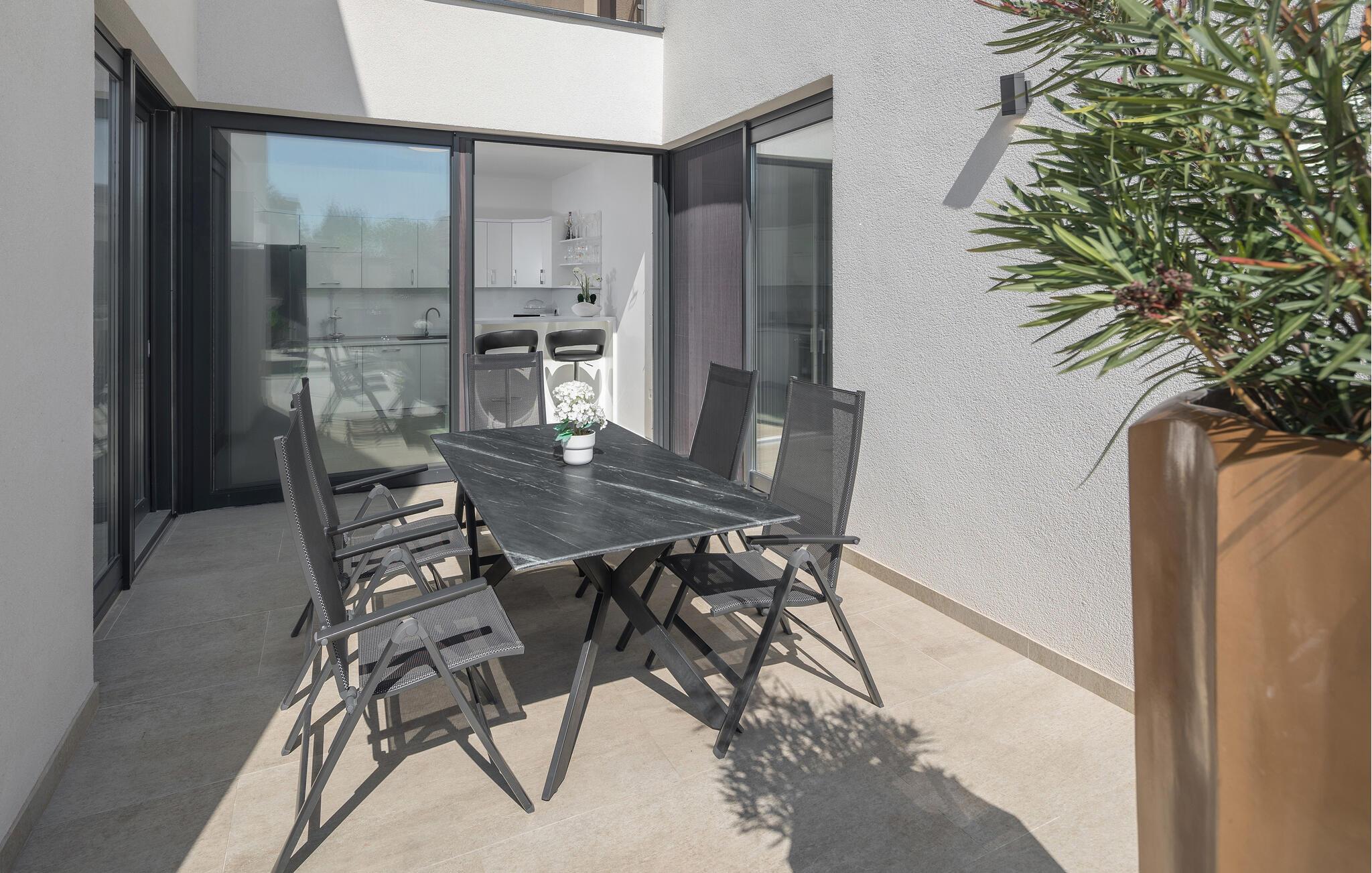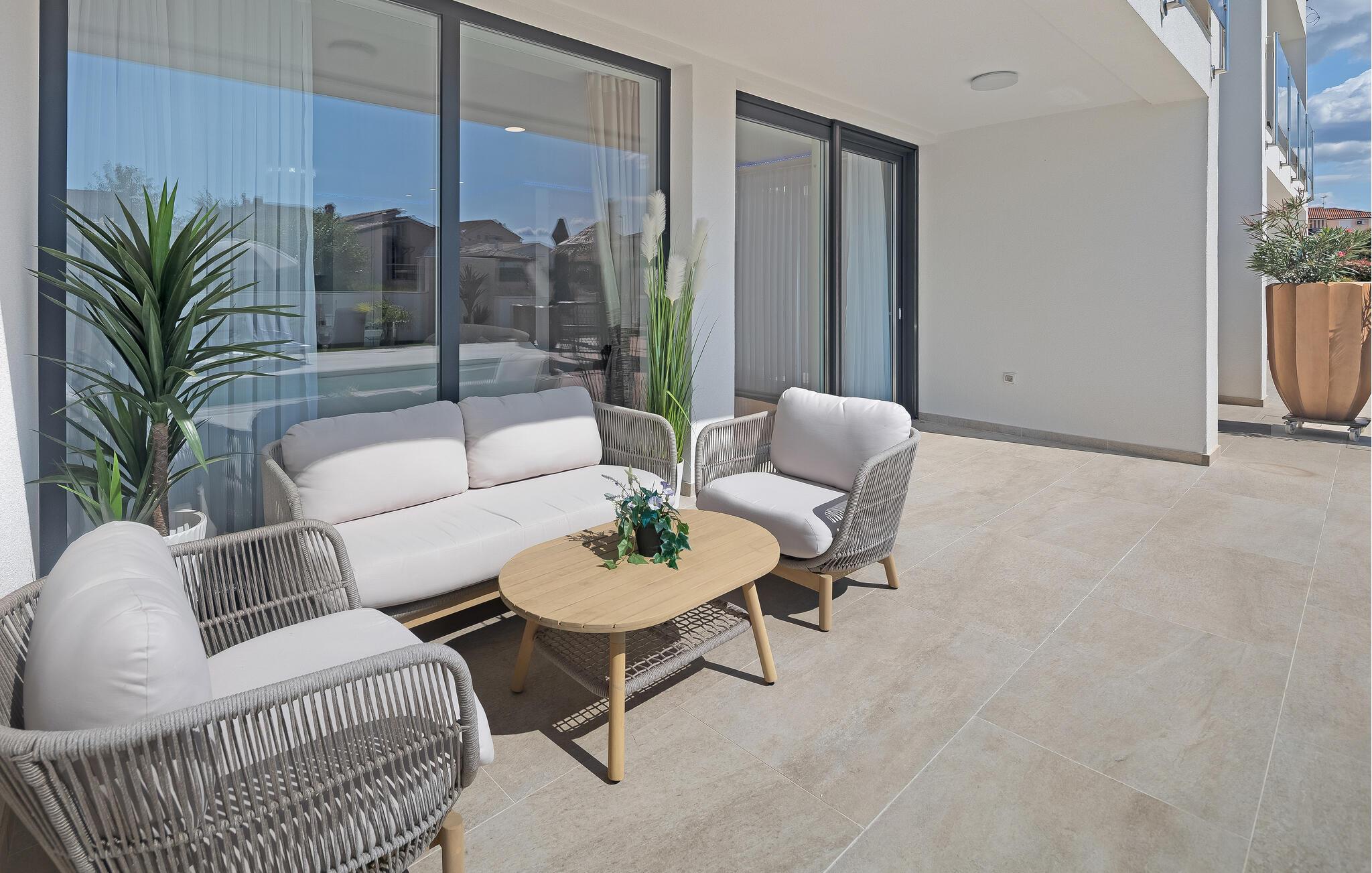 Genießen Sie Ihren Urlaub in diesem großzügigen, modernen Ferienhaus, das Ihnen und Ihrer Großfamilie viel Raum zum Entspannen bietet. Auf einem gemeinsamen Grundstück mit einem zweiten Haus gelegen, erwartet Sie ein geschmackvolles Ambiente mit weichen, einladenden Farben und hochwertiger Einrichtung. Ob auf der privaten Terrasse, dem Balkon oder der exklusiven Dachterrasse – überall laden gemütliche Rückzugsorte zum Ausruhen ein. Der gemeinsame Außenpool und die überdachte Terrasse mit Sonnenliegen sind der perfekte Ort für erholsame Stunden in der Sonne.
