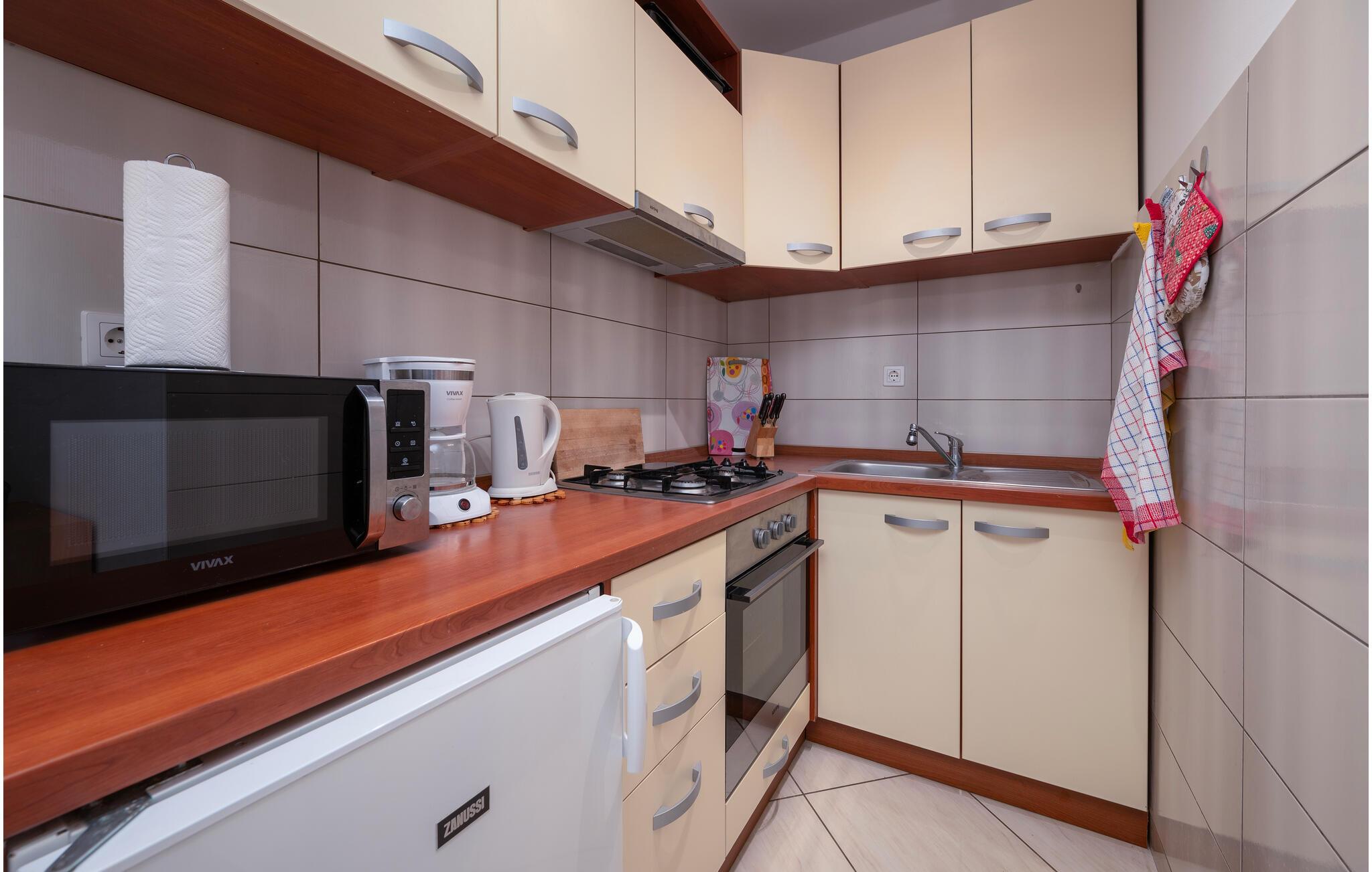 Diese gepflegte Ferienwohnung empfängt Sie mit einer warmen Atmosphäre und bietet Ihnen ein behagliches Refugium für eine sonnige Auszeit mit Ihren Liebsten. In der hellen Küche werden Sie sich sofort zurechtfinden, um Ihre Lieblingsgerichte zuzubereiten. Nehmen Sie am einladenden Esstisch Platz, veranstalten Sie lustige Spieleabende oder machen Sie es sich auf dem gemütlichen Sofa bequem.