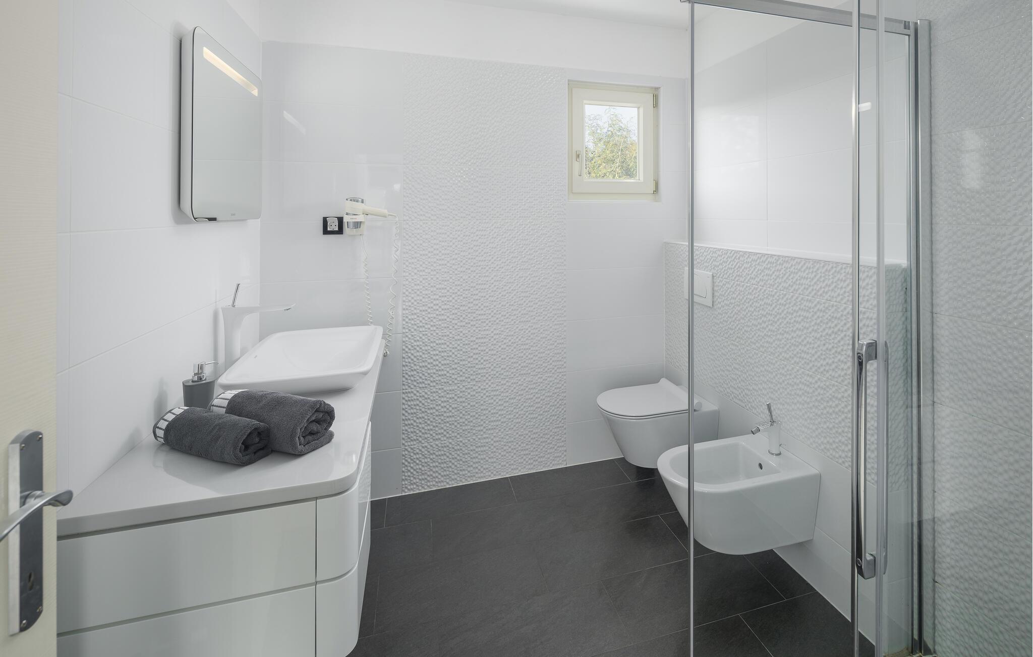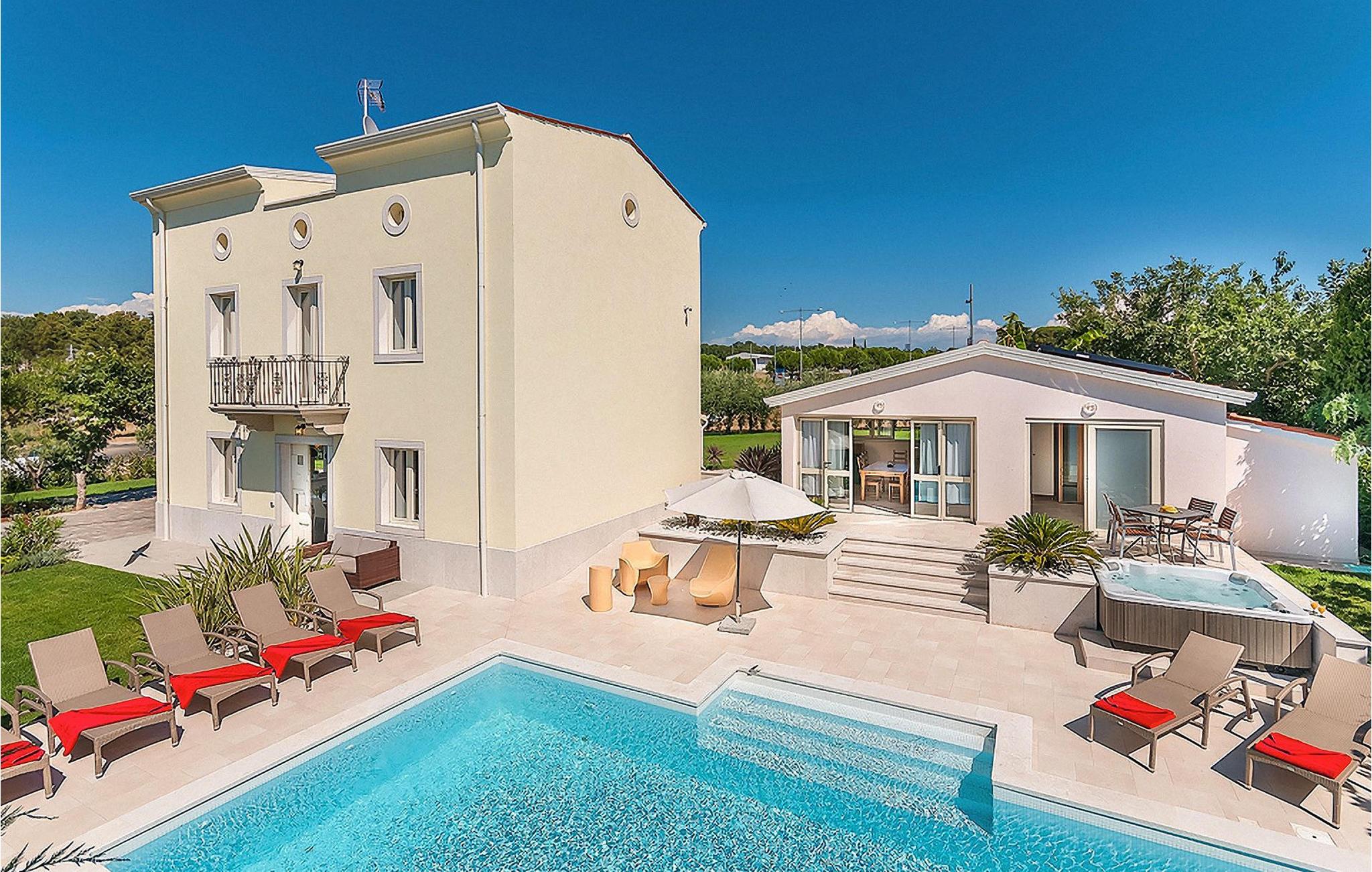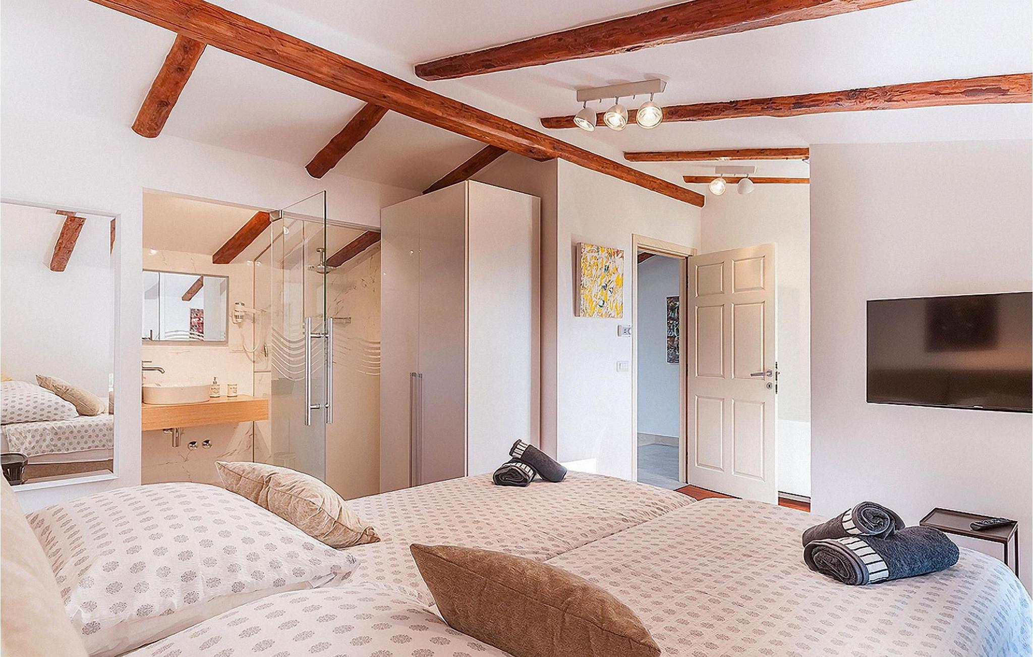 Die Villa Bruna liegt in der Stadt Porec, die für Ihr reiches Kulturerbe bekannt und ideal für einen entspannenden Urlaub ist. Diese Villa wurde in einer modernen Stillrichtung restauriert mit vielen handverlesenen Details und Möbelstücken, die für eine warme und einladende Atmosphäre sorgen. Das Anwesen besteht aus 3 Häusern und kann bis zu 10+2 Personen beherbergen. Das Haupthaus besteht aus 2 Etagen. Im Erdgeschoss finden Sie ein geräumiges Wohnzimmer, ein Esszimmer und eine komplett ausgestattete Küche. Die Schlafzimmer sind über 2 Etagen verteilt. Auf der ersten Etage befinden sich 2 Schlafzimmer mit jeweils einem Doppelbett und auf der zweiten Etage 2 Schlafzimmer mit jeweils 2 Einzelbetten, die zum Doppelbett zusammengeschoben werden können.